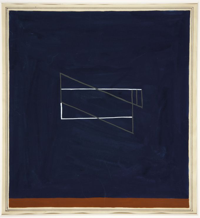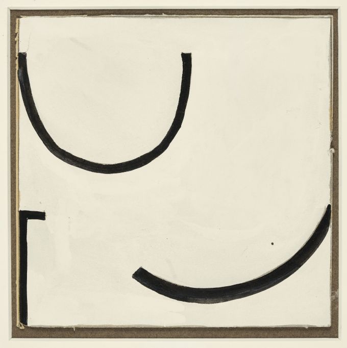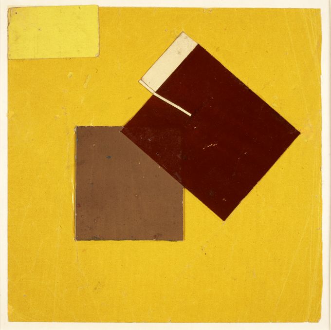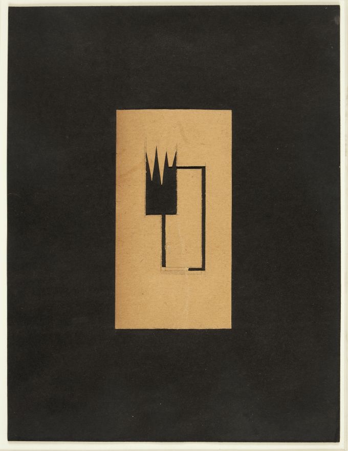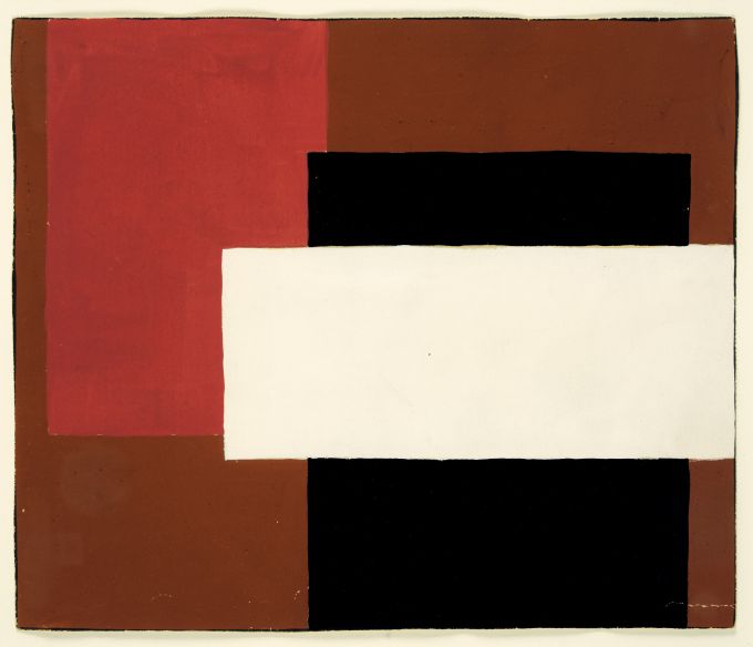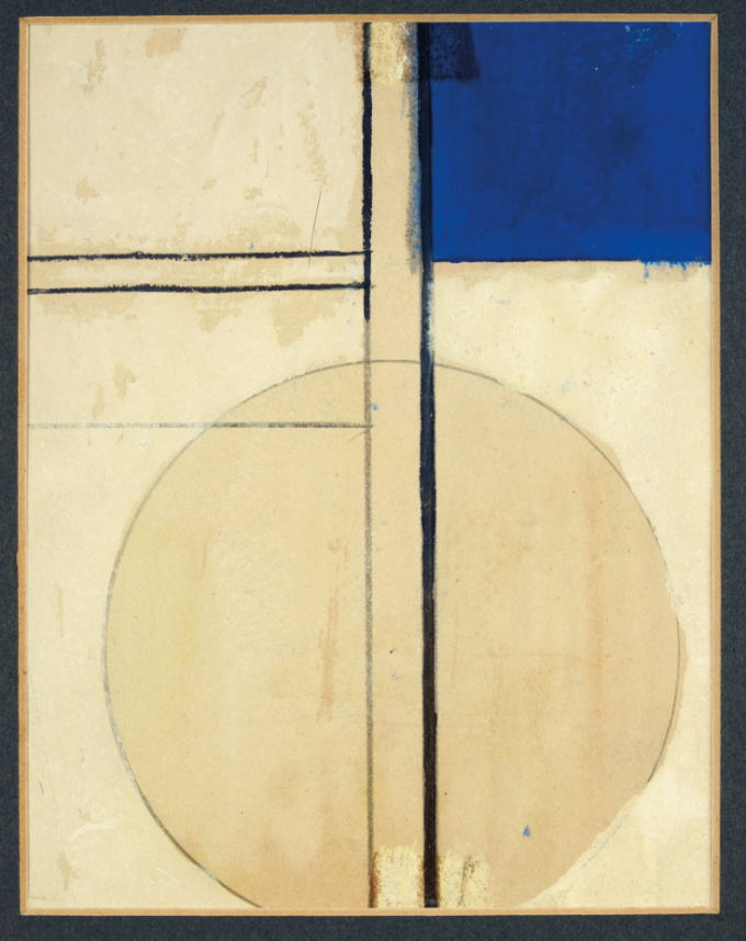 Außer solchen Gouachen fertigte Eileen Gray Collagen. Mit dieser Technik ließen sich einzelne geometrische Elemente wie Viereck oder Kreis verschieben, um Gestaltungsvarianten zu testen.