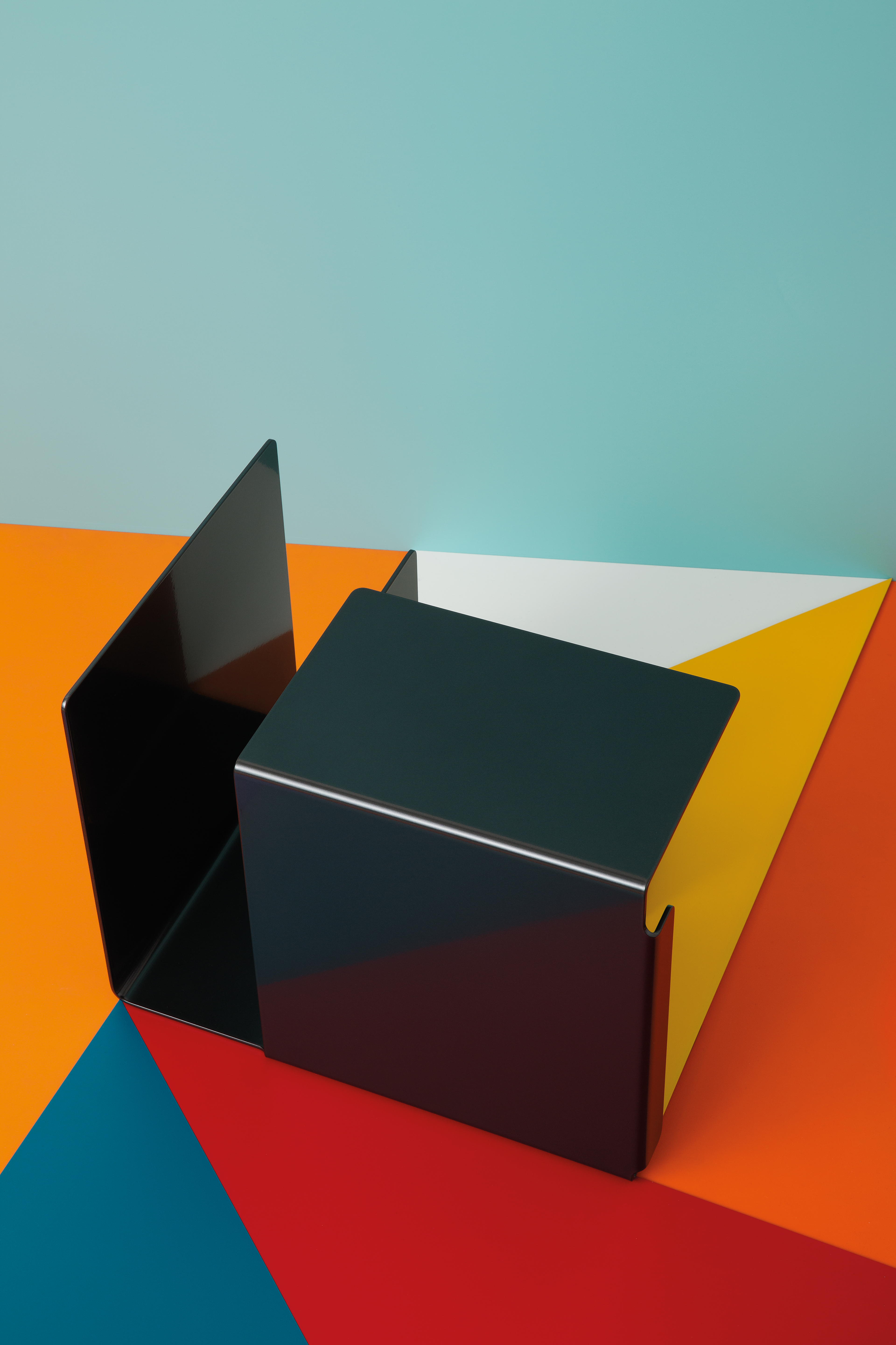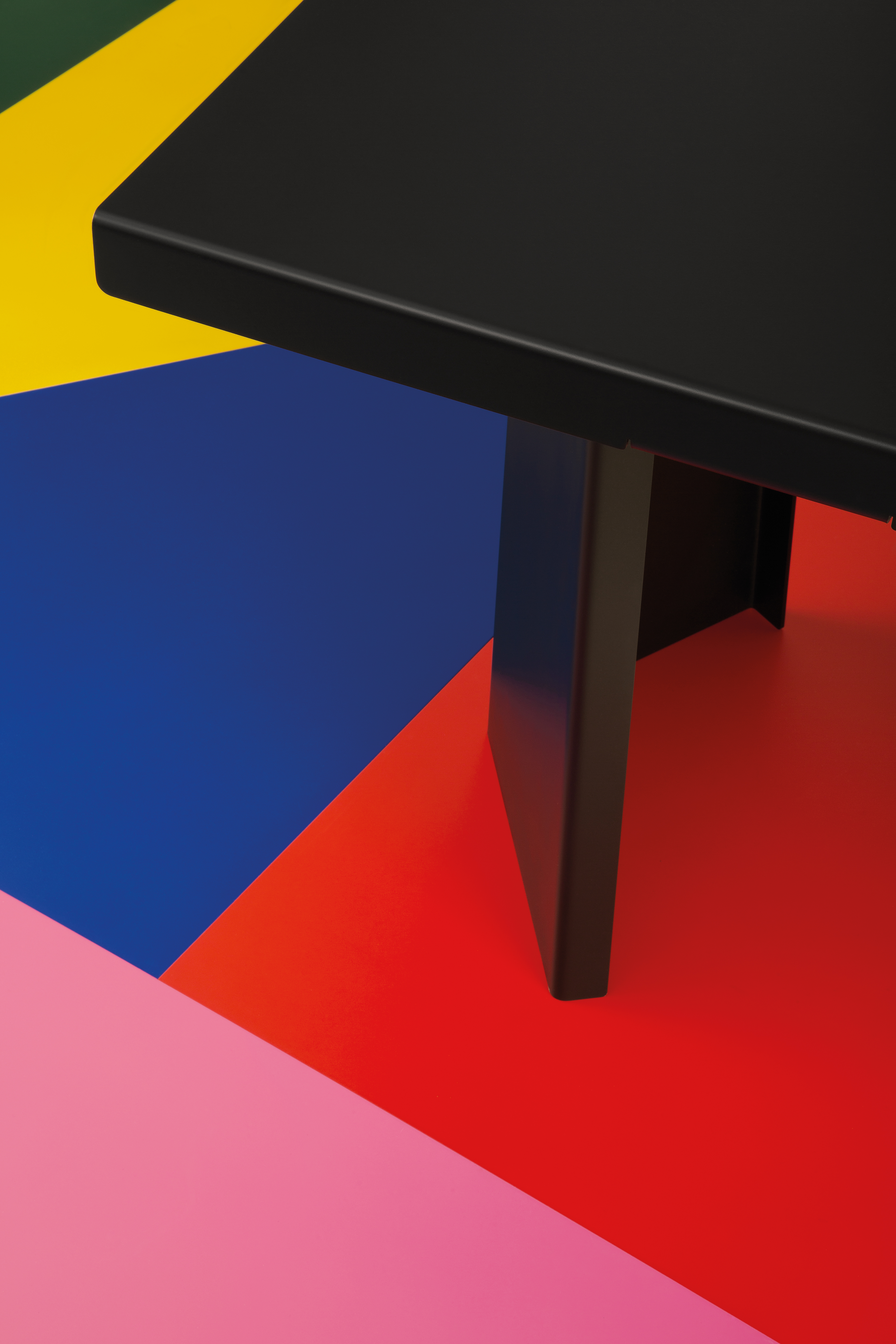 As is the case with her own work, Shirana Shahbazi focuses on the suspension of reality, the clearly defined forms and the dimensions. Her photographs set against a black background capture the clear linearity of Grcic’s designs due to the incidence of light and change of perspectives resulting in a suspenseful interplay with the monochrome background. In contrast with the coloured elements, Shahbazi abstracts the three-dimensionality of the furniture into a shining composition that breaks down the individual forms of triangles, squares and angles into adjoining surfaces.