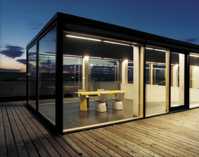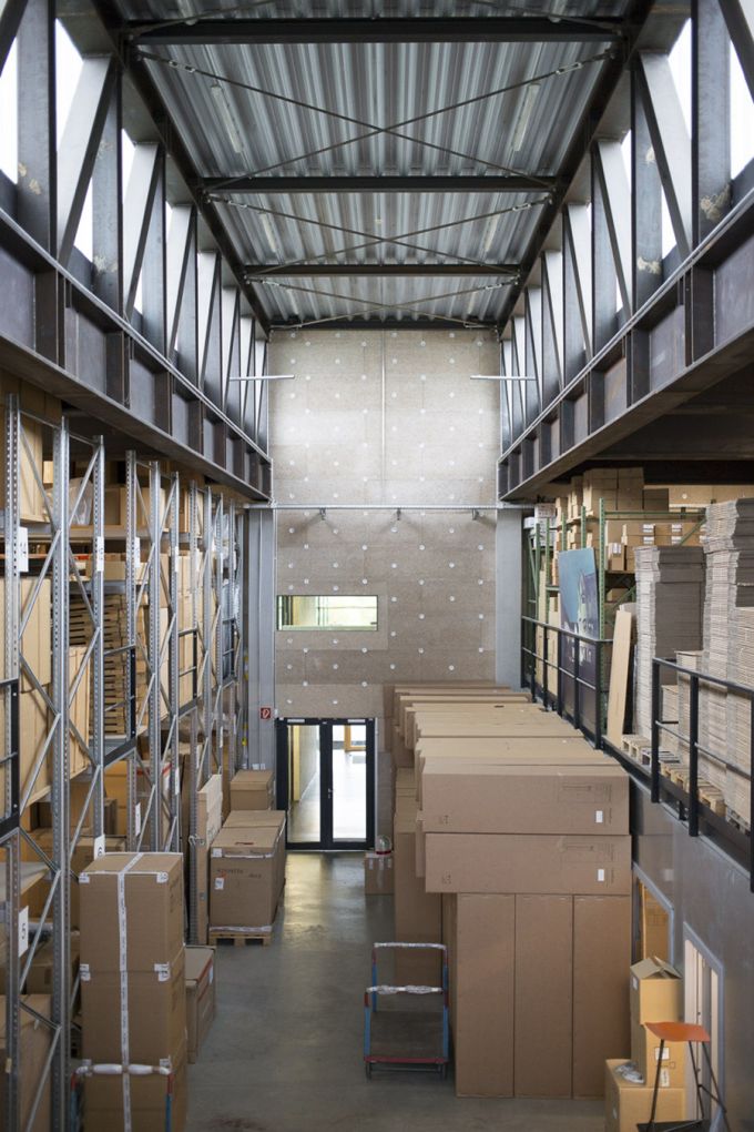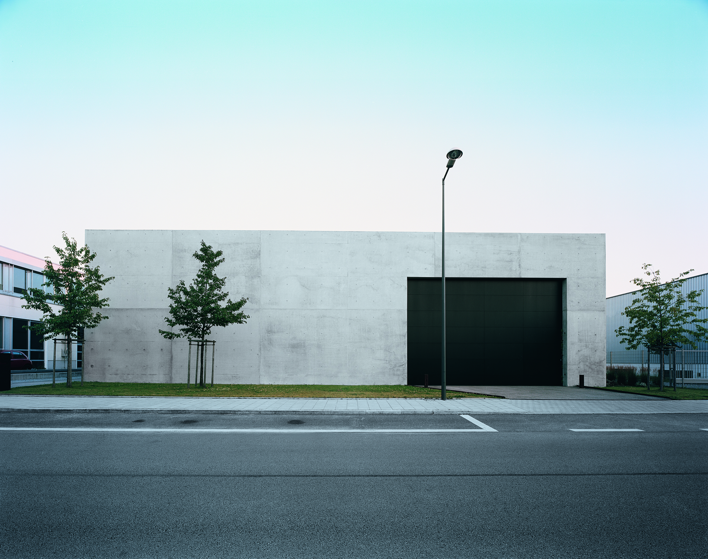 Wer durch das Gewerbegebiet direkt hinter der Messe von München- Riem fährt und sieht, dass sich die meisten Bauten mehr oder weniger gesichtslos aneinander reihen, Stile und Fassaden sich reiben wie Zement und Steine in einer Mischmaschine, ist dankbar für dieses Projekt, das Eigenständigkeit entwickelt und aus sich heraus wirkt. Joachim Jürkes Architektur steht quer zum Gewerbegebiet Riem, quer zur gereihten Materialsammlung aus Stahl und Wellblech. Statt repräsentativer Fassade zur Straße nur Beton. Meterhoch. Das Firmengebäude von ClassiCon kehrt die gewohnte Aufteilung der Firmengebäude um. Hinten ist vorne und vorne hinten. Zuerst kommt die Anlieferung, dann folgt das Lager. Schließlich endet das Haus in einem neuen Anfang: der breiten Glasfront mit ihren Büros und dem Blick nach Süden, zum Landschaftspark und Richtung Alpen.