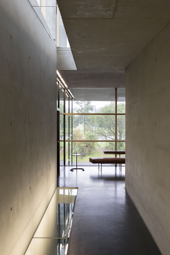 Puristisch wie das Day Bed von Eileen Gray steht das Haus da, klare Kanten, harter Rahmen, von innen nach außen gedacht und gebaut. Der Eingang liegt zurückversetzt zwischen zwei gläsernen Boxen. Beton und Glas, die Grundstoffe des Baus, stimmen ein auf die Sprache des Architektur, ihre raffinierte Einfachheit, ihren geschlossenen Materialkanon, ihre überraschenden Durch- und Einblicke in Räume und Etagen. All das breitet das Haus aus, bevor man einen Schritt hinein getan hat. Wohin?