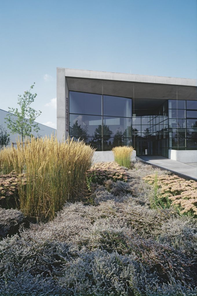 Kies knirscht, dann steht der Wagen. Hinter der Windschutzscheibe: Grün, Bäume, Sträucher, sanfte Hügel. Am Horizont, in der Ferne, die Alpen. Keine Urlaubsidylle sondern ein Gewerbegebiet – allerdings in Panoramalage am Nordrand des Landschaftsparks Riem. Und diese Lage machten sich die Bauherren und Architekten des ClassiCon zunutze: Die 30 Meter lange Schaufront öffnet sich wie das Sonnendeck eines Ausflugsdampfers auf dem Ammersee.