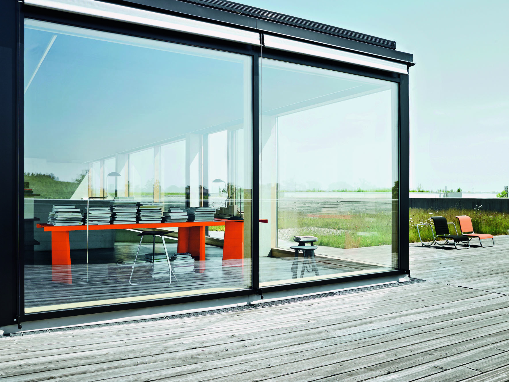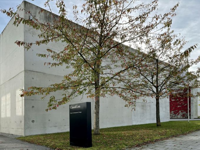 Transparente Schauräume liegen da, Büros und Besprechungszimmer. Darüber stehen siebzig Zentimeter Sichtbeton, ein Rahmen wie für ein gigantisches Gemälde. Er umgürtet die Verwaltung und dient im Sommer als Sonnenschutz, während die zurückversetzte Glasfront die Besucher förmlich ins Gebäude zieht. Der Eingang liegt zwischen zwei Glasboxen. Willkommen in der Welt des Designs.