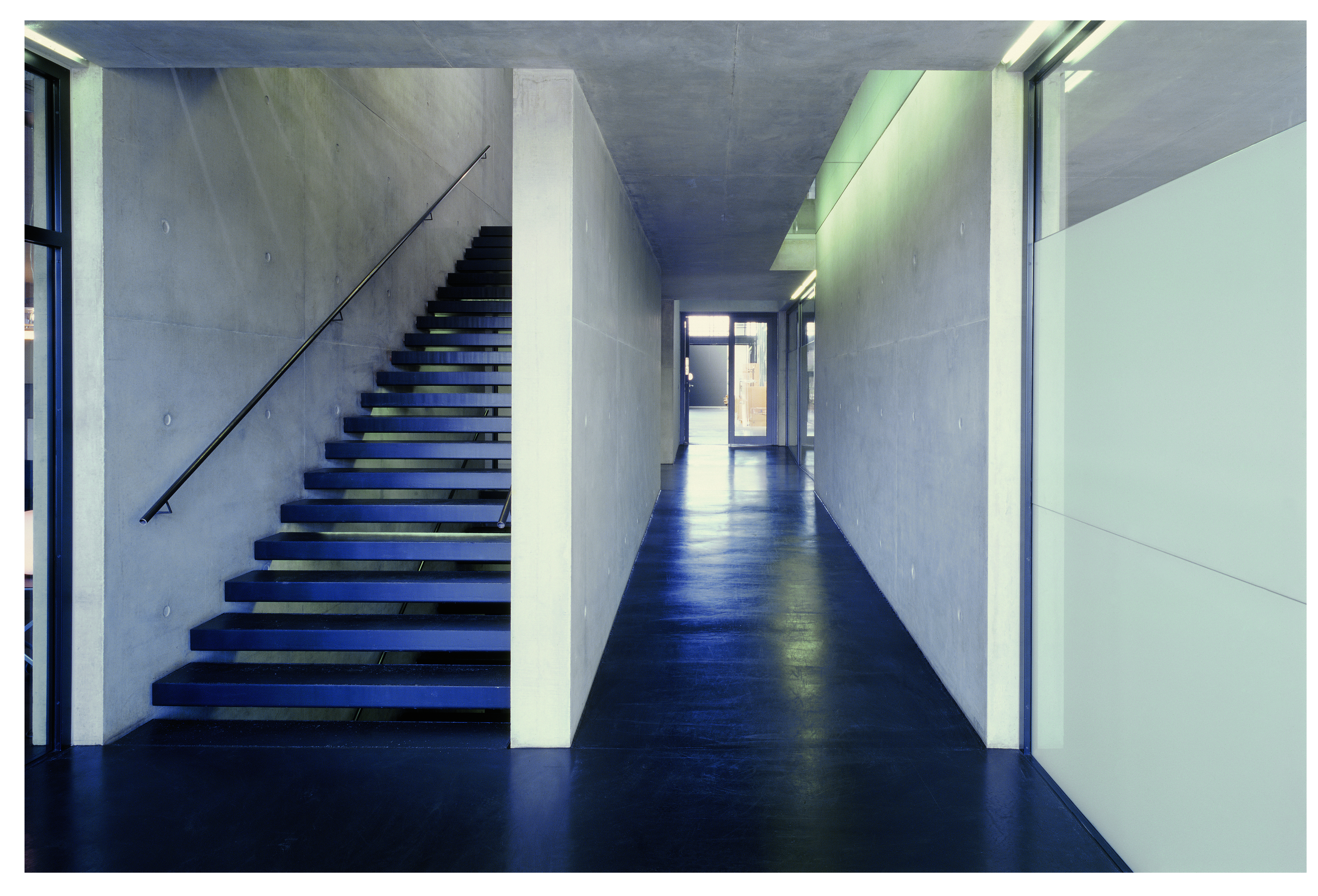 Links liegt der zweigeschossige Schauraum, lichtdurchflutet und einladend, geradeaus geht es zum Lager – und über die Treppe in die Büros. Beton an den Füßen und Gussasphalt auf den Treppenstufen, die frei in den nächsten Stock zu schweben scheinen. So einfach kann Bauen sein, wenn Architekt und Auftraggeber eine Sprache sprechen. Oliver Holy, Geschäftsführer von ClassiCon, wollte Beton, kompromisslos klare Ästhetik. Kein „vielleicht“ oder „könnte sein“, sondern ein gebautes Gegenstück zu den Designikonen von ClassiCon. Das Innenleben bietet genügend Platz, um das Haus wechselnden Bedürfnissen anzupassen. Die Verwaltung besteht nicht etwa aus einem langen Gang mit Zellenbüros, graue Paneele, am Ende das Vorzimmer der Geschäftsführung, sondern der Besucher steht mitten in einem Großraumbüro, das sich nach Osten und Süden zur Landschaft fast verschwenderisch mit Glas öffnet.