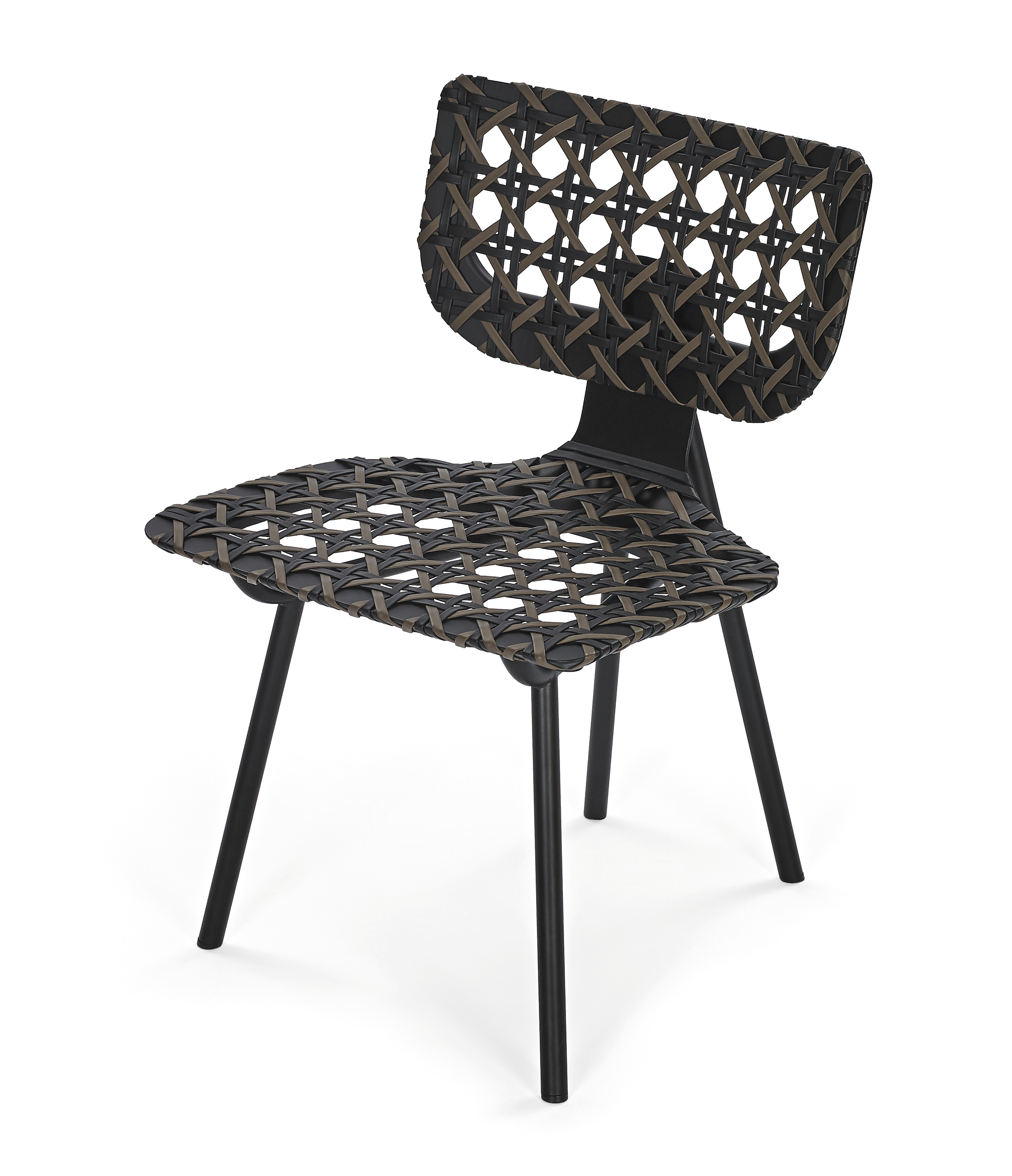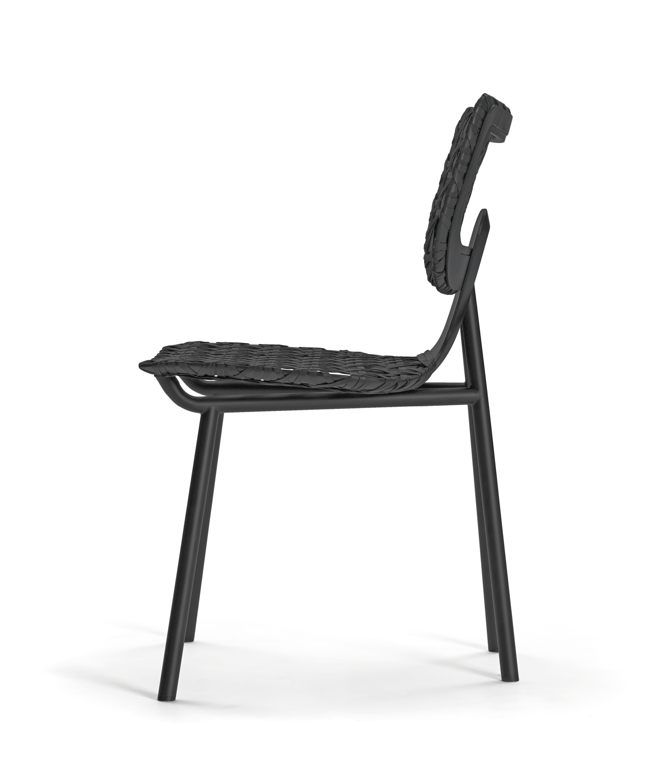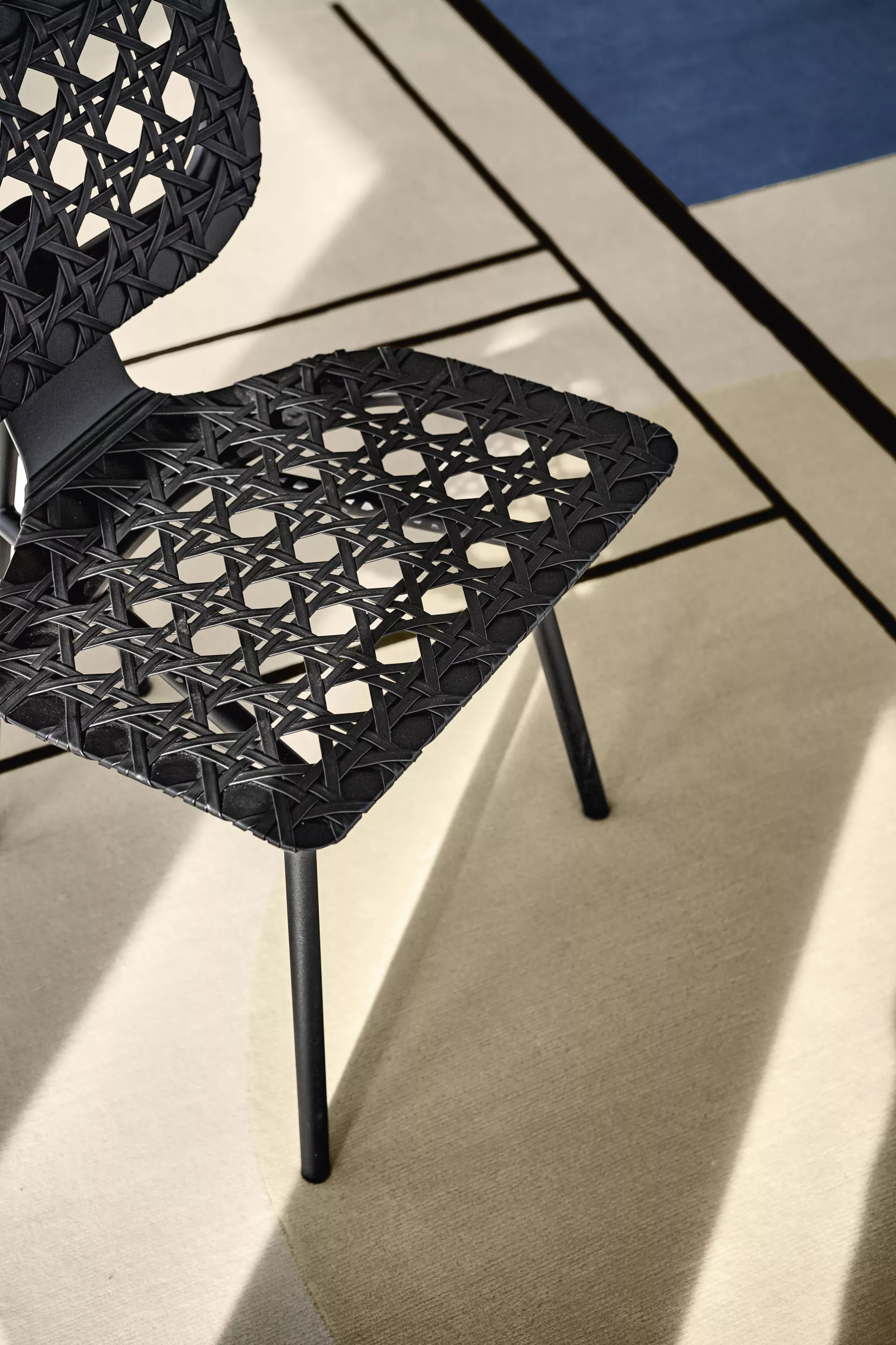 Aërias überrascht mit formaler Prägnanz, Leichtigkeit und neuartigem Flechtwerk: Das vertraute Muster des Wiener Geflechts wird mit einem veränderten Maßstab und Leder als Flechtmaterial neu interpretiert. Und so wie sich die Anmutung einer Schrift mit ihrer Größe verändert, gewinnt auch das traditionelle Flechtmuster beim Aërias durch die vielfache Vergrößerung an Charakter. Der große Sitzkomfort ergibt sich durch das Spannen von Lederbändern über einen Holzrahmen. Vergleichbar mit einer Trommelbespannung entstehen gefederte Minimalflächen, die die Bewegungen des Körpers aufnehmen und das Sitzen und Anlehnen besonders angenehm machen.