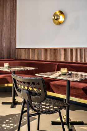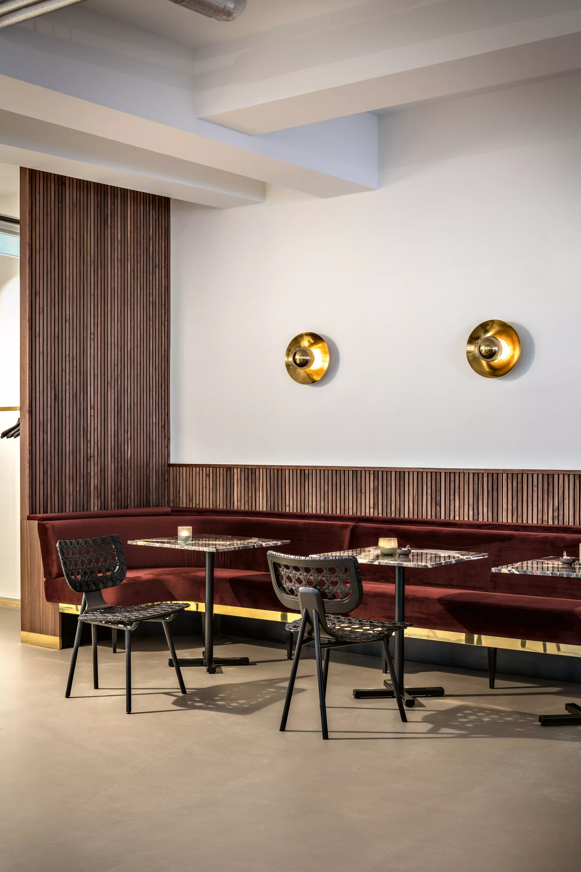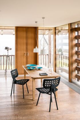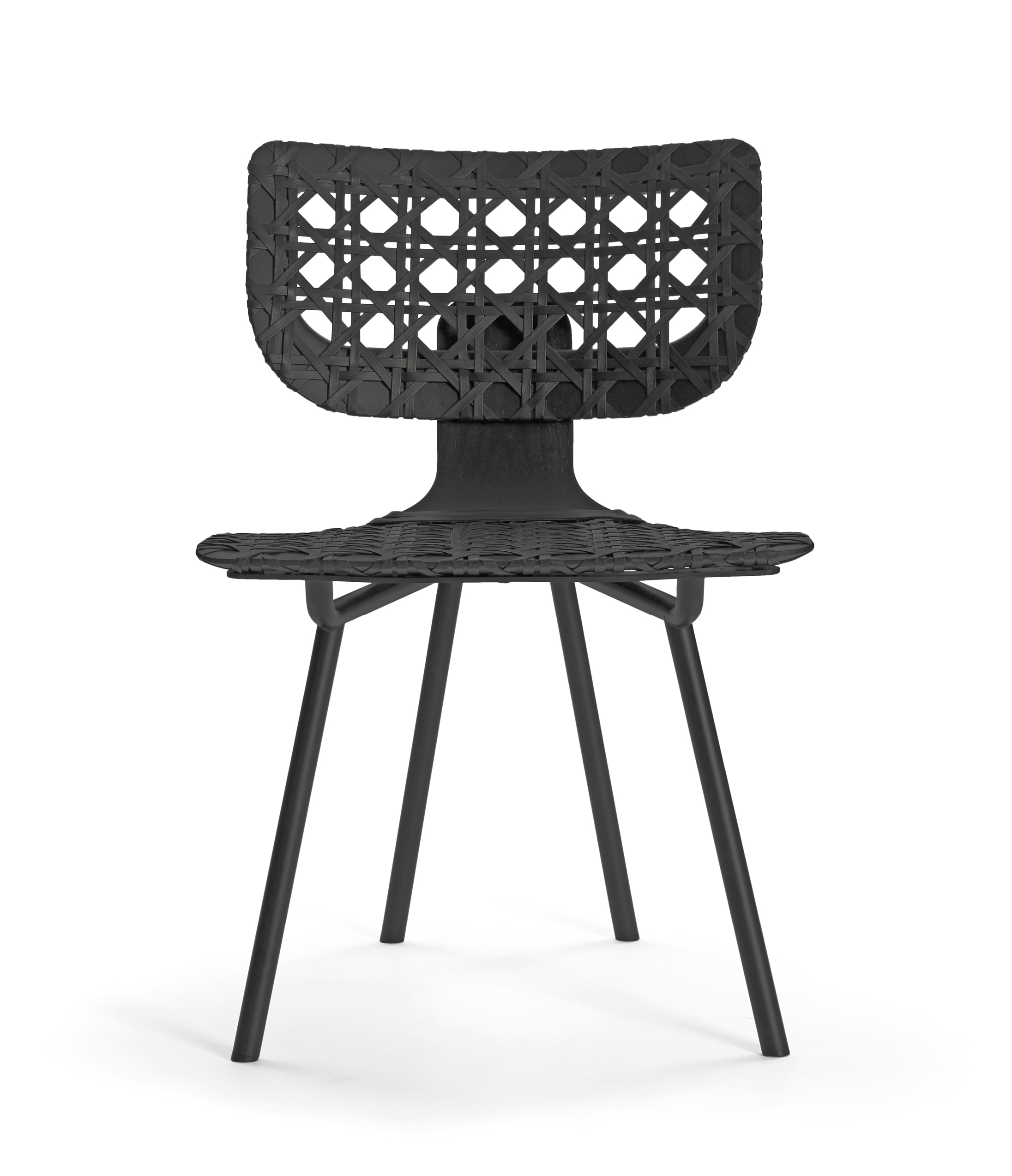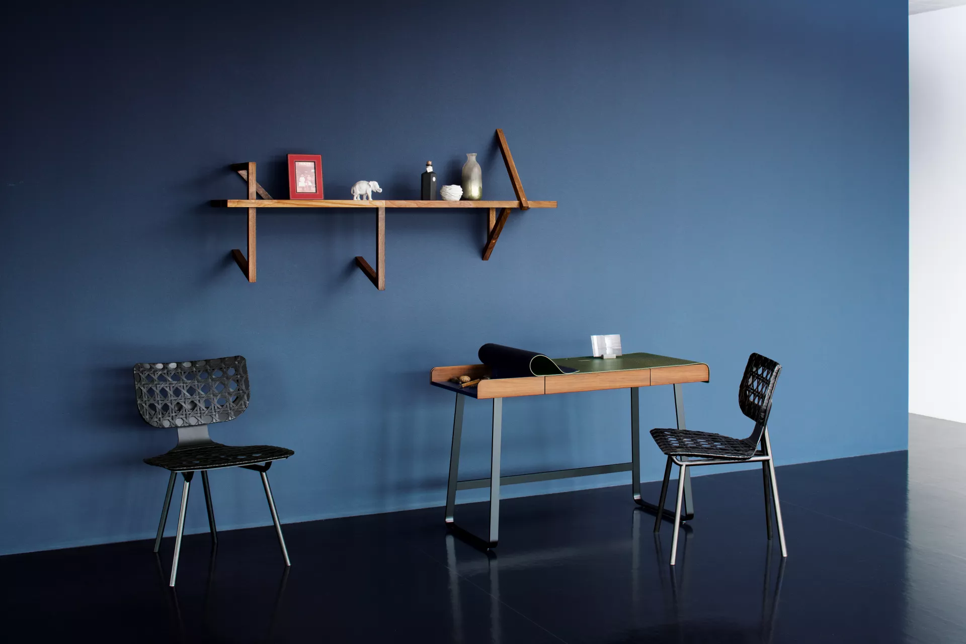 Aërias überrascht mit formaler Prägnanz, Leichtigkeit und neuartigem Flechtwerk: Das vertraute Muster des Wiener Geflechts wird mit einem veränderten Maßstab und Leder als Flechtmaterial neu interpretiert. Und so wie sich die Anmutung einer Schrift mit ihrer Größe verändert, gewinnt auch das traditionelle Flechtmuster beim Aërias durch die vielfache Vergrößerung an Charakter. Der große Sitzkomfort ergibt sich durch das Spannen von Lederbändern über einen Holzrahmen. Vergleichbar mit einer Trommelbespannung entstehen gefederte Minimalflächen, die die Bewegungen des Körpers aufnehmen und das Sitzen und Anlehnen besonders angenehm machen.