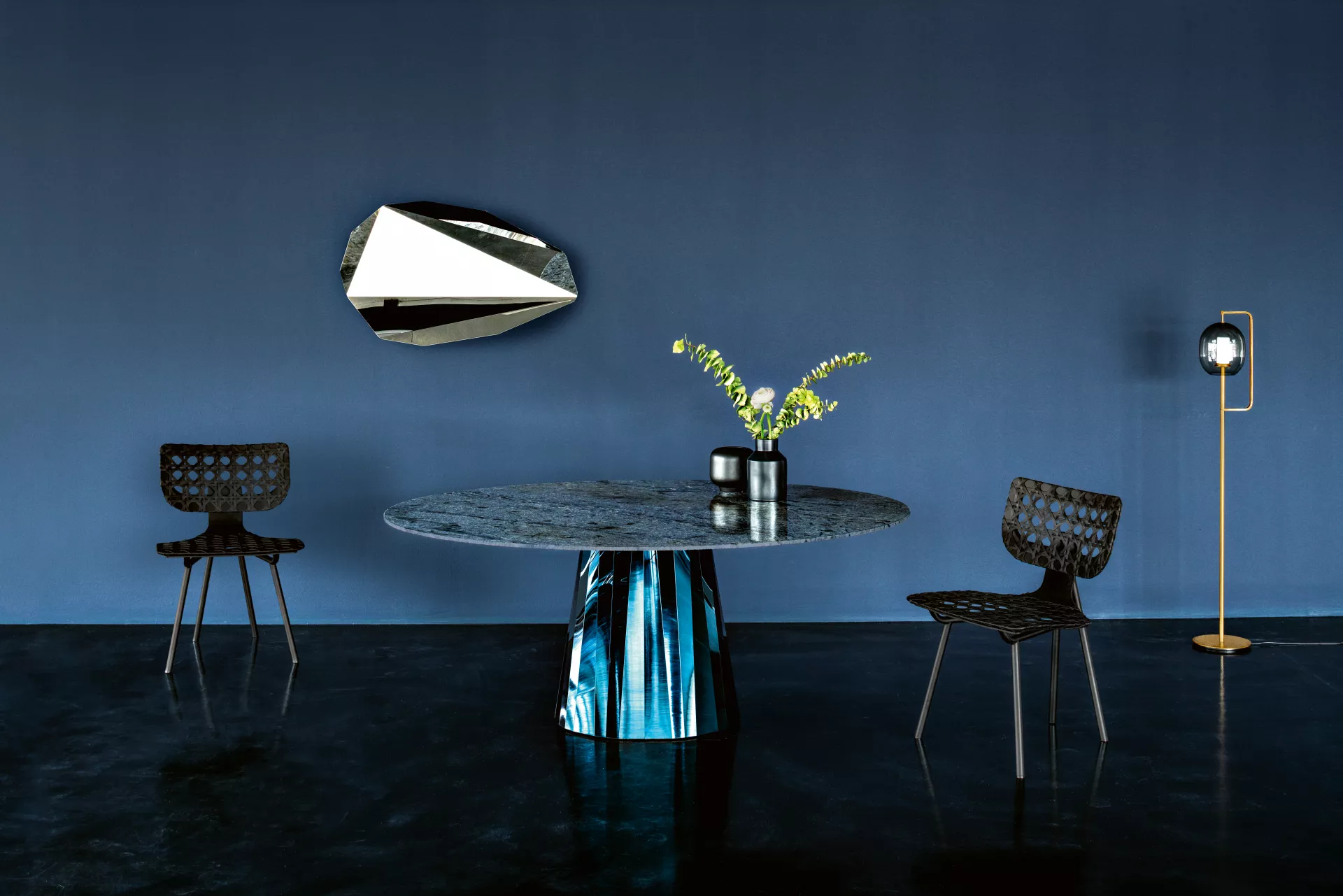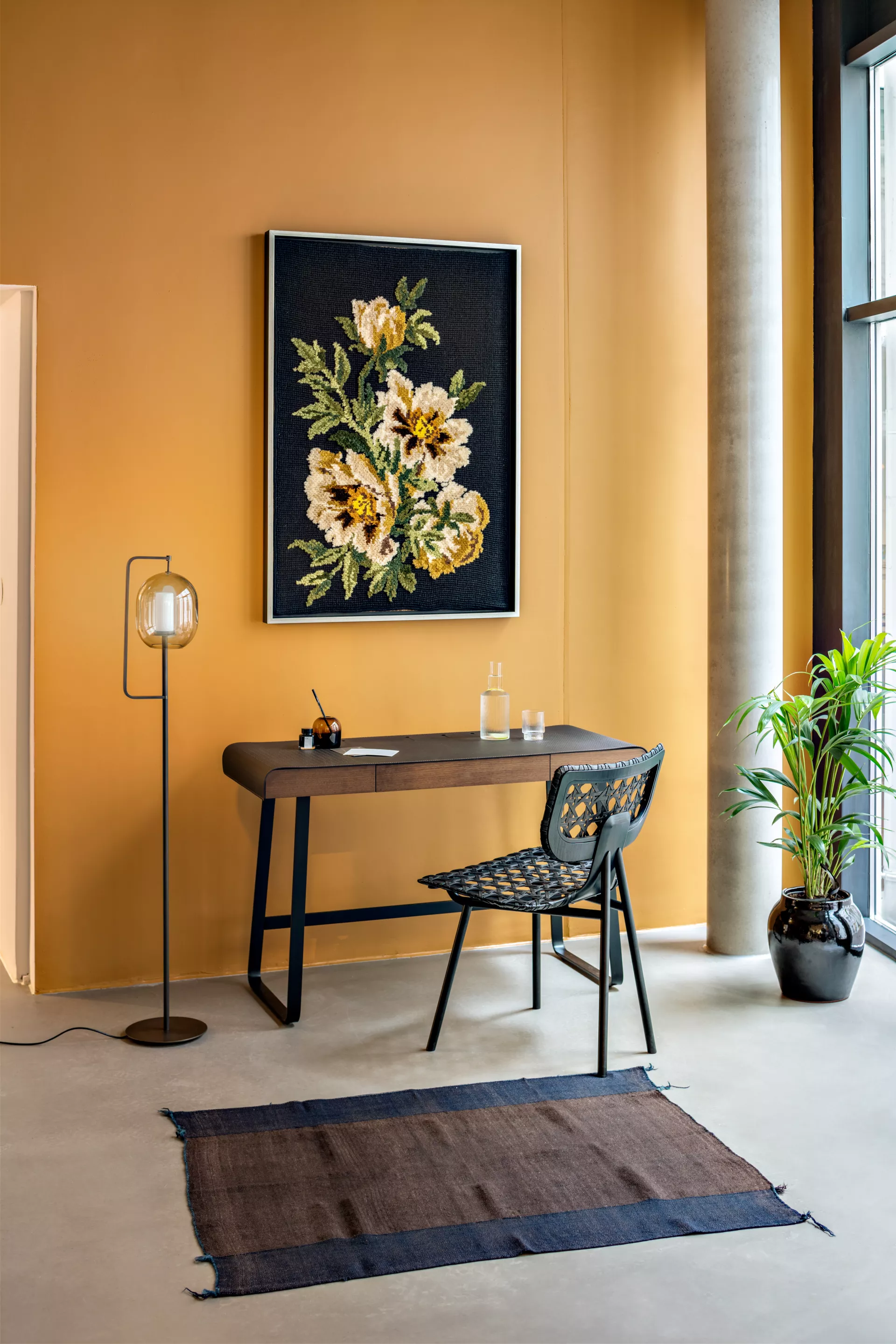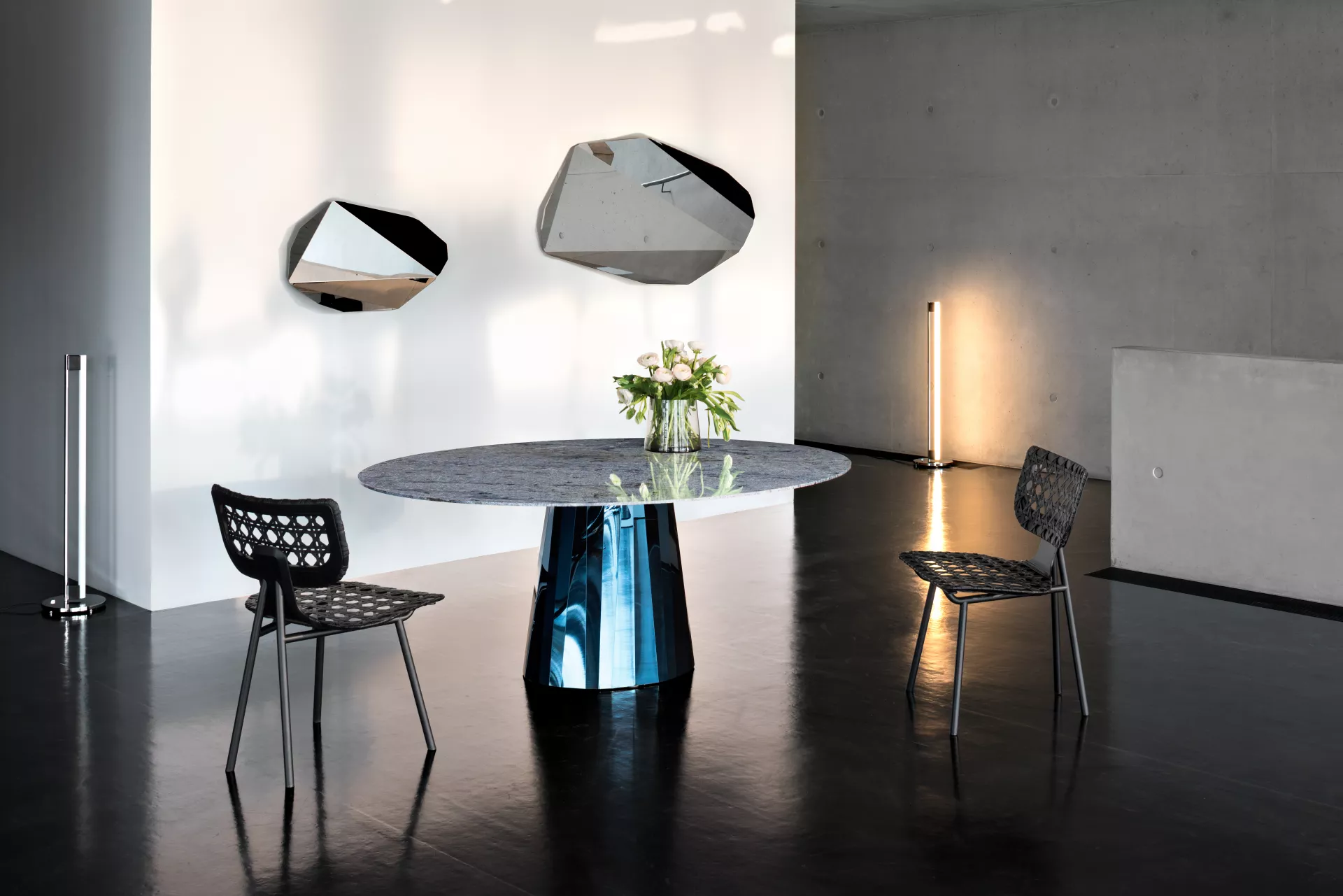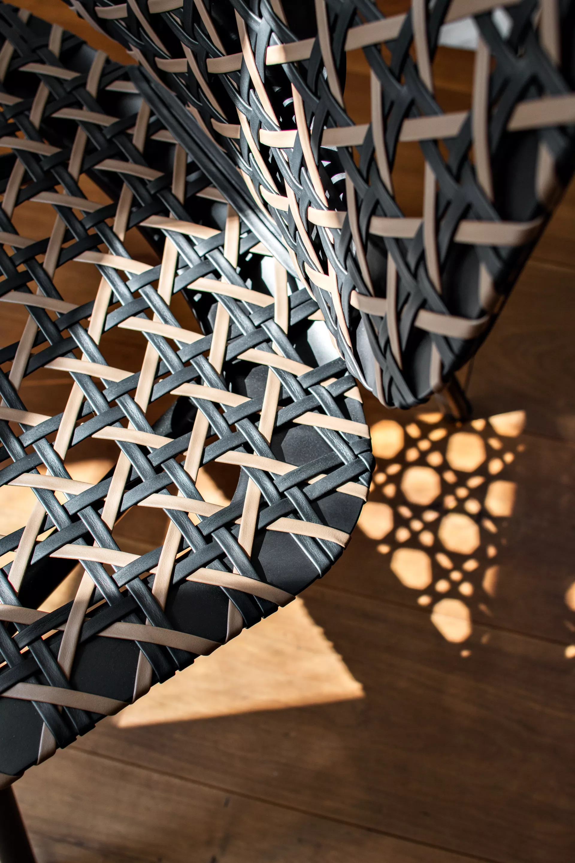 Es bedarf großen handwerklichen Könnens die Jahrhunderte alte Technik des Flechtens in diesem Format mit Lederbändern auszuführen. Verstärkt wird das grafische Erscheinungsbild des Musters noch durch den optionalen Einsatz von zwei Lederfarben. Aërias ist ein anpassungsfähiger Begleiter unterschiedlichster Tische in privatem oder öffentlichem Raum. Er eignet sich aber auch als attraktiver Solitär, dessen Flechtwerk ein interessantes Schattenbild auf seine Umgebung wirft.