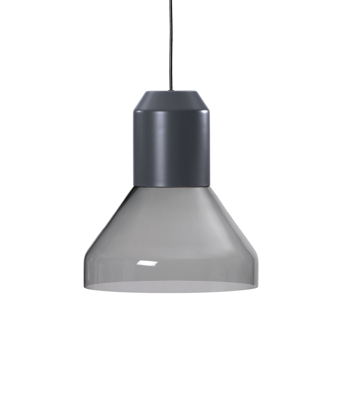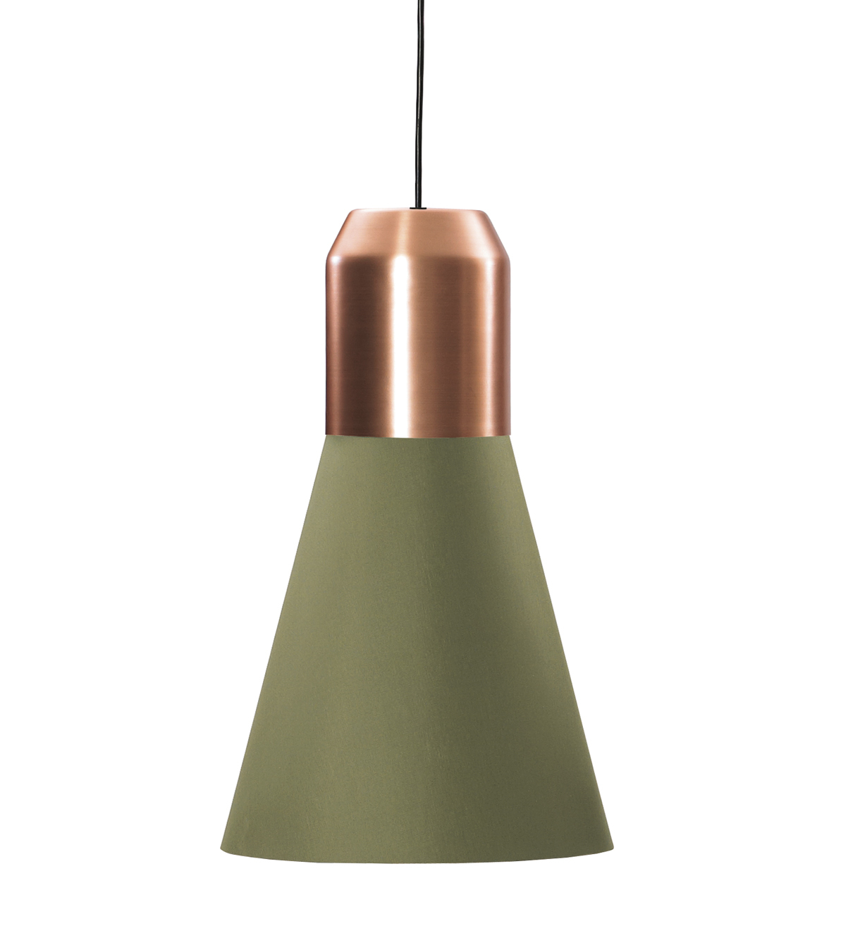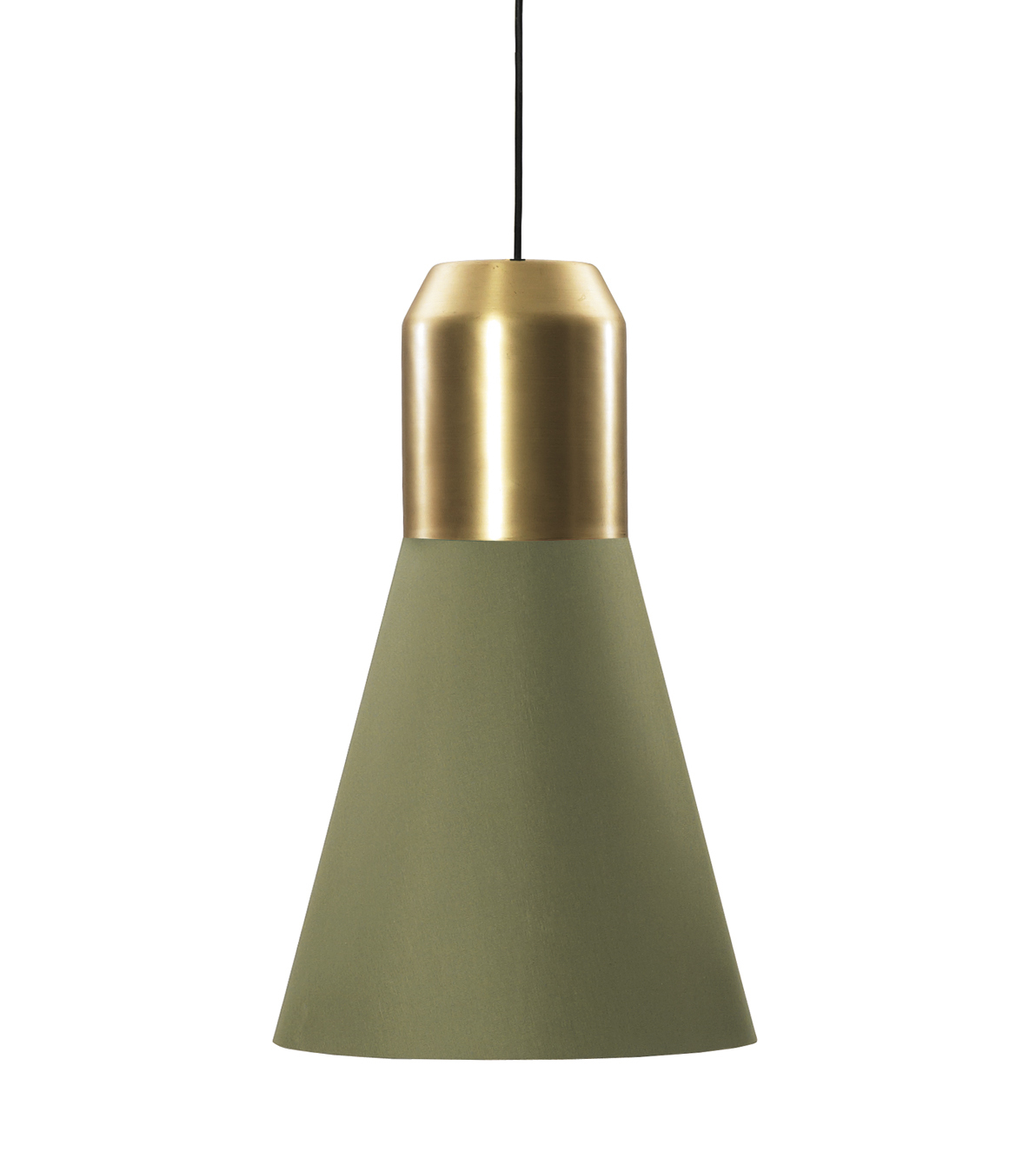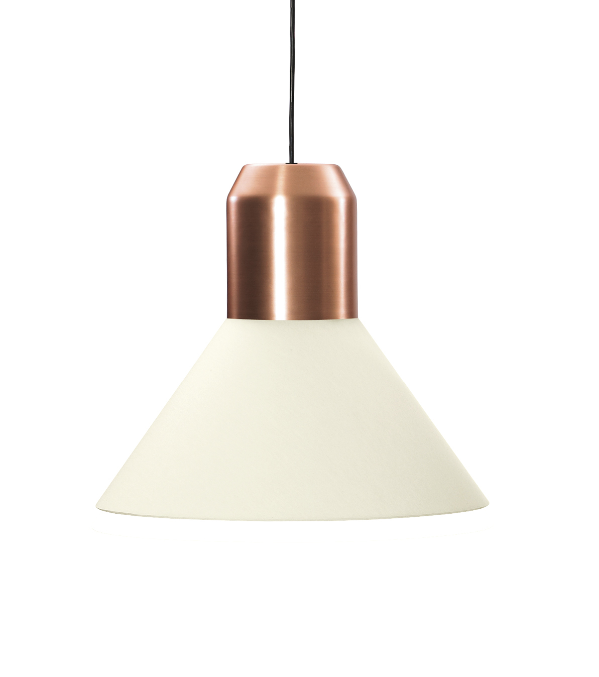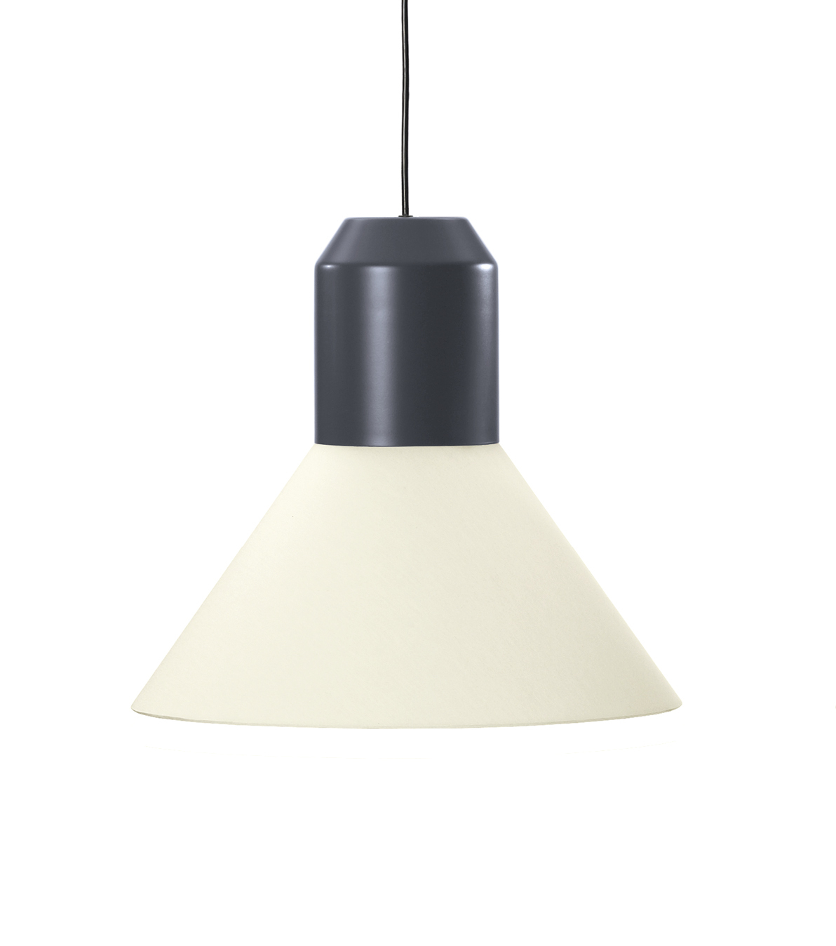 Hängeleuchte. Individuell kombinierbar aus verschiedenen Modulen: Leuchtenkopf aus Metall, pulverbeschichtet in Anthrazitgrau oder aus massivem Messing oder Kupfer, klar lackiert. Lampenschirm aus Stoff in Weiß oder Grün, innen weiß plastifiziert (schwer entflammbar nach B1) oder Metallkorb verkupfert, klar lackiert. Oder mundgeblasener Lampenschirm aus Opalglas weiß satiniert oder Kristallglas in Grau. Schwarzes Kabel. Kabellänge 4 m, Sonderlängen auf Anfrage. Auch als UL-Version erhältlich (nicht gültig für Lampenschirm Ausführung Glas).