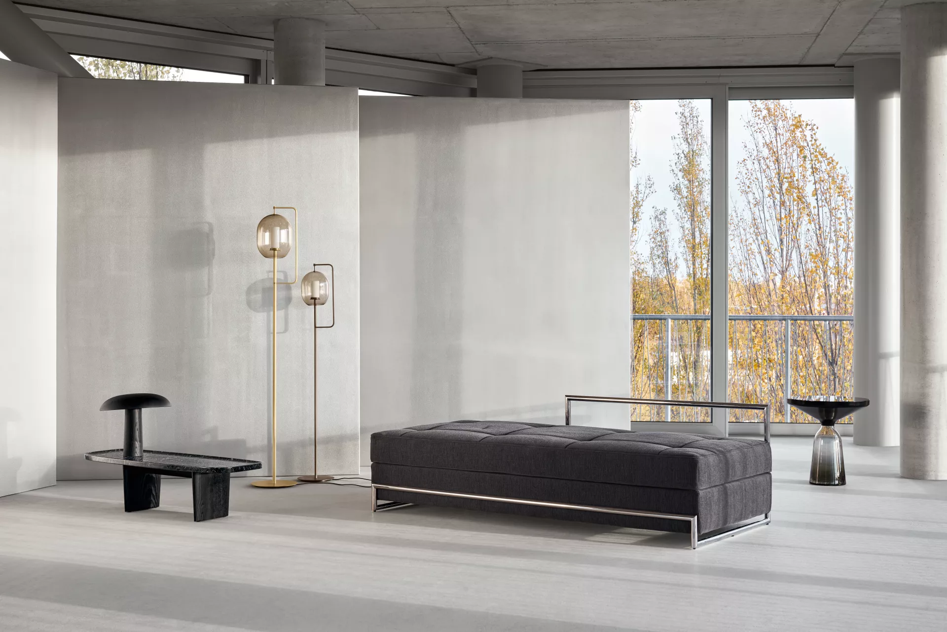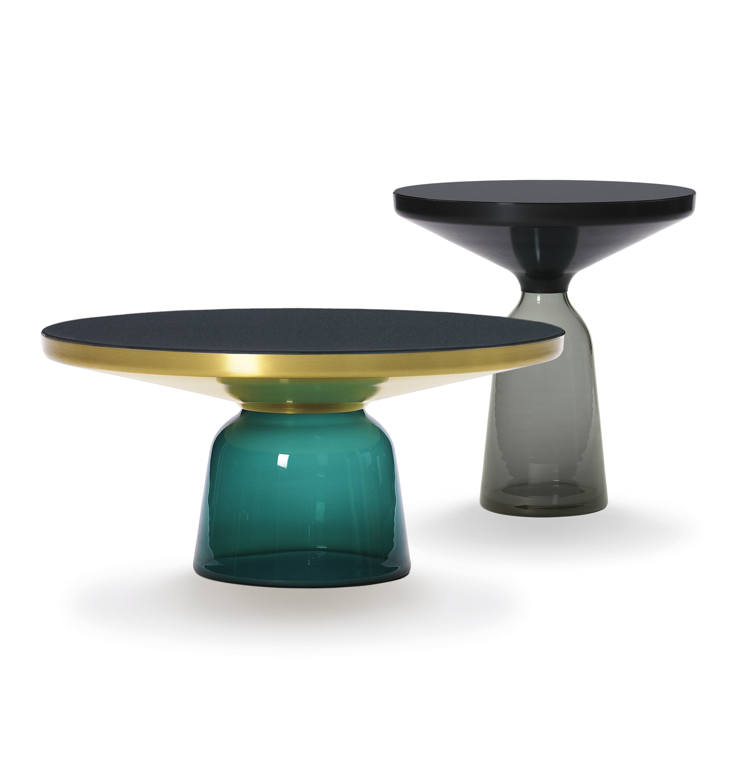 Der Bell Table von Sebastian Herkner stellt den gewohnten Umgang mit Materialien auf den Kopf und überrascht unsere Wahrnehmung: Hier wird der Tischfuß zur prägnanten, farbig-transparenten Glasform im Raum, auf dem ein Metallkörper aufliegt. Das Glas verhilft dem an sich schweren Metall zu schwebender Leichtigkeit. Der traditionell in eine Holzform geblasene Glasfuß und der gedrückte Metallkörper treten in einen spannenden Kontrast und bilden doch formal eine harmonische Einheit, die an den eleganten Schwung einer Glocke erinnert.