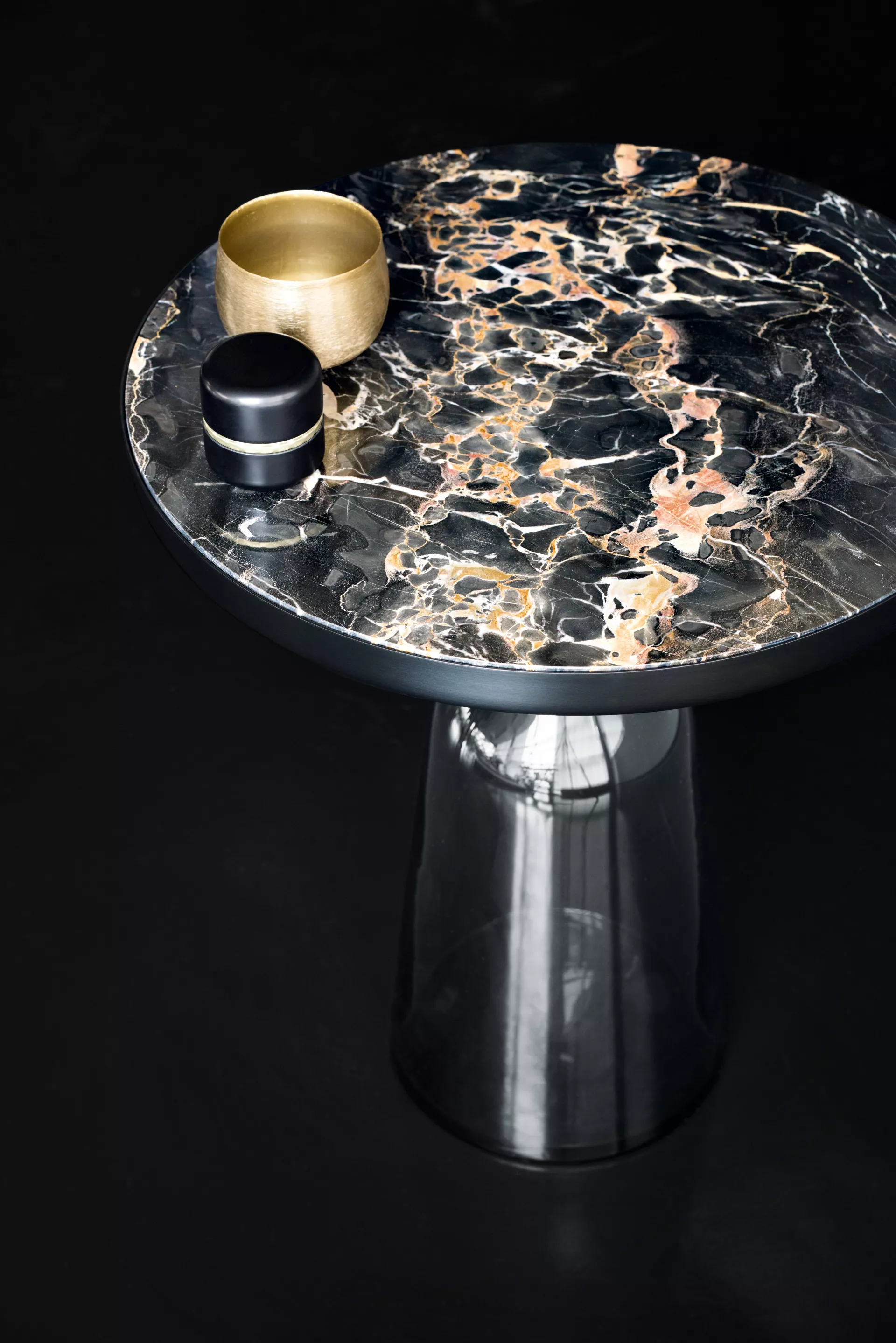 Handgefertigter Beistelltisch. Mundgeblasener Glasfuß in verschiedenen Farben. Metallaufsatz aus massivem Stahl, schwarz lackiert. Tischplatte aus Kristallglas, schwarz lackiert oder Tischplatte aus Marmor in verschiedenen Ausführungen, poliert und imprägniert.