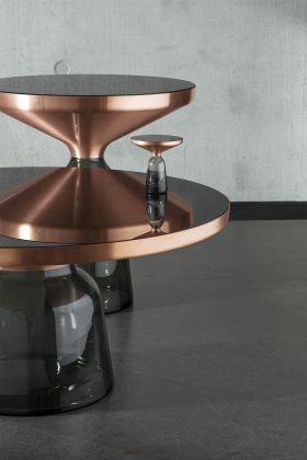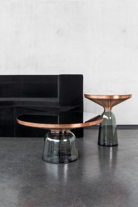 Der Bell Table von Sebastian Herkner stellt den gewohnten Umgang mit Materialien auf den Kopf und überrascht unsere Wahrnehmung: Hier wird der Tischfuß zur prägnanten, farbig-transparenten Glasform im Raum, auf dem ein Metallkörper aufliegt. Das Glas verhilft dem an sich schweren Metall zu schwebender Leichtigkeit. Der traditionell in eine Holzform geblasene Glasfuß und der gedrückte Metallkörper treten in einen spannenden Kontrast und bilden doch formal eine harmonische Einheit, die an den eleganten Schwung einer Glocke erinnert.
