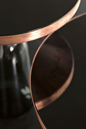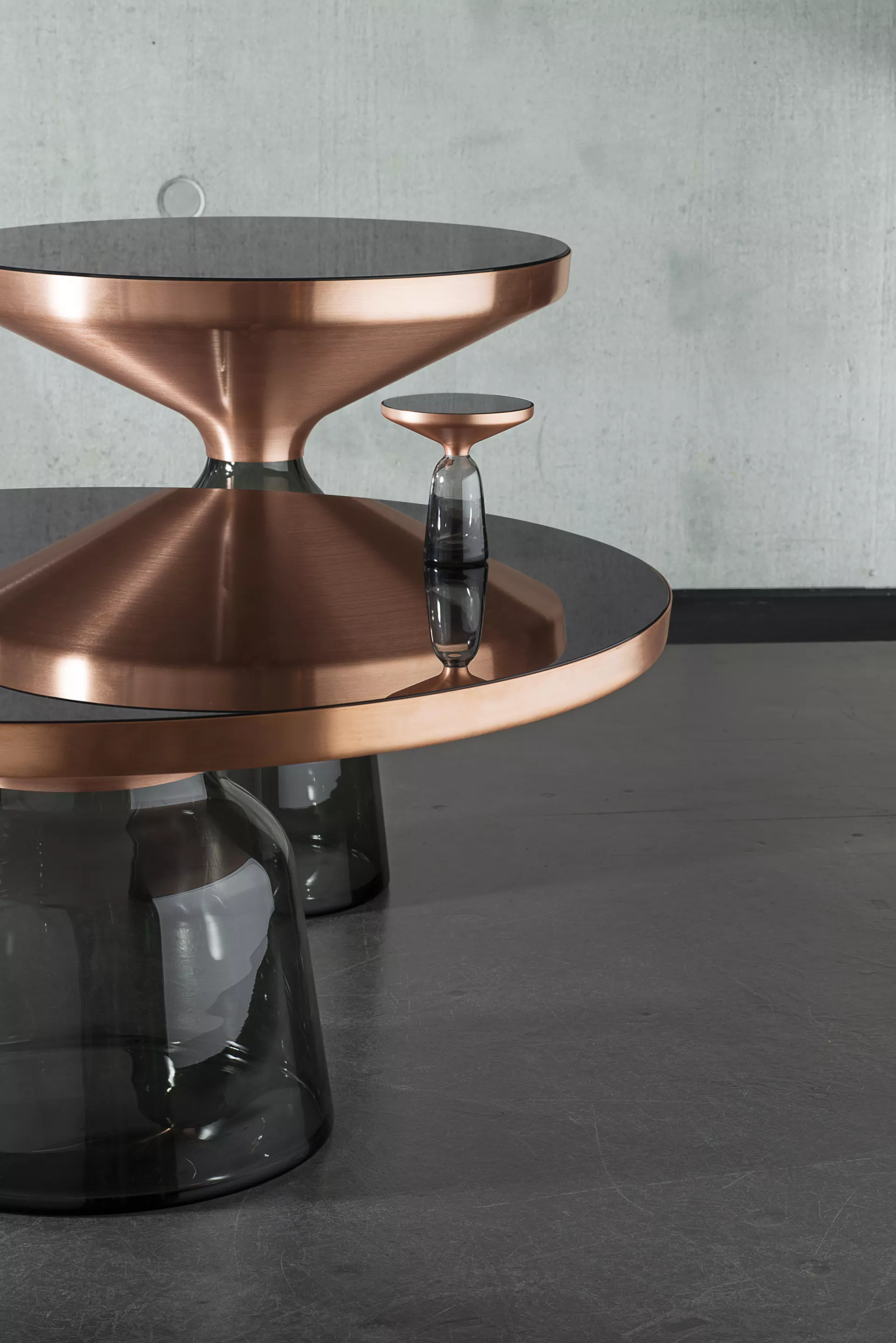 Handgefertigter Beistelltisch. Mundgeblasener Glasfuß in Quarzgrau. Metallaufsatz aus massivem Kupfer, unlackiert, mit Tischplatte aus Kristallglas, schwarz lackiert.