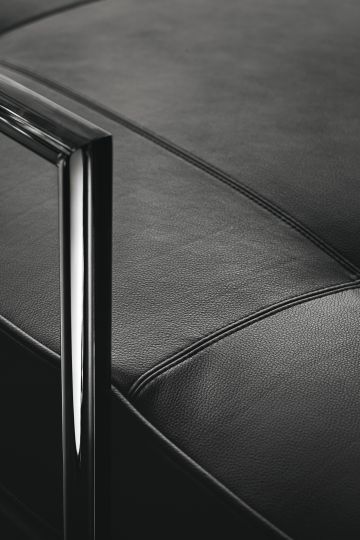 Gestell aus Stahlrohr, pulverbeschichtet in schwarz oder verchromt. Gepolsterter Buchenrahmen mit Gummigurten. Lose Matratze mit Polsterung aus Bonell-Federkern Polyurethan mit Polyesterwatte. Bezug aus Stoff oder Leder. Kunststoffgleiter in schwarz.