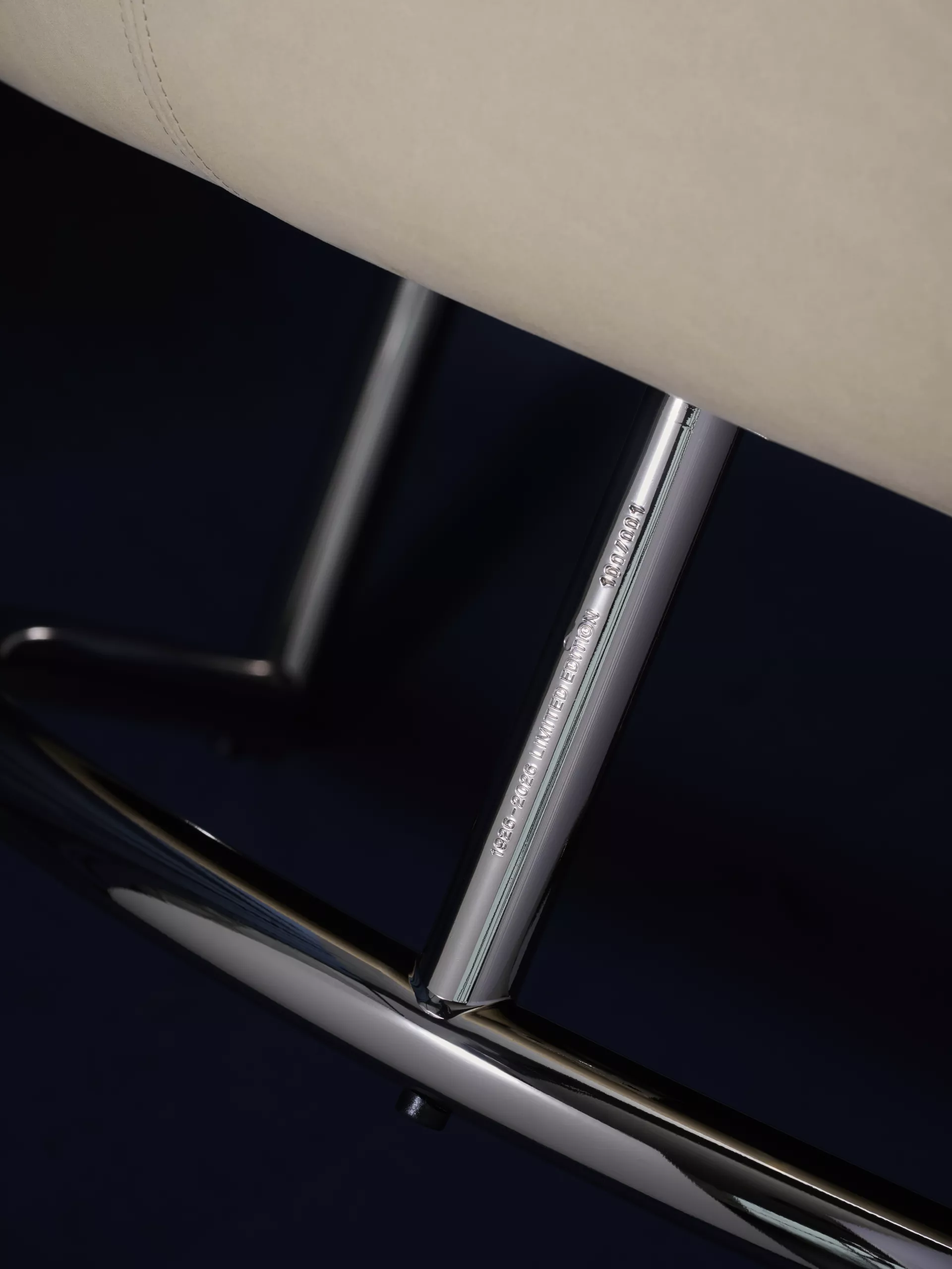 Sessel. Limitierte Edition auf 100 Stück. Jubiläumsprägung im Gestell mit Nummerierung von 1–100 (001/100, 002/100, etc.). Gestell aus Stahlrohr, vernickelt. Buchenrahmen mit Gummigurten. Polsterung aus Polyurethan mit Polyesterwatte. Bezug aus nubukiertem Leder im Farbton Sand. Kunststoffgleiter in Schwarz.