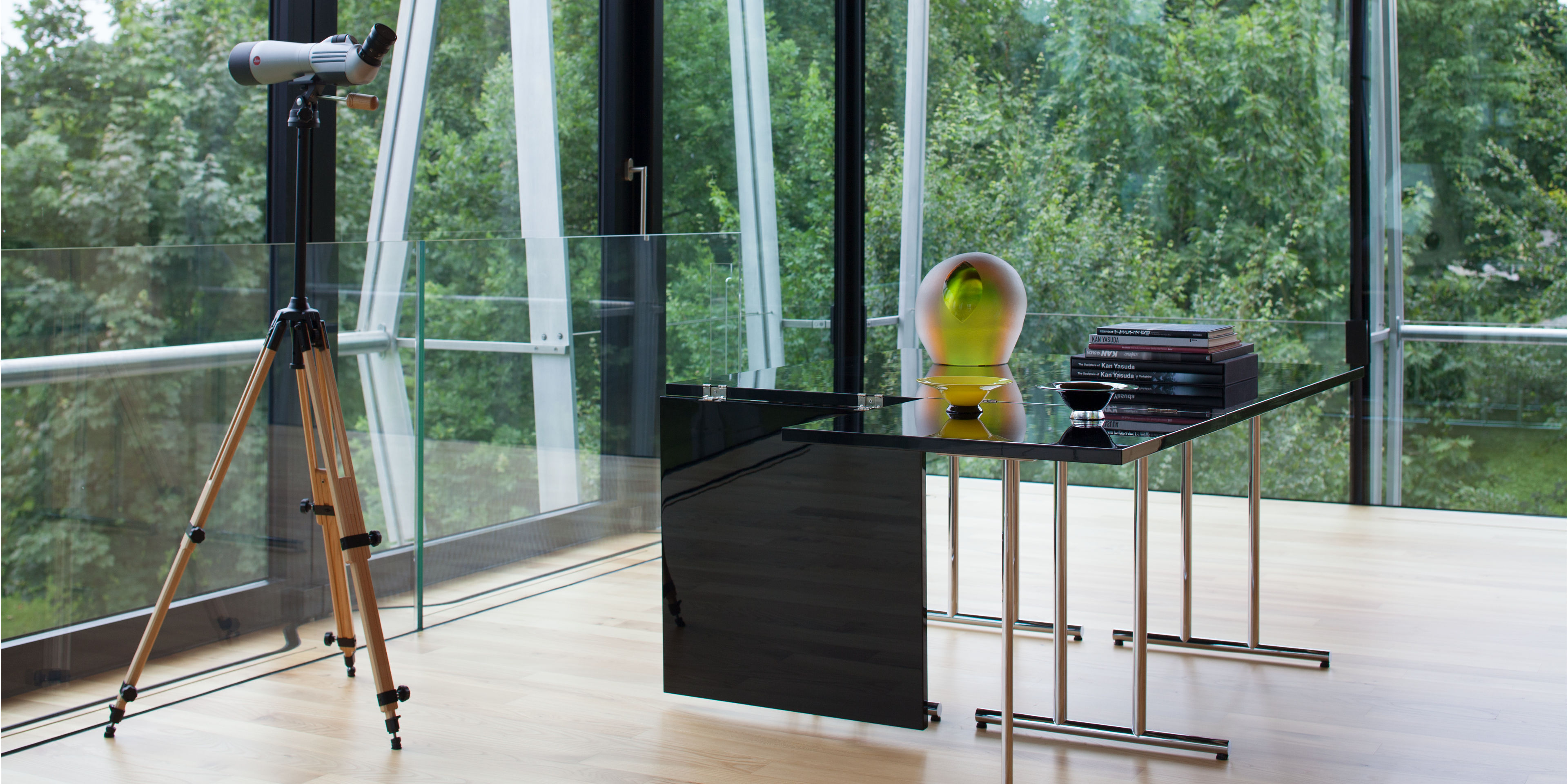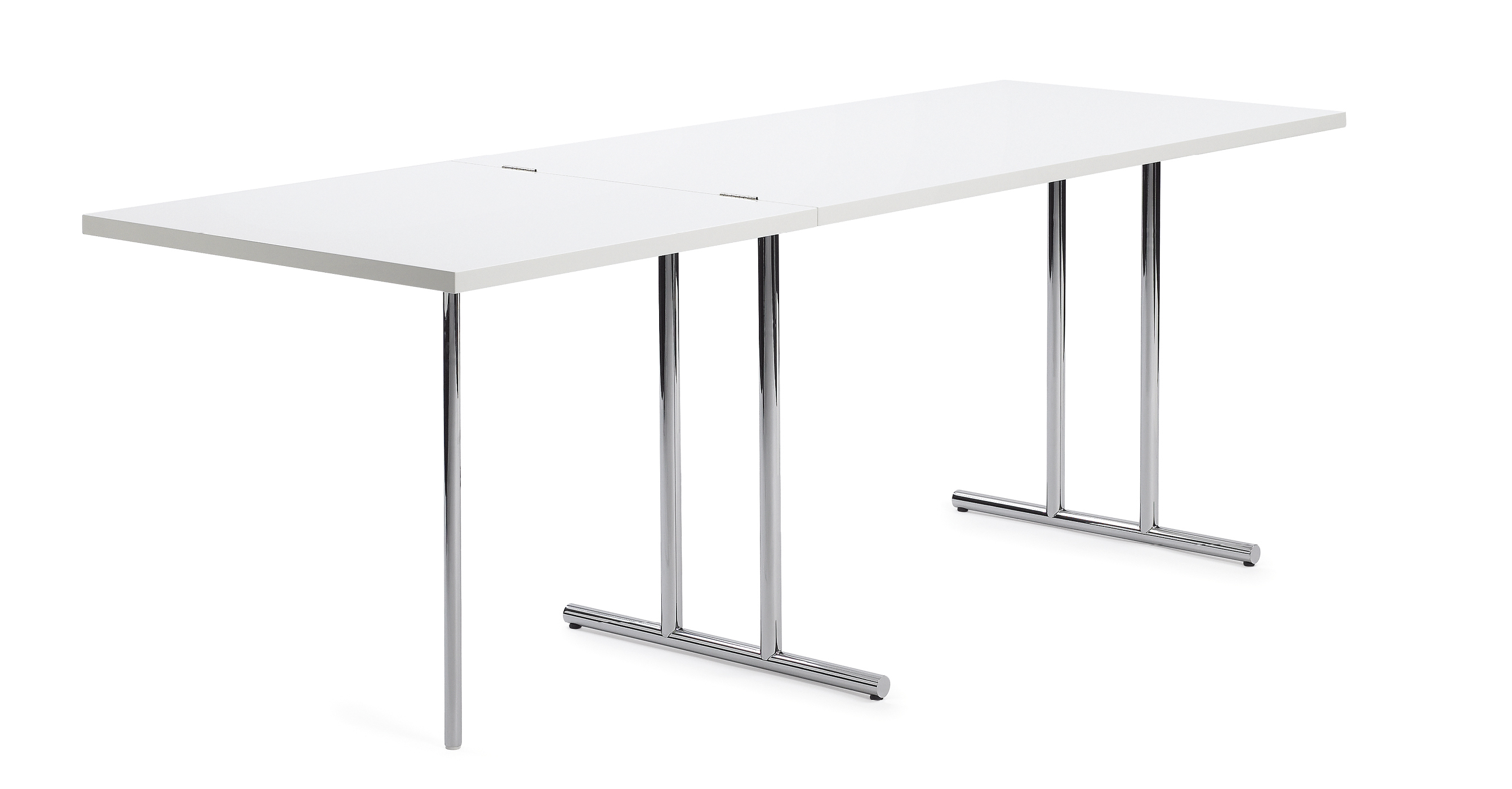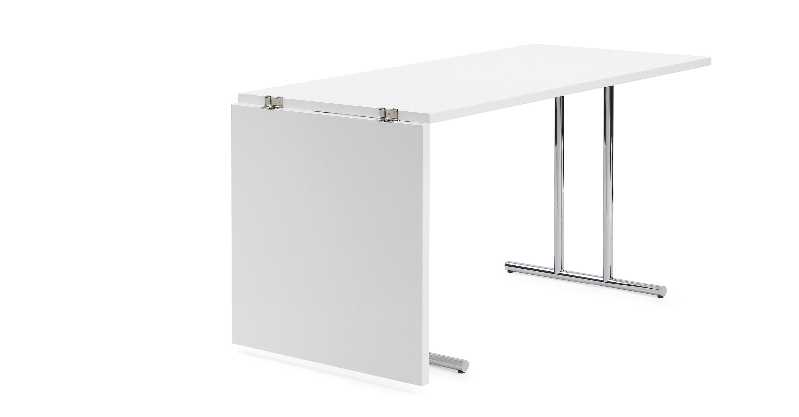 Tisch. Gestell aus verchromtem Stahlrohr. Ein Teil der Tischplatte ist zur Verlängerung hochklappbar. Tischplatte aus MDF hochglanzlackiert in Schwarz oder Weiß. Kunststoffgleiter in Schwarz.
