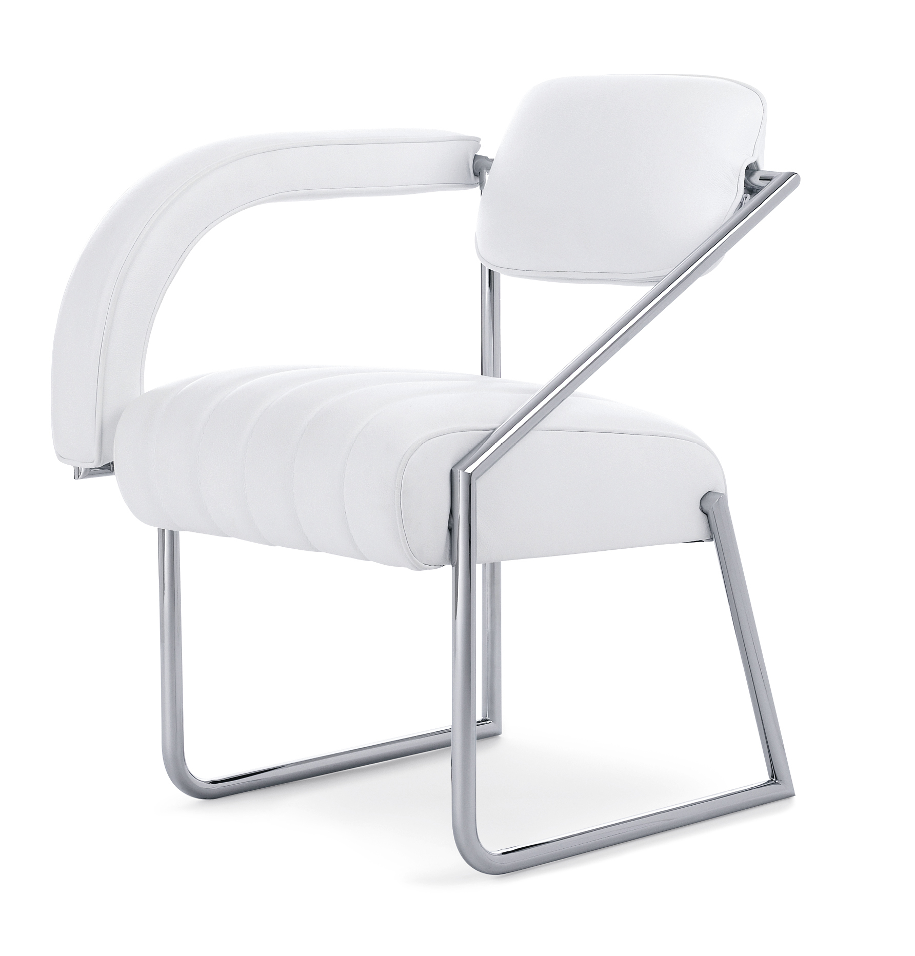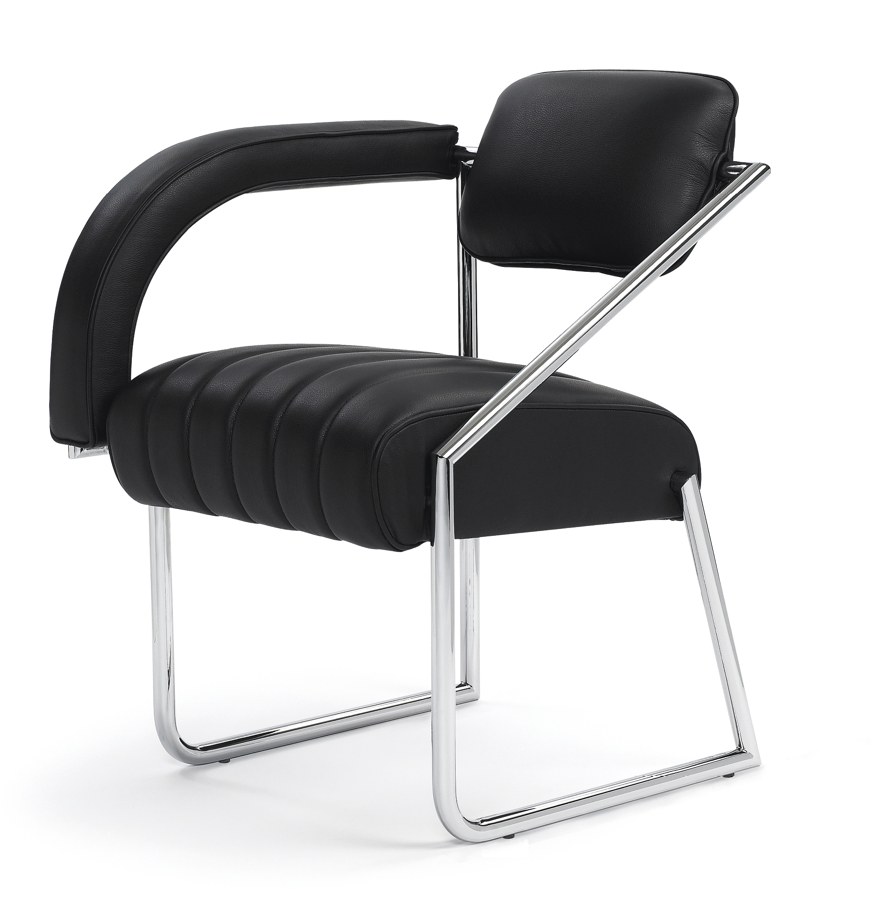 Sessel. Gestell aus verchromtem Stahlrohr. Buchenrahmen mit Gummigurten. Polsterung aus Polyurethan mit Polyesterwatte. Bezug aus Stoff oder Leder. Kunststoffgleiter in Schwarz.