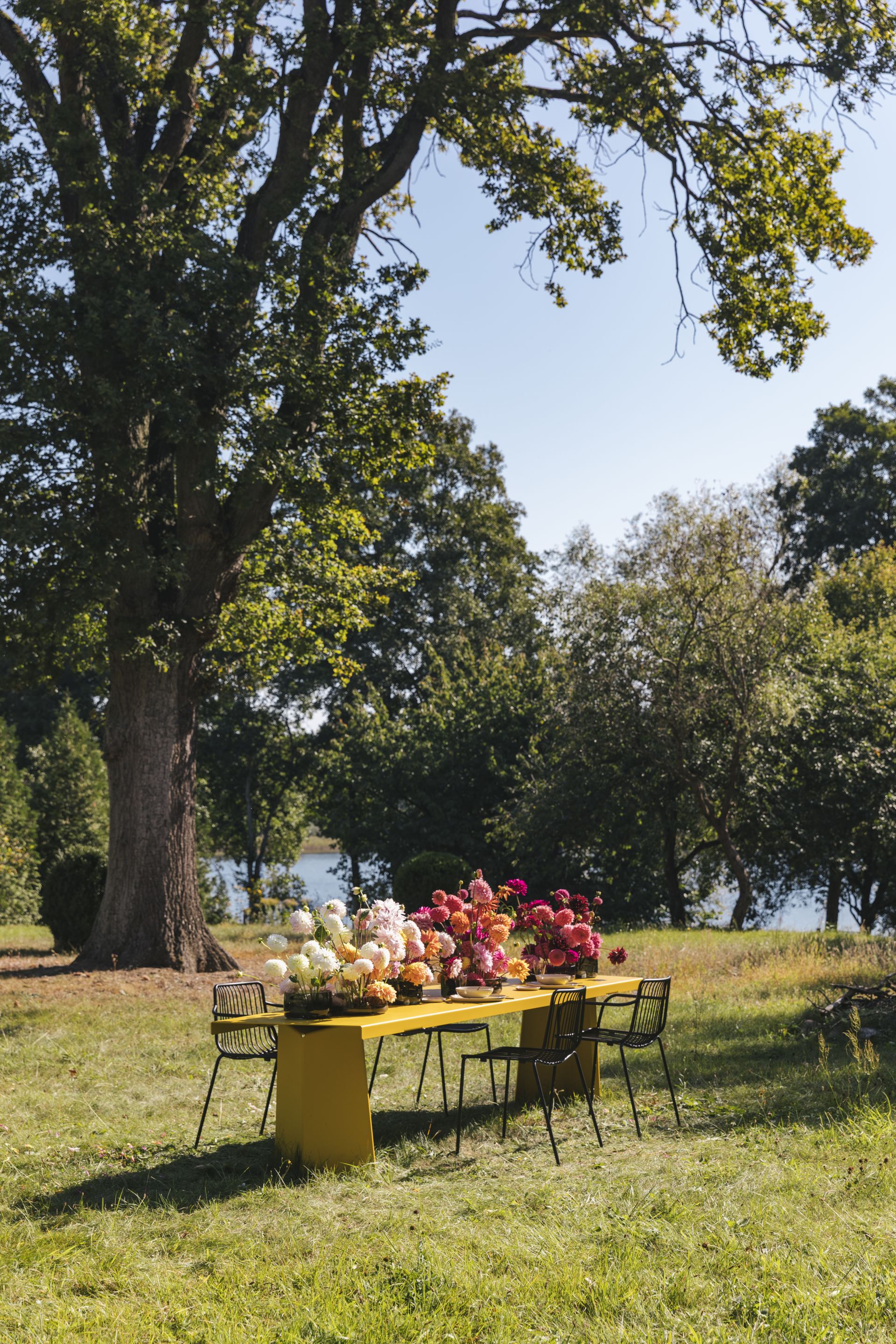 Pallas ist ein Tisch von überwältigender optischer Präsenz. Er beherrscht jeden Raum auf den ersten Blick. Und auf den zweiten Blick enthüllt er eine Fülle spannender konstruktiver Details: Knicke und Kerben, die die glatten Linien brechen und beleben, sichtbare Verschraubungen auf der Unterseite, dazu der taktile Reiz der pulverbeschichteten Metalloberfläche. Die Proportionen sind so gewählt, dass man sich, anders als bei vielen modisch überbreiten Tischen, etwas näher gegenübersitzt. Das fördert das Tischgespräch und macht Pallas zu einer natürlichen Kommunikationszentrale. Trotz seiner schlanken Dimensionen imponiert er auch im Außenraum auf den ersten Blick.