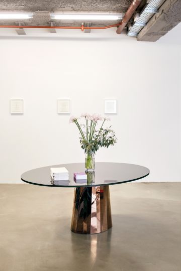 Tisch. Tischfuß aus gefaltetem und hochglanz-poliertem Edelstahlblech in verschiedenen Farben in einem speziellen Verfahren gefärbt. Ovale Tischplatte aus Kristallglas, Unterseite farbig lackiert, oder aus Marmor in verschiedenen Ausführungen, poliert und imprägniert. Höhenverstellbare Filzgleiter in Grau.