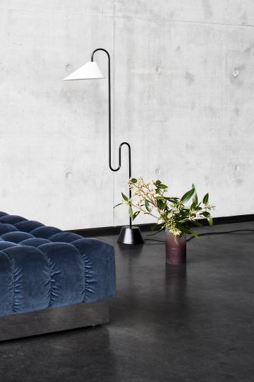 Stehleuchte. S-förmig gebogenes Stahlrohr und Fuß aus Stahl, schwarz oder cremeweiß lackiert. Drehpunkt im Rohr ermöglicht variable Positionen des Schirms. Lampenschirm aus Stoff in Weiß, innen plastifiziert (schwer entflammbar nach B1). Fußschalter, dimmbar. Filzgleiter in Grau. Inklusive Leuchtmittel.