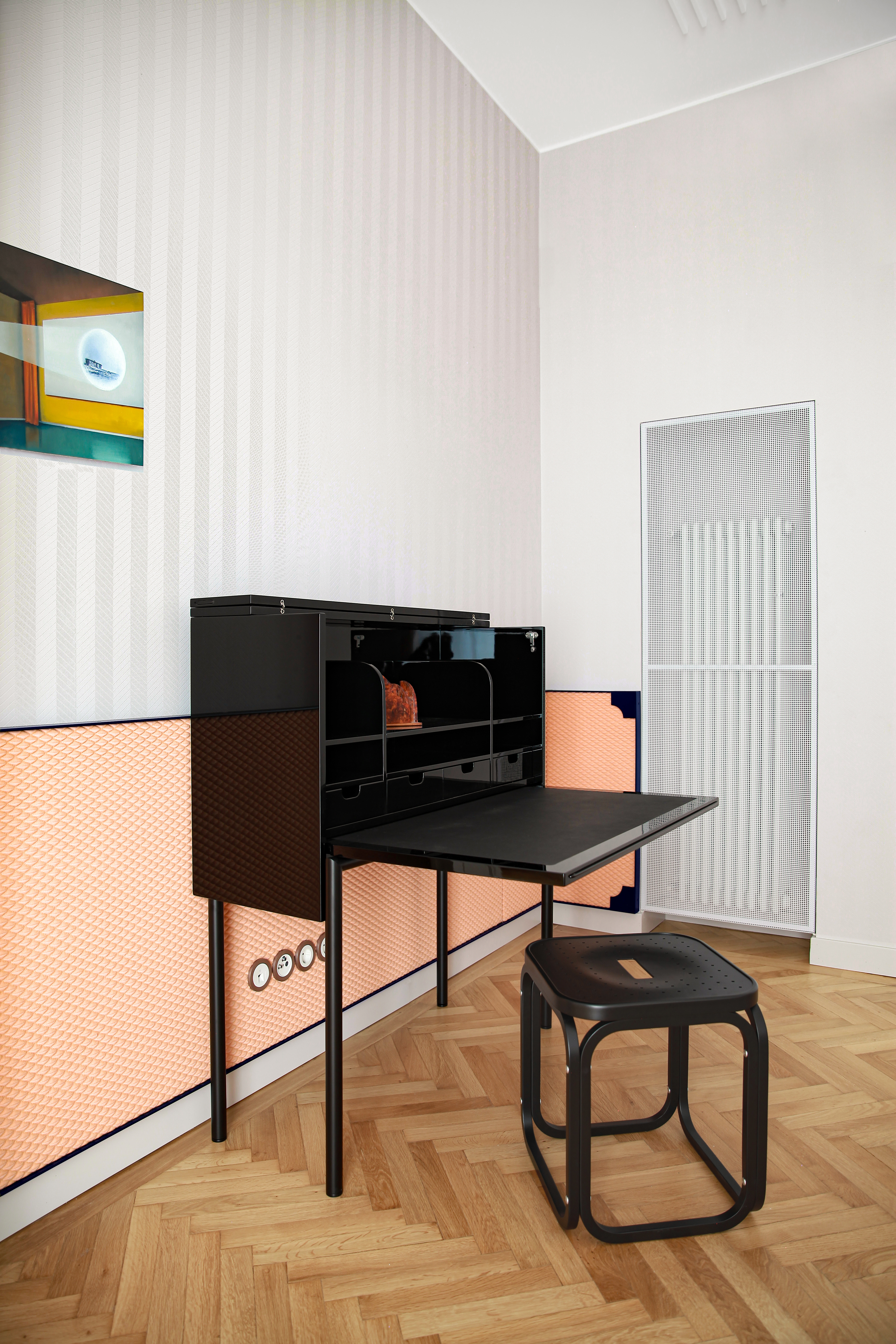 The owners, a German-Italian couple with an art background and a professional connection to high-quality textiles, wanted furnishings that reflect the work of creative women from the era during which the apartment was built. Inspired by the work of the Trieste artist Anita Pittoni in the 1930s, for example, Marcante-Testa designed textile architectural elements: partitions, wall coverings, but also cabinet fronts and curtains. They were made exclusively for the project by the Textiel Museum Tilburg in collaboration with textile designer Aleksandra Gaca.