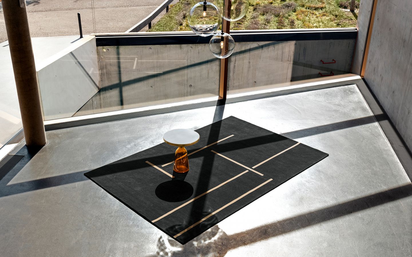 Monolith is characterised by beige horizontal and vertical lines of varying lengths that elegantly accentuate the earthy-looking dark grey background. In places, the lines cross without touching - they suggest a structure that seems to divide the carpet into square spaces of different sizes. This design is based on gouaches and pencil drawings from the 1920s, which the Irish designer made as carpet designs and which ClassiCon has now translated into a 200 cm x 300 cm carpet made of 100 % finest new wool.