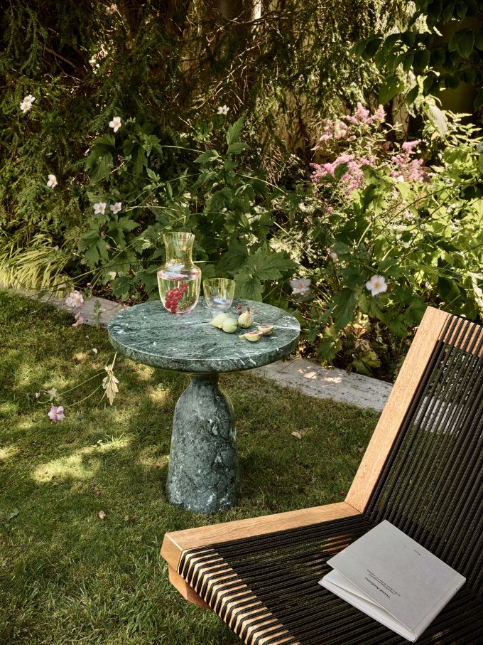 The Bell Side Table by Sebastian Herkner complements the new outdoor collection in a matt marble version. It is a masterpiece of traditional craftsmanship. This timeless design is characterised by the distinctive bell shape that gave it its name. The solid marble emphasises the design’s sculptural character and, with its individual veining and colouring, makes each table unique. There are four types of marble to choose from: from the light, calm Bianco Carrara to the cloudy grey Grigio Nuvolato, the leafy green and veined Verde Guatemala and the graphically veined black Nero Marquina. The different surfaces create dynamic contrasts with familiar outdoor materials and textures. Sunlight and weathering cause natural stone to appear duller and paler over time.