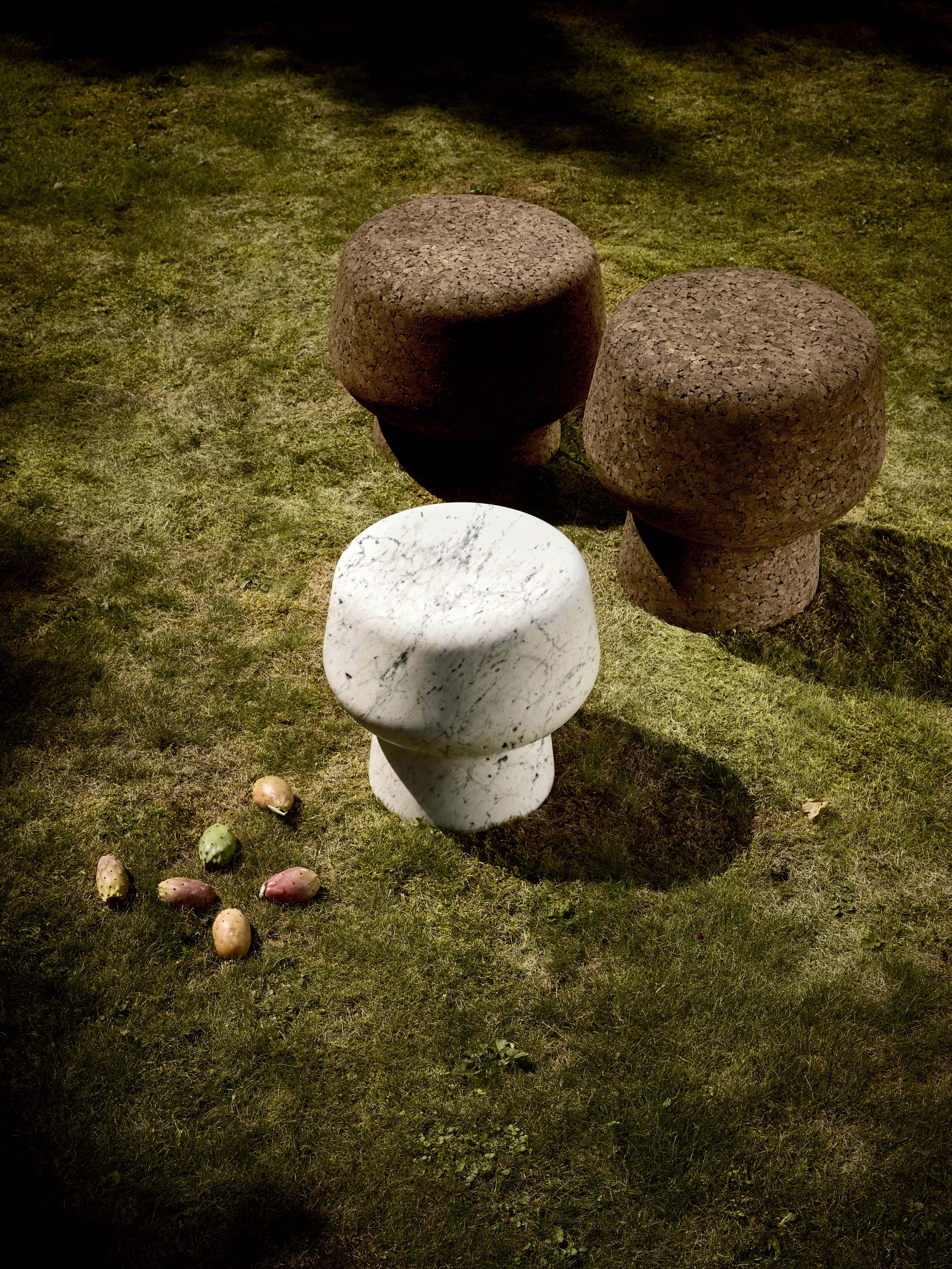 The matt outdoor version emphasises the monolithic character of the design: the solid natural stone object creates a striking accent in the garden or on the terrace. Each table captivates with its individual grain and colouring, making each piece unique. Over time, natural weathering allows the marble to develop a refined patina, further enhancing its elegant appearance. Combined with the cork versions, the result is a striking visual and tactile eye-catcher: the smooth, cool surface of the stone forms an exciting contrast to the warm, velvety cork of the original designs and invites you to touch it.