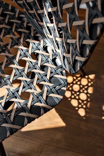 High-quality craftsmanship skills are required for executing the traditional weaving technique in this format with leather straps. The graphic appearance of the pattern is enhanced by the optional use of leather in two different colours. Aërias is an adaptable companion for various tables in private or public spaces. It is also suitable as an attractive stand-alone piece, with its leather weaving casting interesting shadows on its environment.