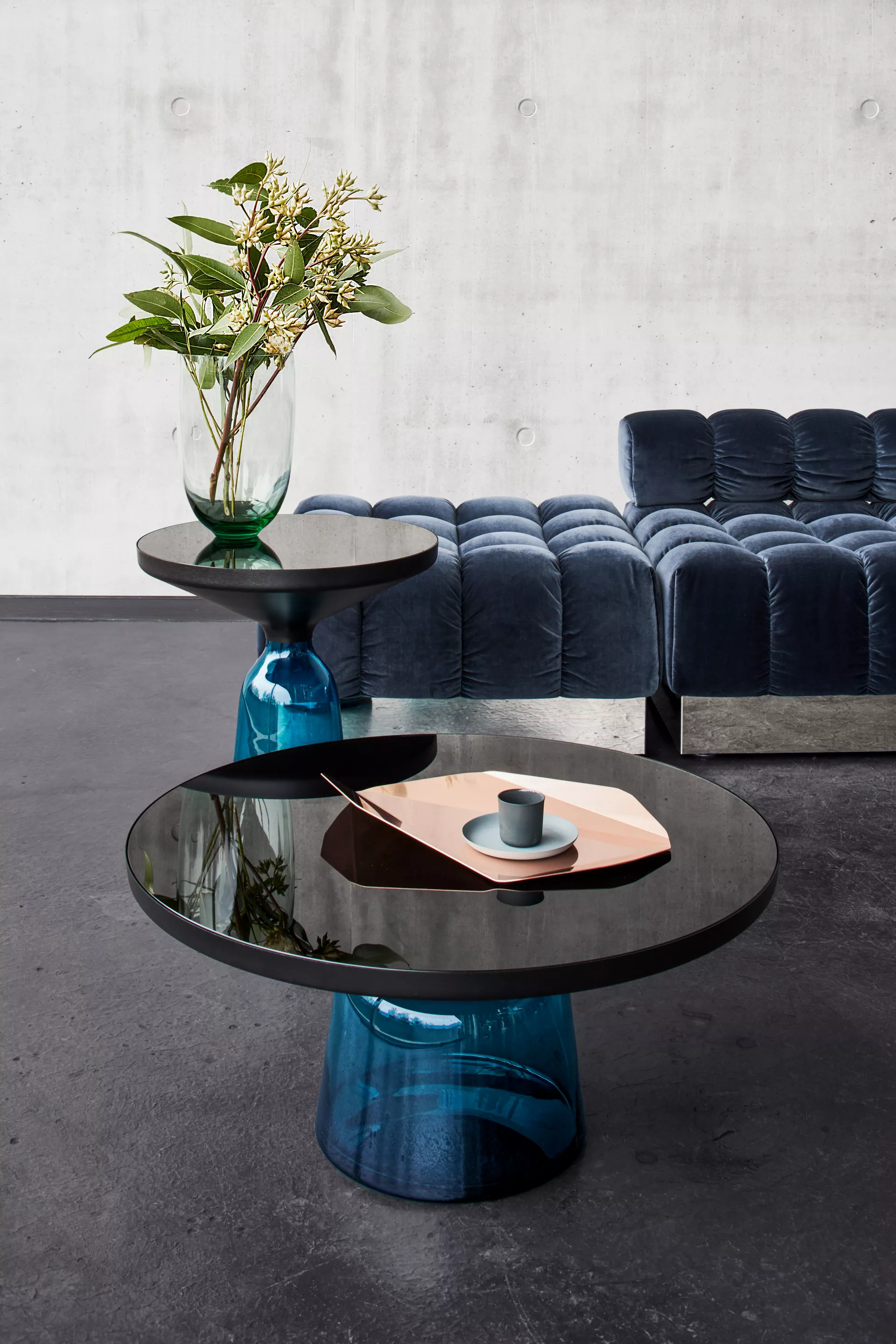 The Bell Table by Sebastian Herkner turns our perceptual habits on their head, using the lightweight, fragile material of glass as a base for a metal top that seems to float above it. Hand-blown in the traditional manner using a wooden mould, the transparent tinted glass base asserts a sculptural presence in space, intriguingly contrasting with the solid brass frame on top while also forming a harmonious unit with it, recalling the elegant curved silhouette of a bell.