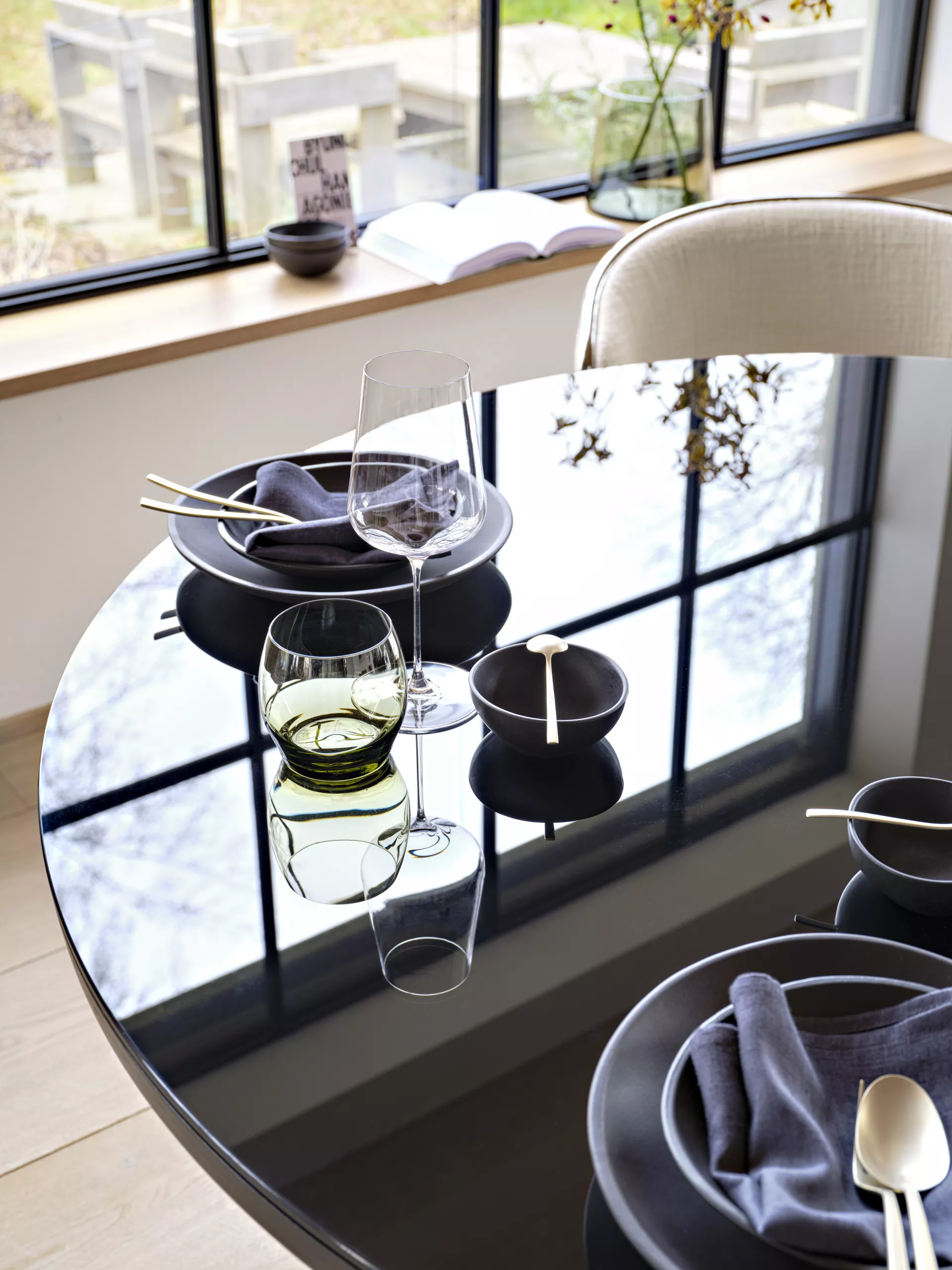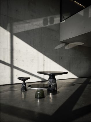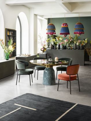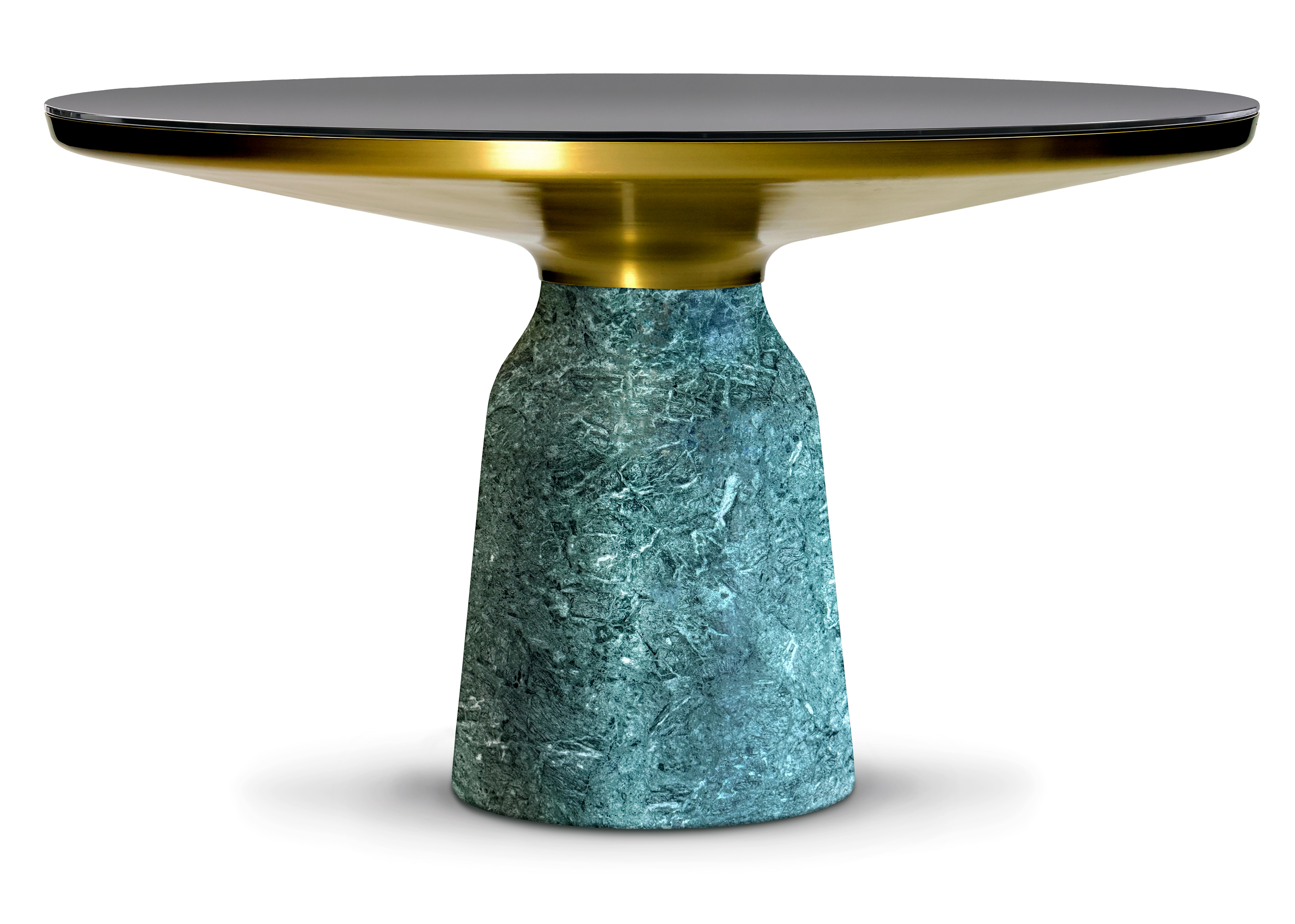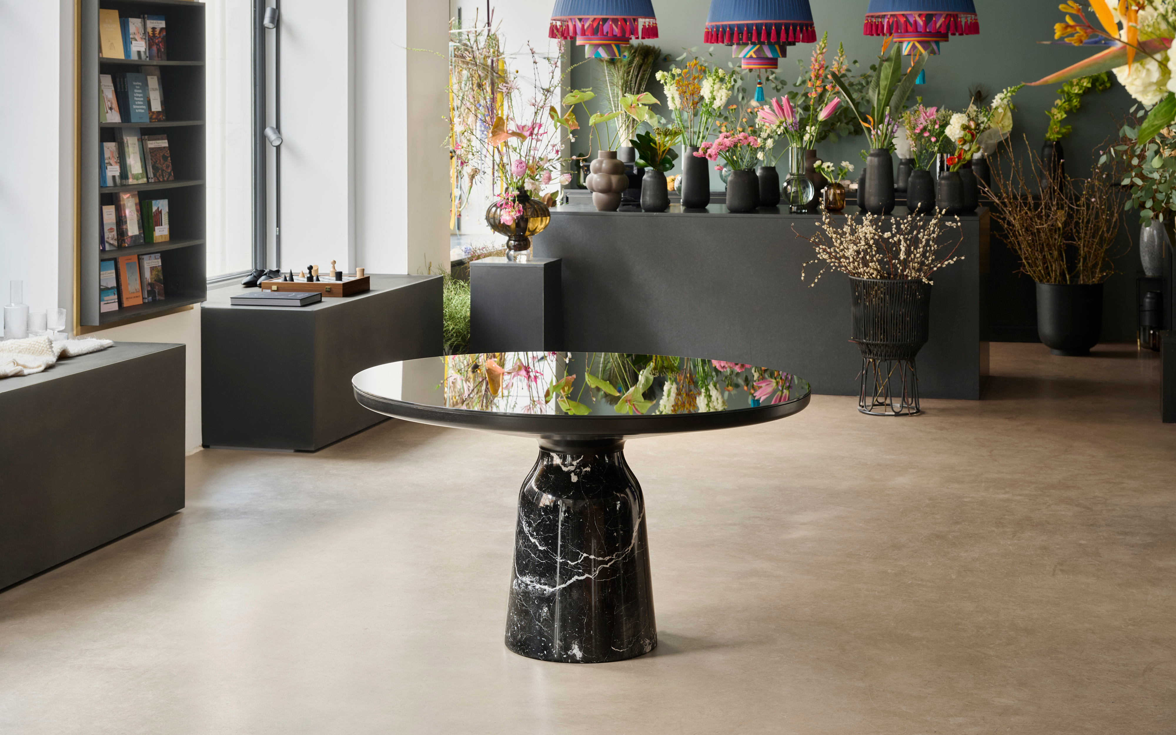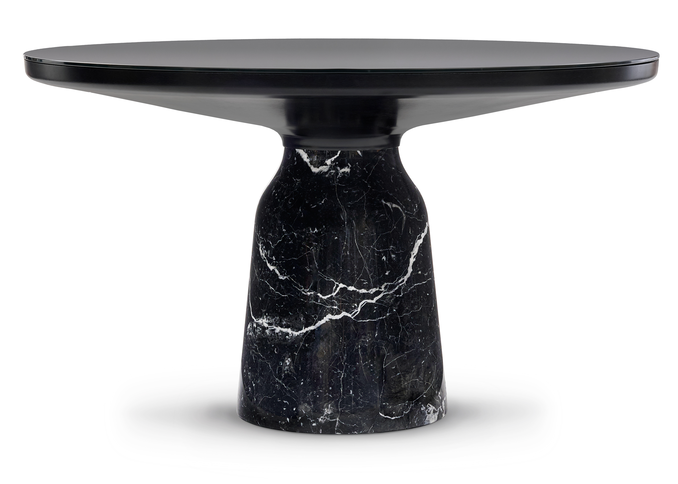 The Bell Dining Table transfers the elegance of the Bell Tables into new dimensions. For the dining table version, the striking glass base has been replaced by a different material: marble. Since its launch in 2012, this design by Sebastian Herkner with its unconventional use of materials has been regarded as a modern classic. In this new dimension, it continues to impress with its shape, which is reminiscent of the slight curve of a bell. The elegance of the original design is retained by the hand-polished, shiny marble. At the same time, the new material lends the table a grounded look that conveys stability and durability. The contrasting vein of the two types of marble adds a new interplay of colours to the palette of the Bell Dining Table.