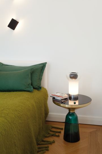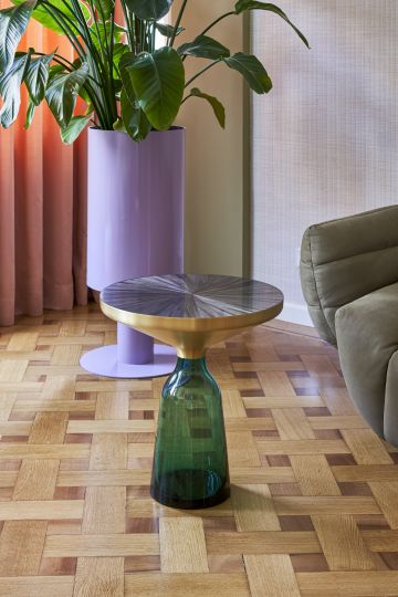 The Bell Table by Sebastian Herkner turns our perceptual habits on their head, using the lightweight, fragile material of glass as a base for a metal top that seems to float above it. Hand-blown in the traditional manner using a wooden mould, the transparent tinted glass base asserts a sculptural presence in space, intriguingly contrasting with the solid brass frame on top while also forming a harmonious unit with it, recalling the elegant curved silhouette of a bell.