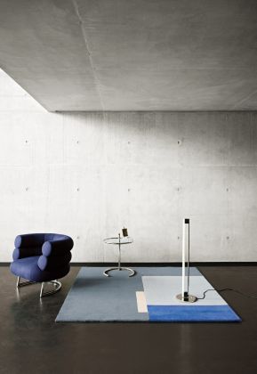 Armchair. Frame tubular steel, powder-coated in black or chrome-plated. Beech frame with rubber webbing. Upholstery polyurethane with polyester fibre. Cover in fabric or leather. Plastic gliders in black.
