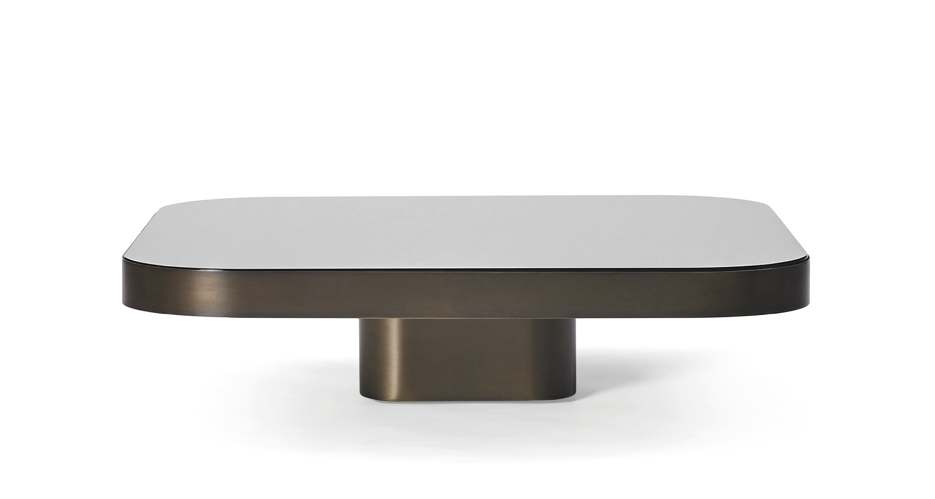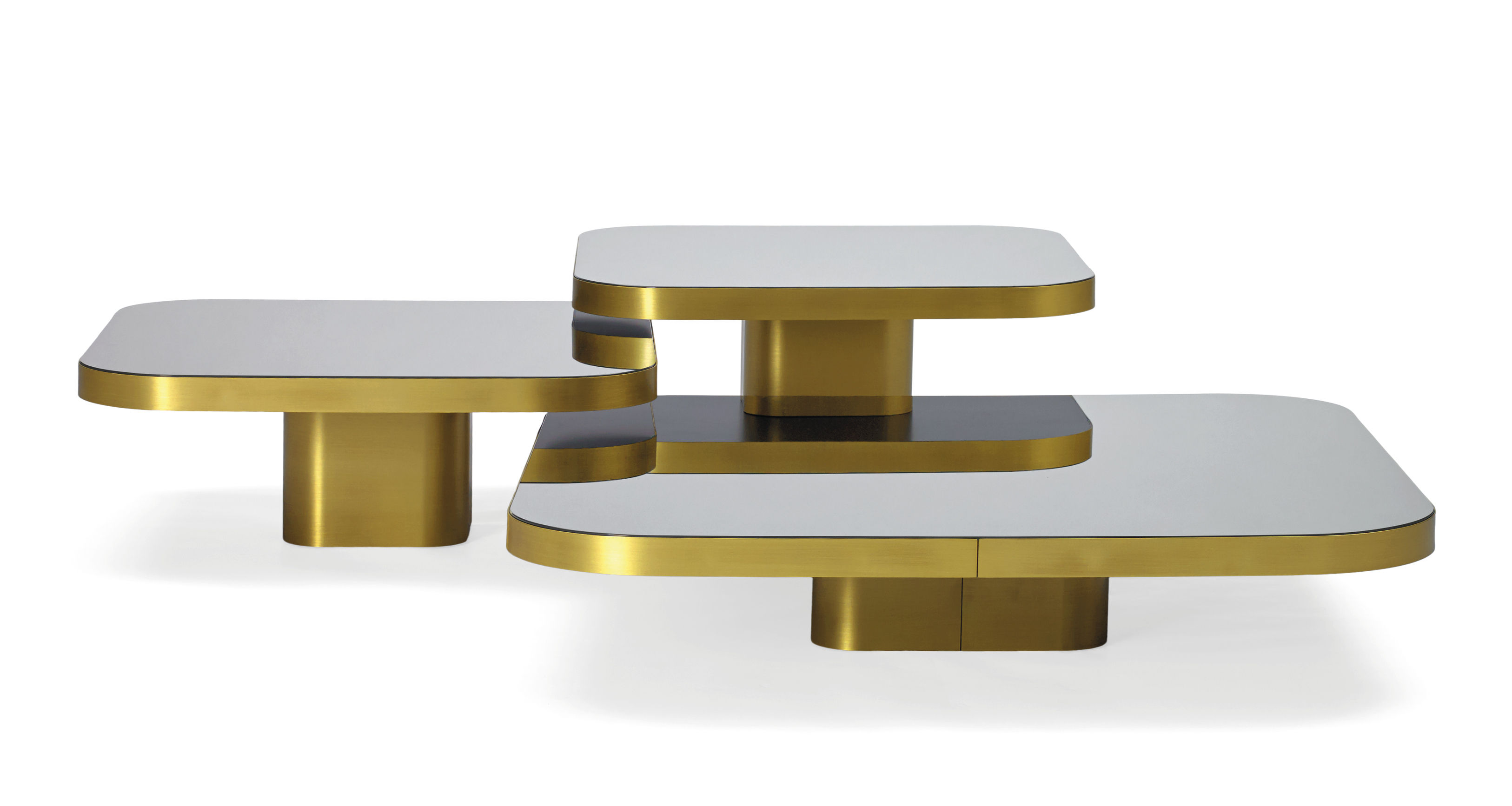 Available in three tabletop sizes and four heights. Table natural or burnished solid brass sheet, with clear varnish or solid steel sheet black lacquered or solid aluminium sheet, with clear varnish. Tabletop crystal glass, with a mirror finish or black lacquered, or marble tabletop in various versions, polished and impregnated. Height-adjustable felt gliders.