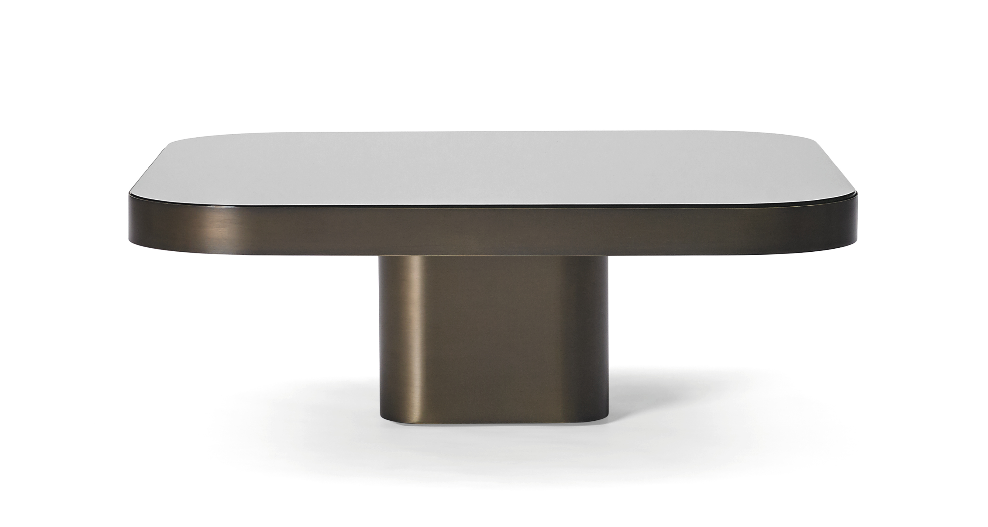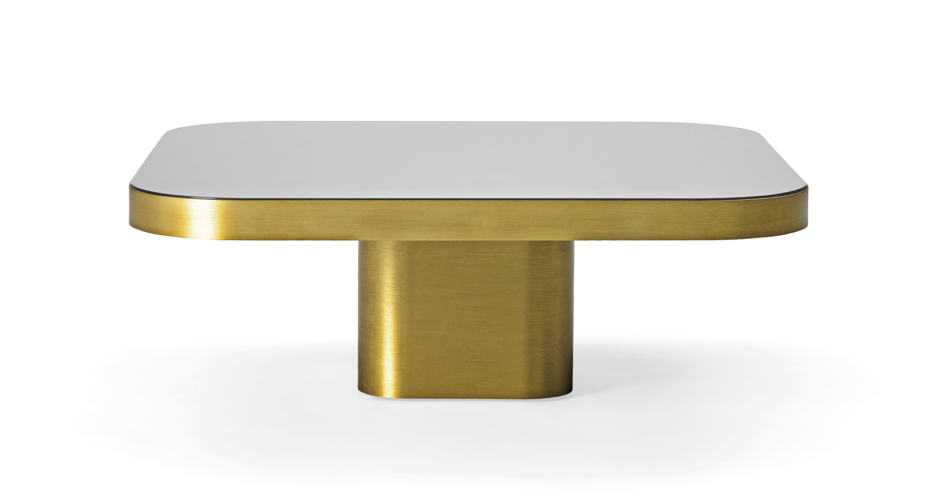 Available in three tabletop sizes and four heights. Table natural or burnished solid brass sheet, with clear varnish or solid steel sheet black lacquered or solid aluminium sheet, with clear varnish. Tabletop crystal glass, with a mirror finish or black lacquered, or marble tabletop in various versions, polished and impregnated. Height-adjustable felt gliders.