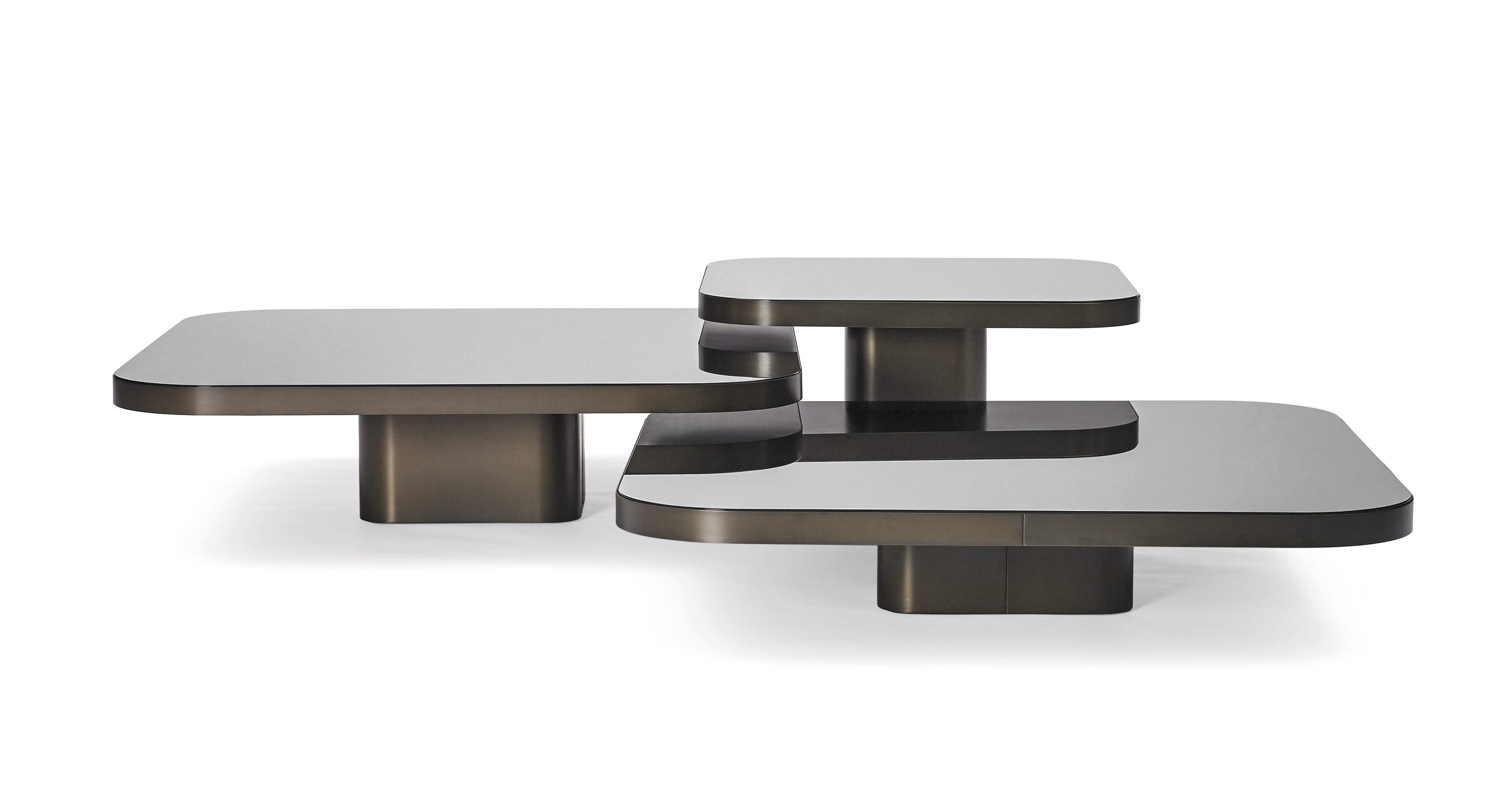 Available in three tabletop sizes and four heights. Table natural or burnished solid brass sheet, with clear varnish or solid steel sheet black lacquered or solid aluminium sheet, with clear varnish. Tabletop crystal glass, with a mirror finish or black lacquered, or marble tabletop in various versions, polished and impregnated. Height-adjustable felt gliders.