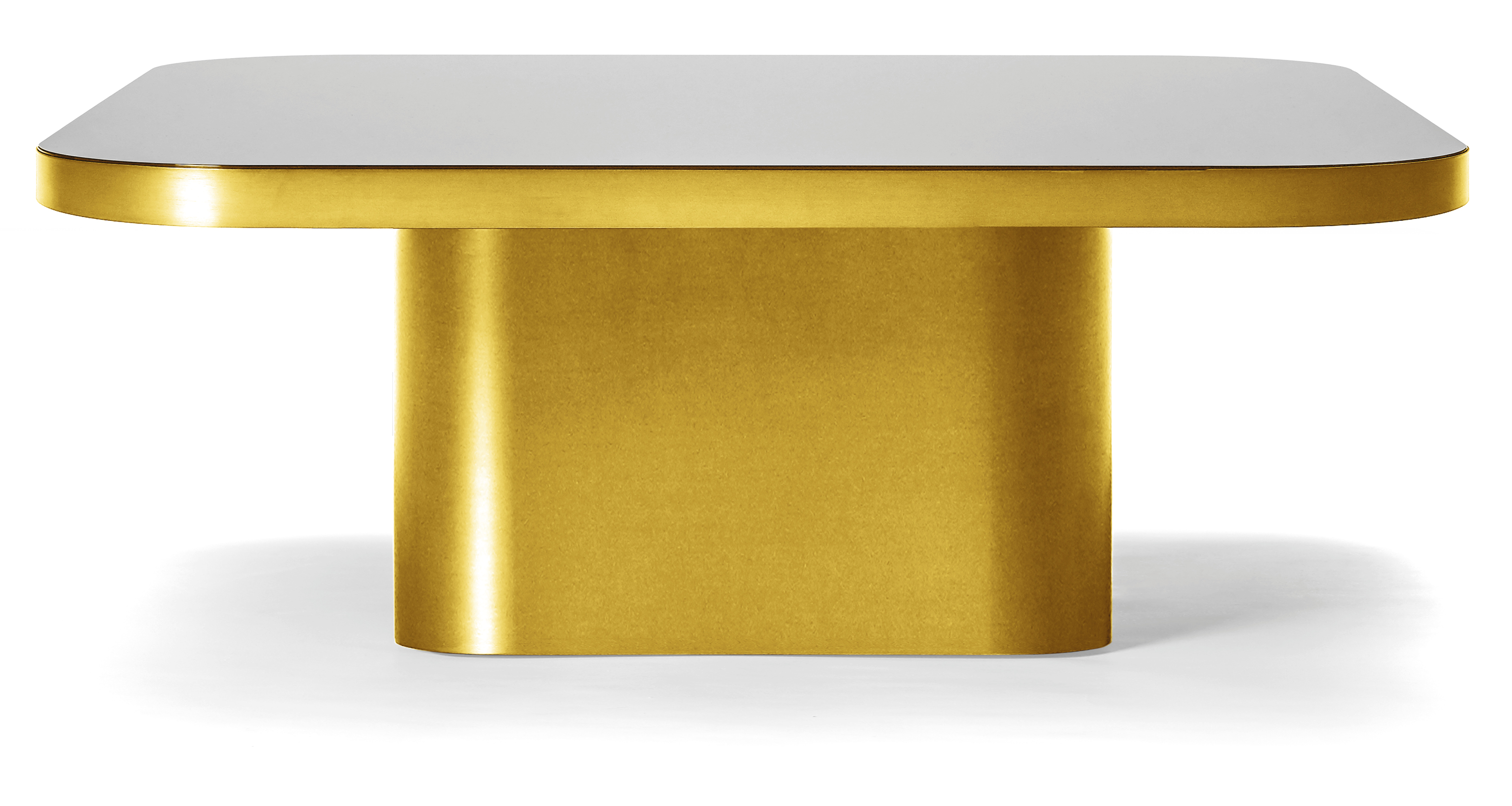 Coffee table. Available in three tabletop sizes and four heights. Table natural or burnished solid brass sheet, with clear varnish or solid steel sheet black lacquered or solid aluminium sheet, with clear varnish. Tabletop crystal glass, with a mirror finish or black lacquered, or marble tabletop in various versions, polished and impregnated. Height-adjustable felt gliders.