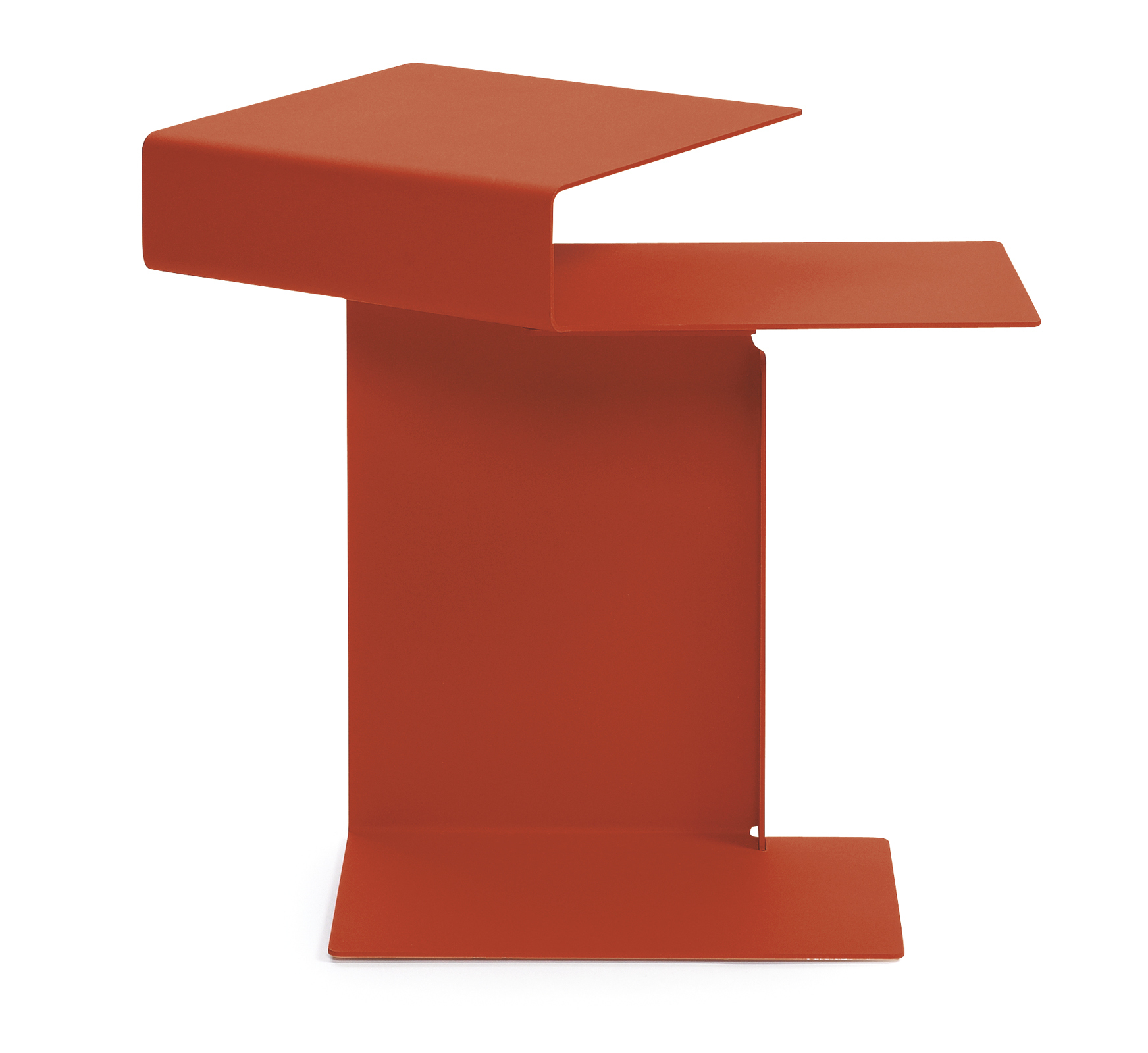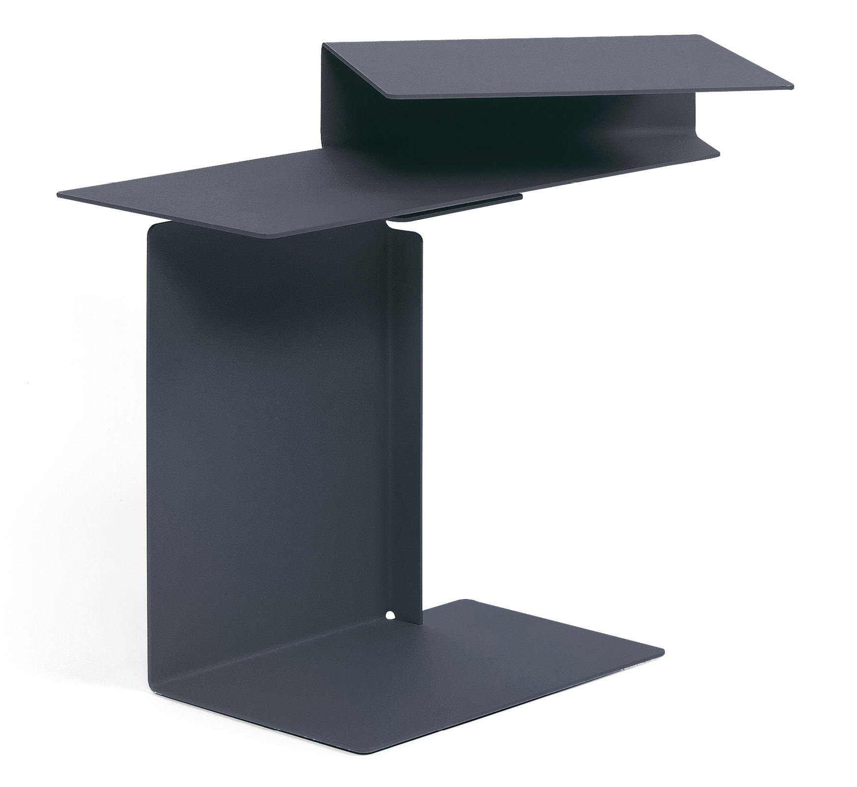 Side table. Sheet steel, powder-coated with fine texture in various colours. Swivel top. Bottom covered with polyethylene.