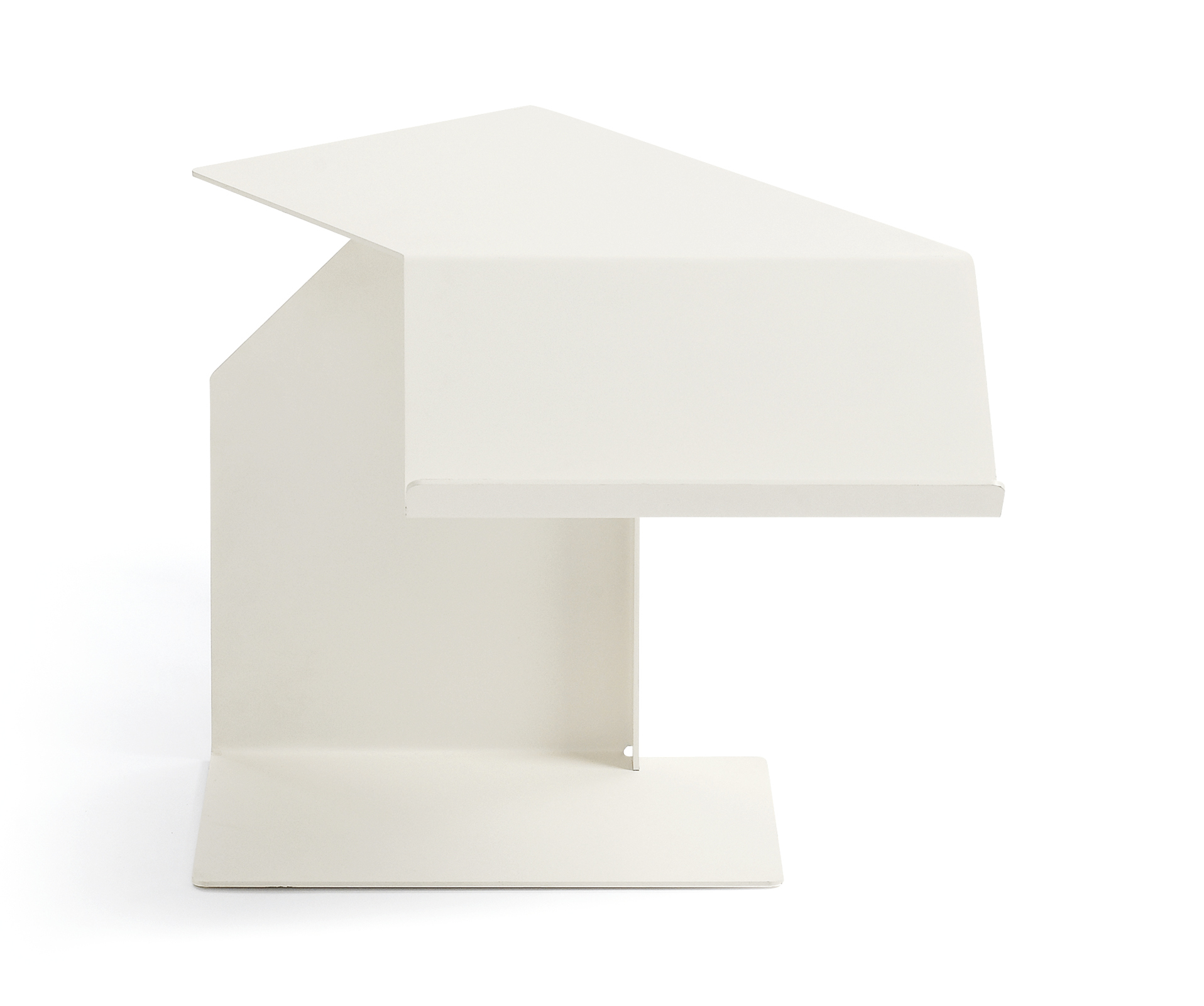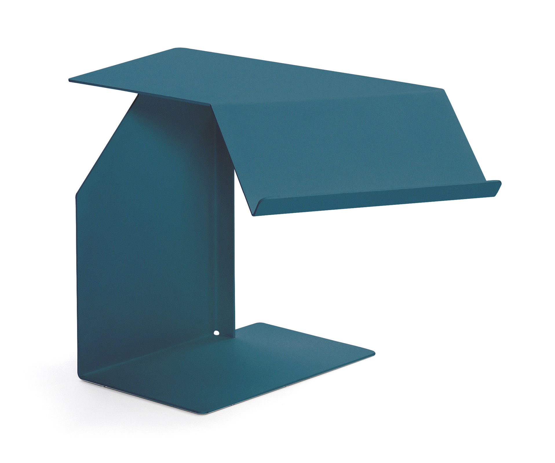 Side table. Sheet steel, powder-coated with fine texture in various colours. Swivel top. Bottom covered with polyethylene.