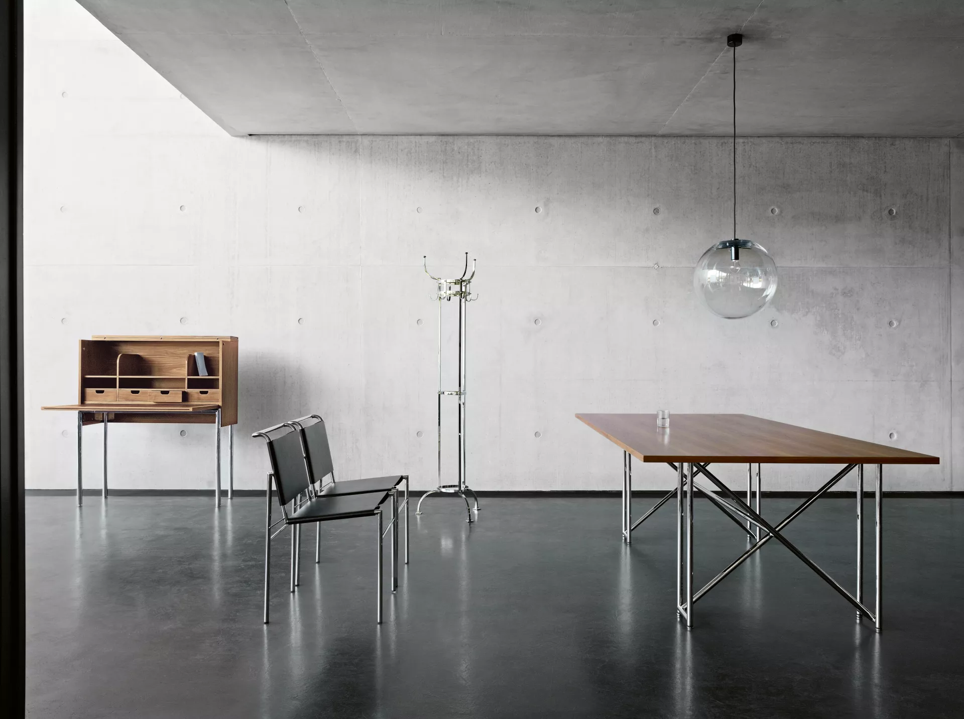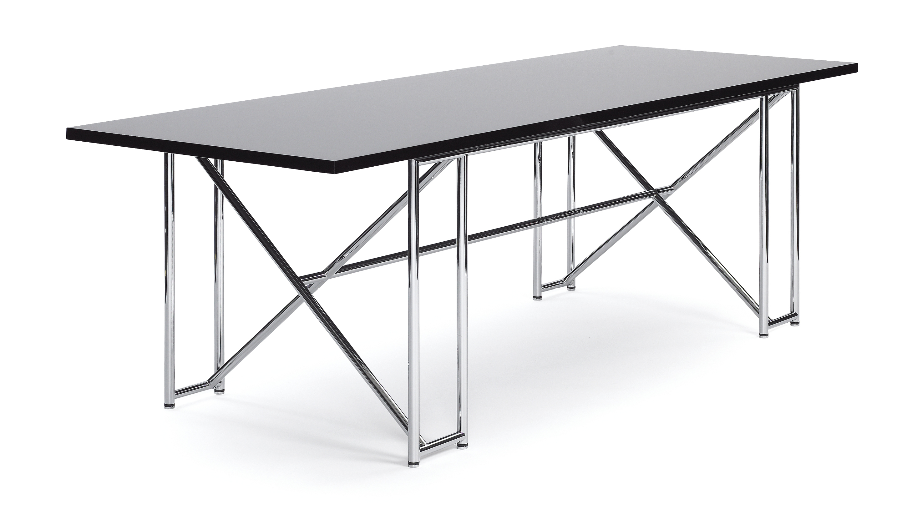 When an avant-garde steel tube design meets the classical refectory table, the result is the Double X. A large, yet elegant table, its x-shaped supports make for optimum rigidity. Like so many of Eileen Gray‘s designs, the Double X is a master of many roles, cutting a fine figure both as a dining room table and as a desk or office table for individualists.
