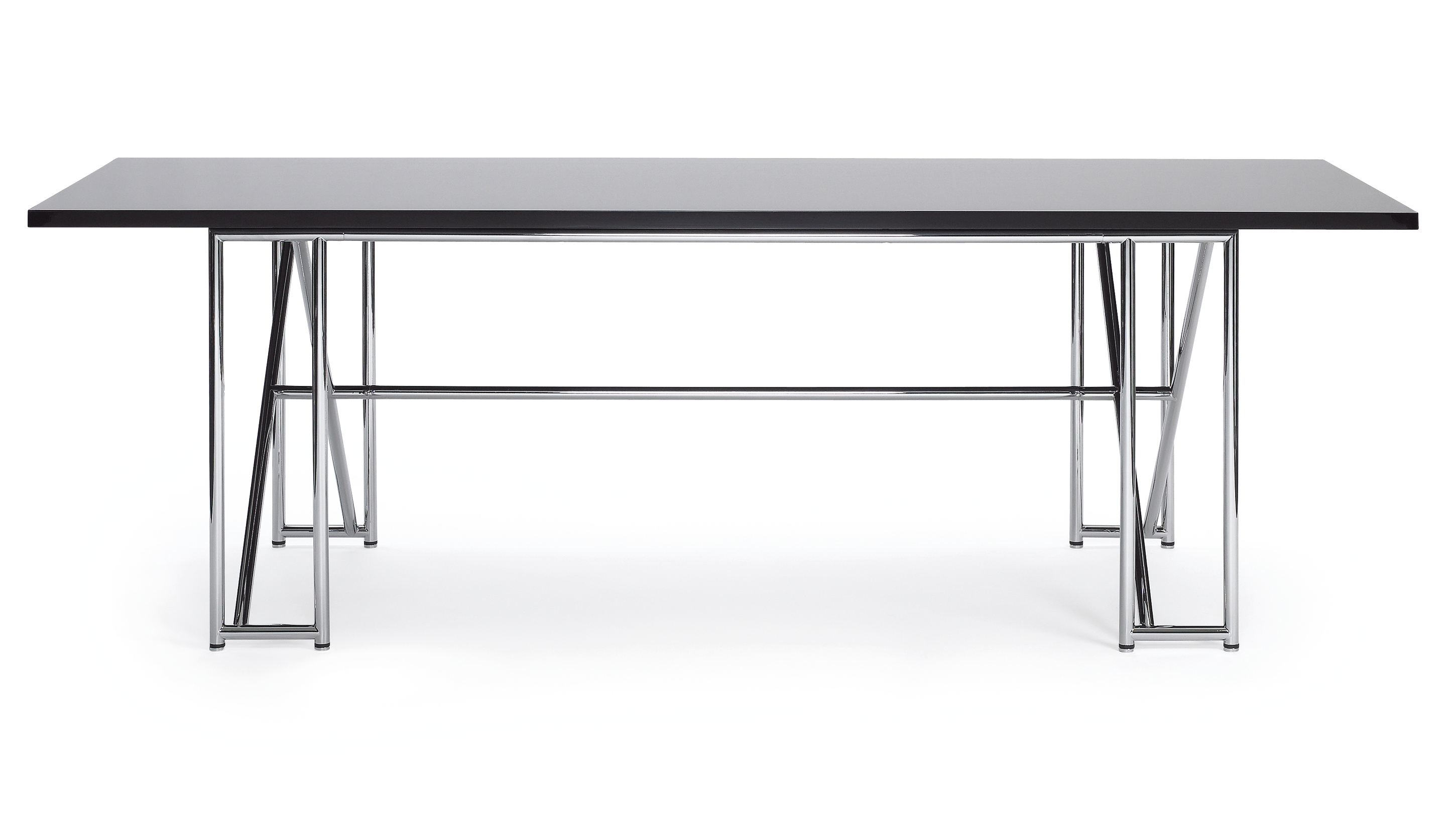 Frame chrome-plated tubular steel. Tabletop MDF real-wood veneered in ash, black lacquered. Or tabletop clear crystal glass. Height-adjustable metal gliders.