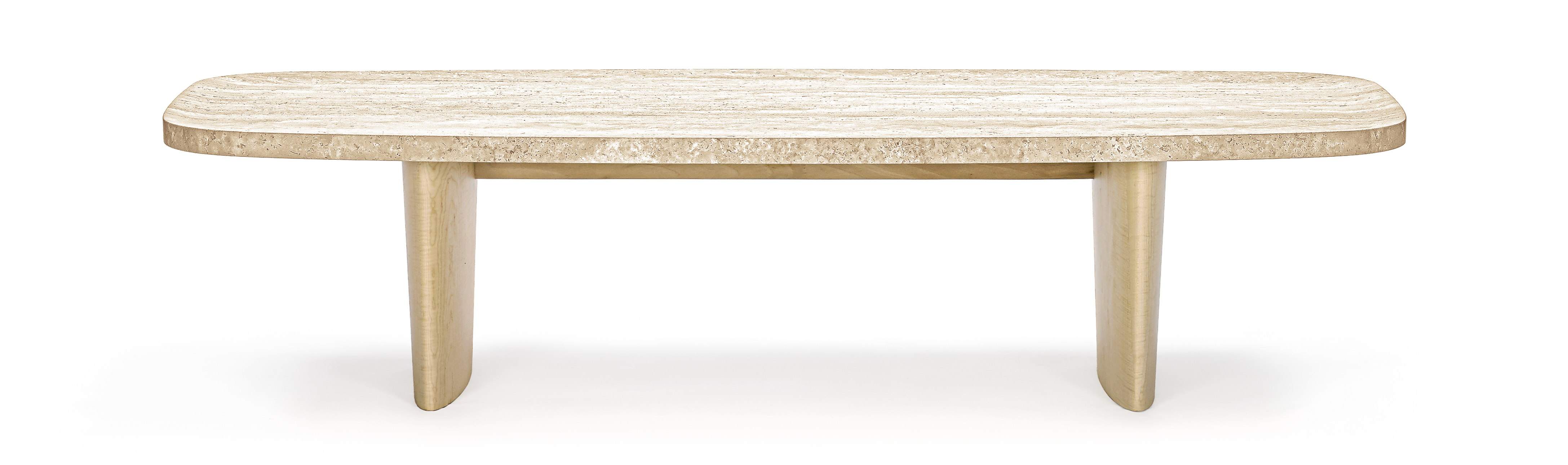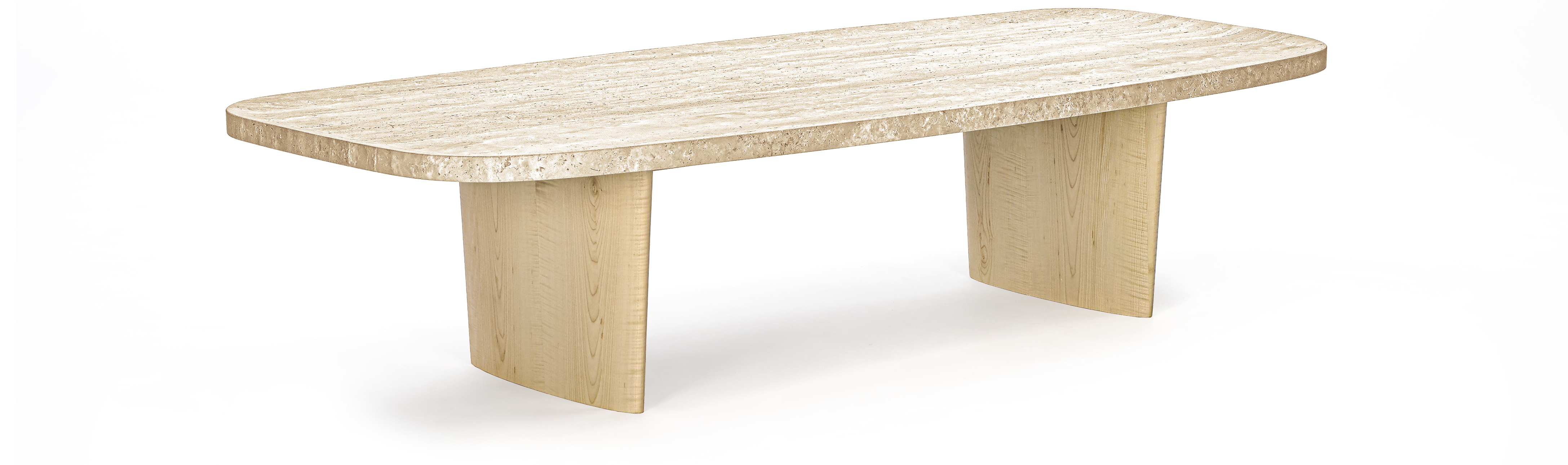 Coffee table. Frame solid ash, natural, with clear varnish. Travertine tabletop, elaborately milled, natural. Tabletop support colour-lacquered metal in light ivory (RAL 1015). Black felt gliders. Available in two more sizes: Matéria Side Table and Matéria Long Table.