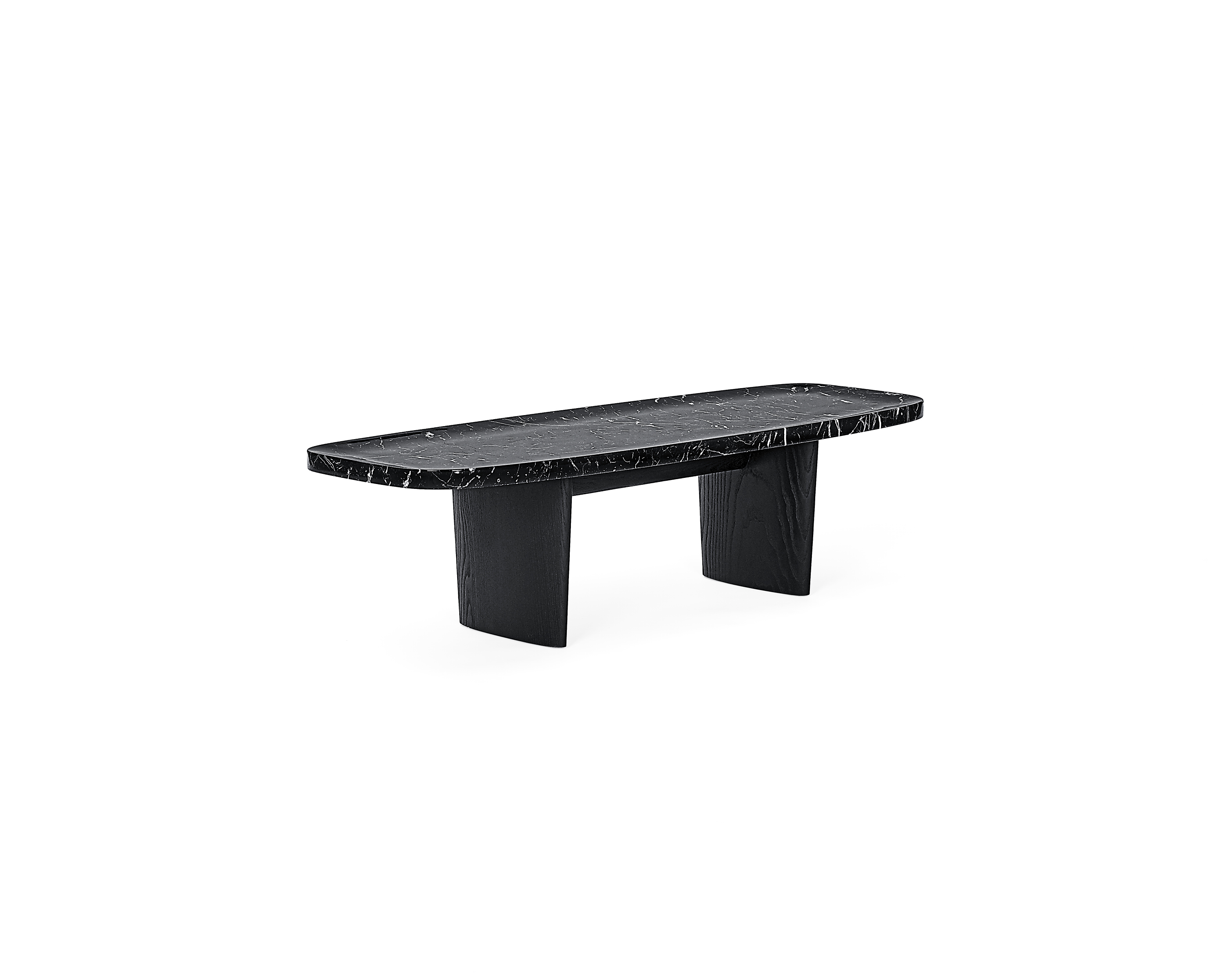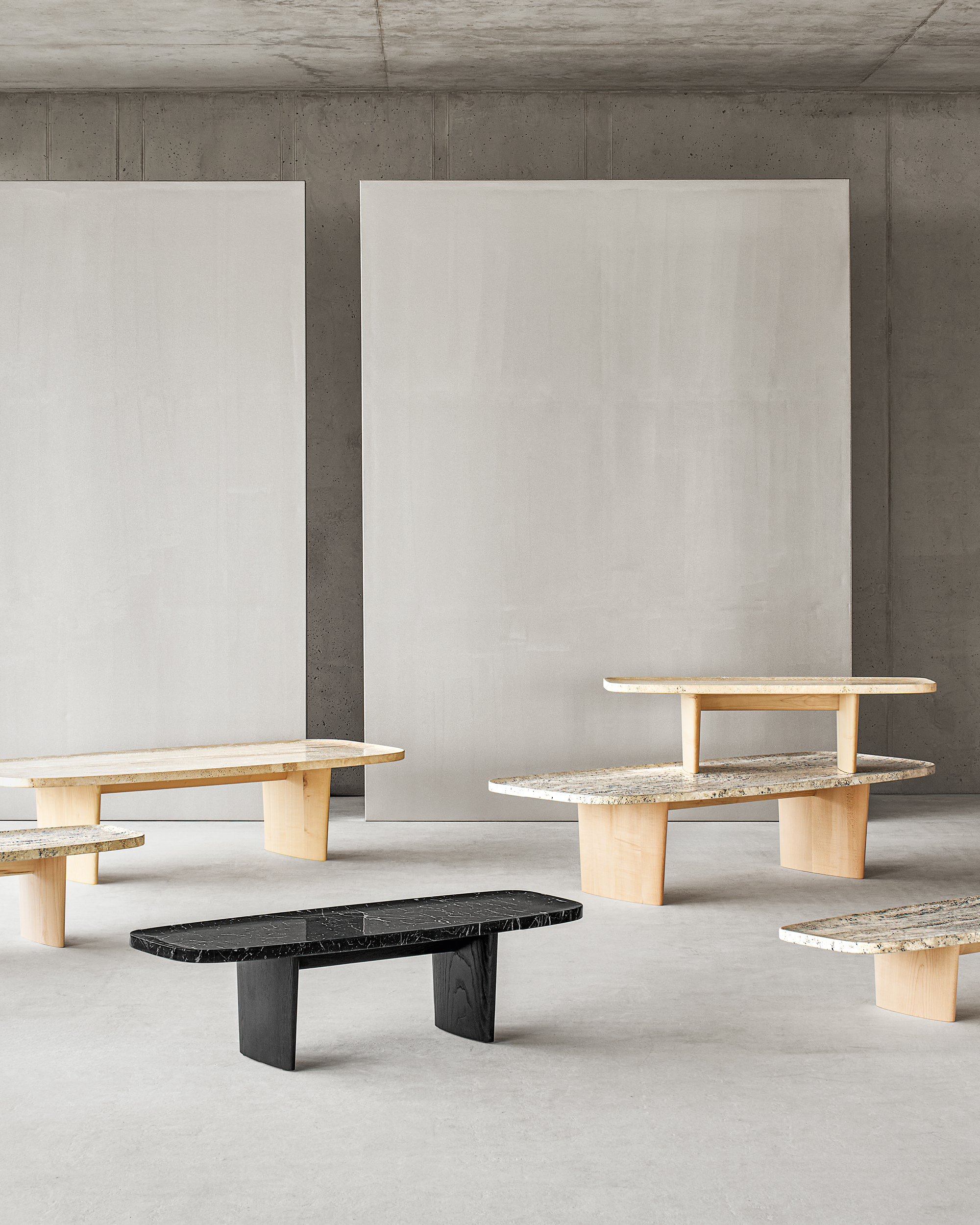The Matéria low board / occasional table series is characterised by its special dimensions and calm aura. The concave, organically shaped tabletop evokes an intuitive desire to stroke its surface and feel its natural texture. What was originally a purely experimental design by German designer Christian Haas has been developed into a trio in collaboration with ClassiCon. Matéria is available in three different sizes and in three different finishes. Individually or in combination, these handcrafted low boards are characterised by their materiality and demonstrate how sensuous a minimalist approach can be. In addition to the versions made of natural or indigo-stained, open-pored travertine in combination with light ash wood, the series is also available in a deep black version with a tabletop made of high-quality Nero Marquina marble and a frame made of black lacquered ash wood. The black marble version has the presence and constancy of a sculpture and exudes a luxurious flair. The natural marbling of the high-sheen, impregnated natural stone makes each piece unique. Both versions of Matéria – travertine or marble – are captivating in their own unique way with their incomparable, natural look, which is reminiscent of an abstract painting.