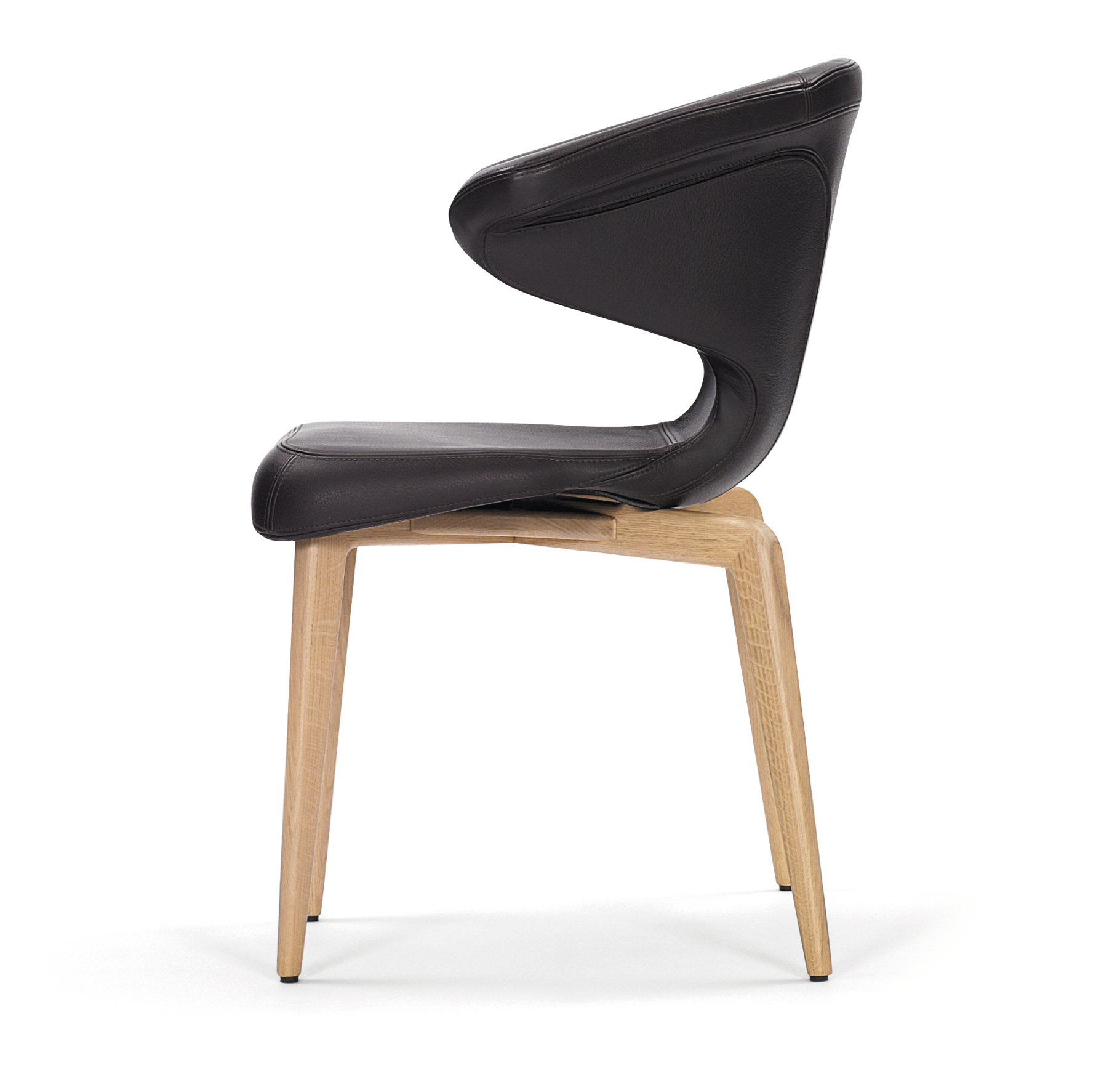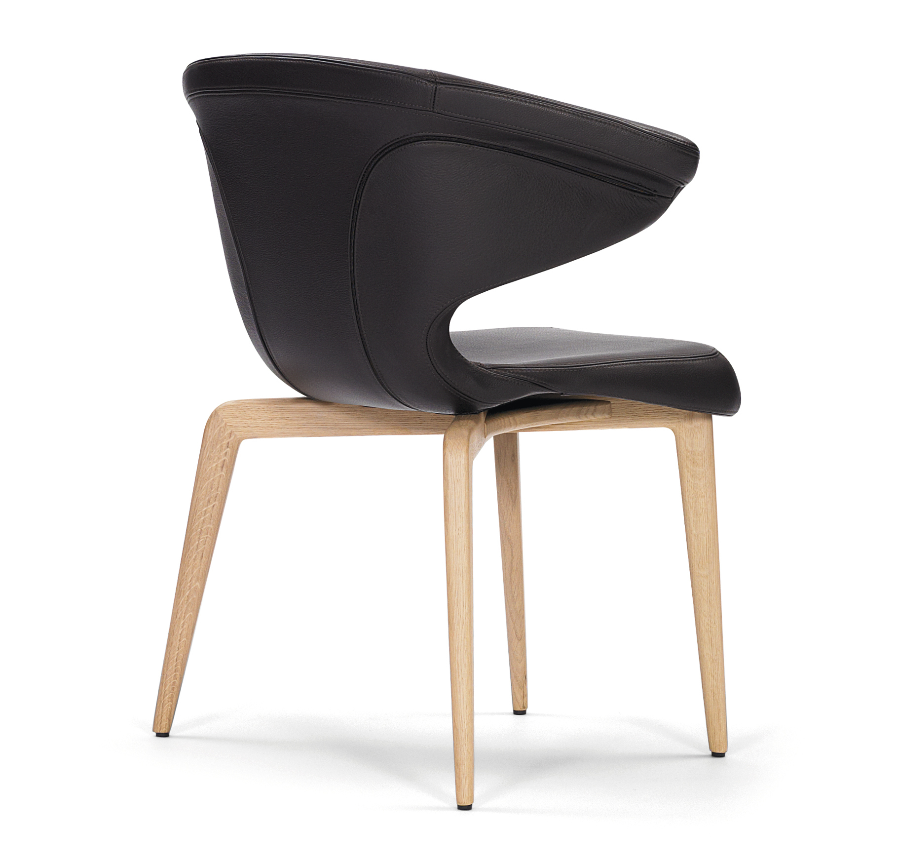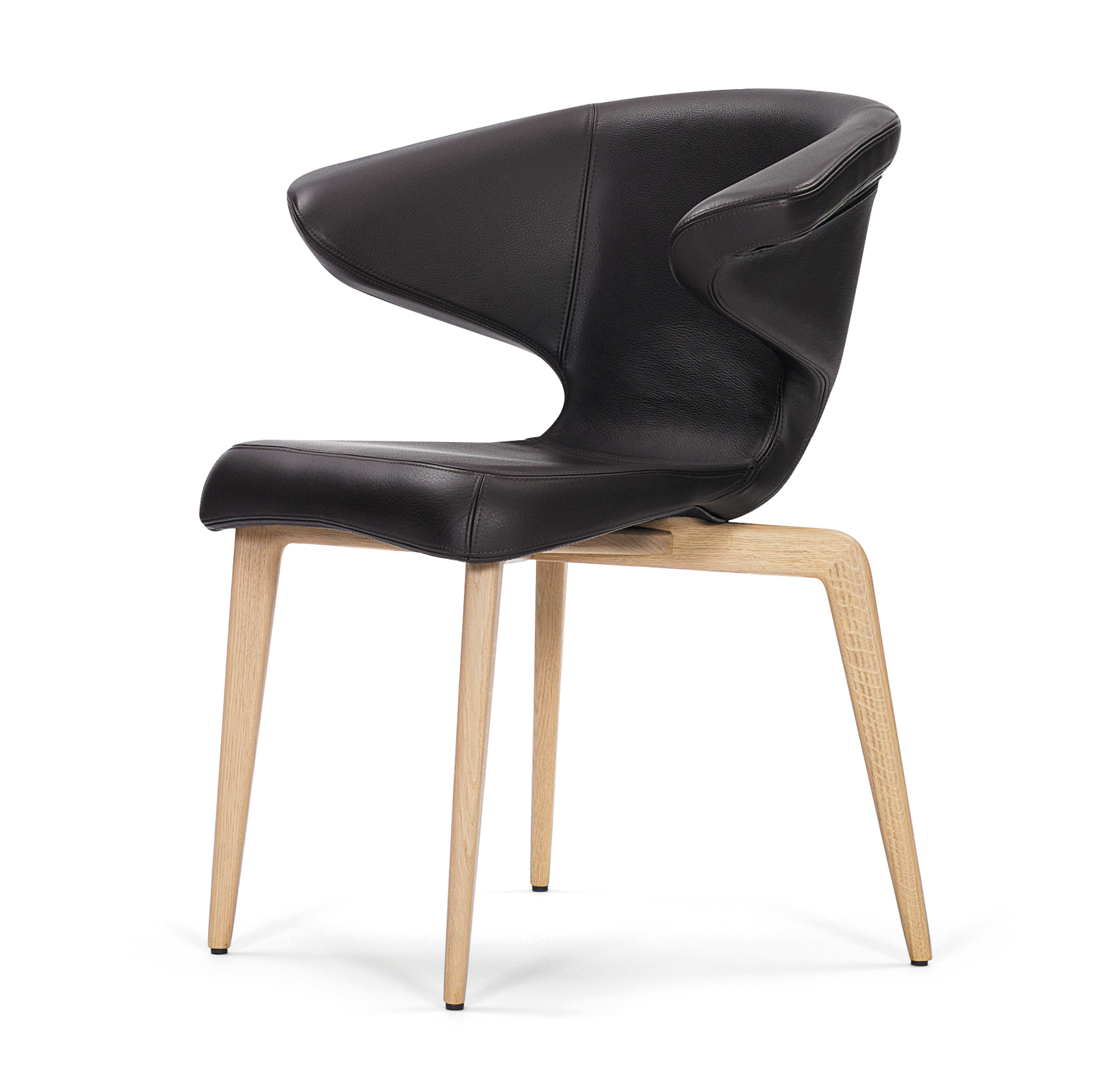 Frame solid oak or walnut, with clear varnish or black lacquered. Seat frame tubular steel. Upholstery polyurethane with polyester fibre. Cover in fabric or leather. Contrast stitching exclusively for premium leather. Replaceable gliders in felt or plastic.