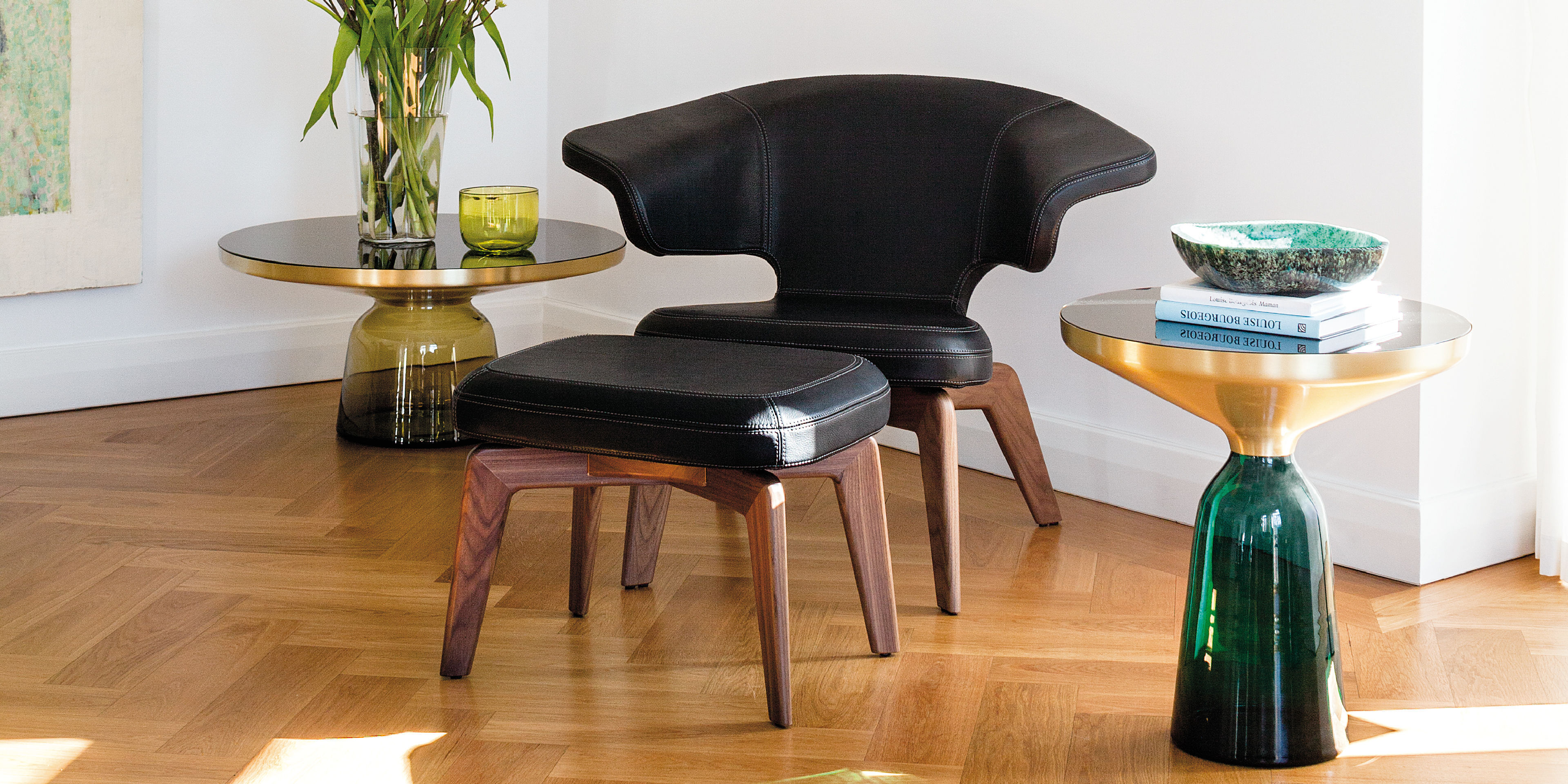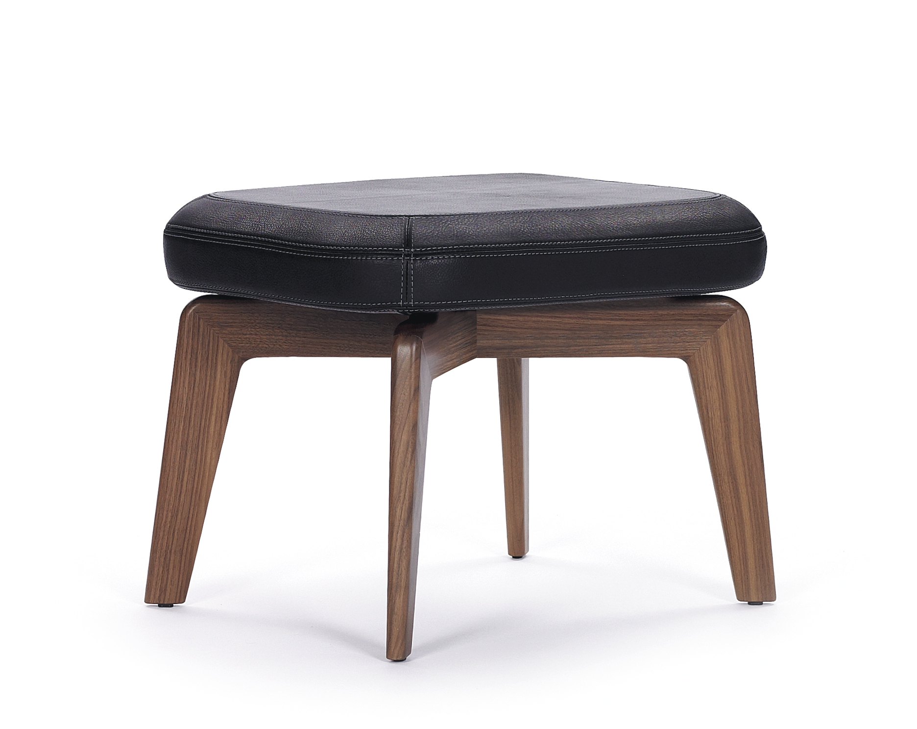 Frame solid oak or walnut, with clear varnish or black lacquered. Upholstery polyurethane with polyester fibre. Cover in fabric or leather. Contrast stitching exclusively for premium leather. Replaceable gliders in felt or plastic.
