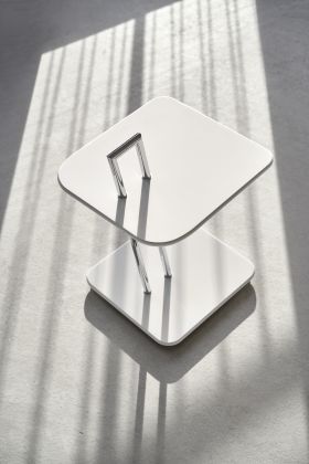 Side table. Base chrome-plated tubular steel. Tabletop round or rectangular MDF high-gloss lacquered in black, grey, white or Chinese red. Plastic gliders in grey.