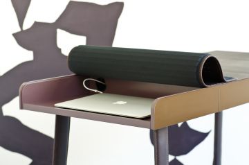 The Pegasus Home Desk is a small, ingeniously conceived home workplace that provides space for the digital devices that have long since become part of our everyday lives. A well-designed workplace solution is conjoined here with the elegance of a perfectly crafted piece of domestic furniture. The thick bend-leather tabletop can be rolled or folded upward as needed to access the intelligently arranged compartments below. Here there is space for a laptop, tablet PC, mobile phone, paper, charging stations, power supply or other accessories.