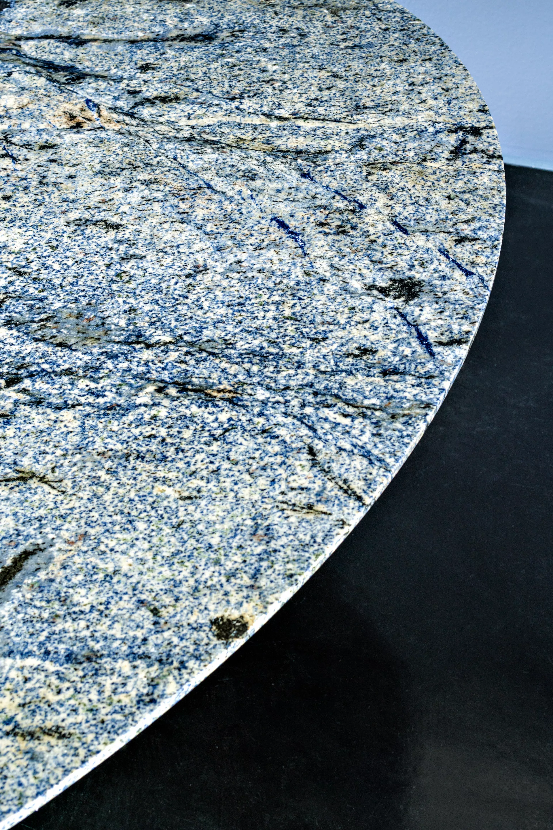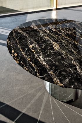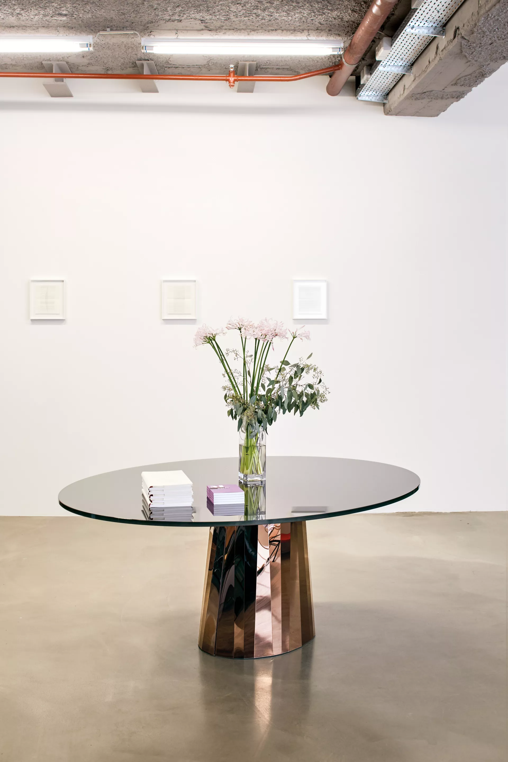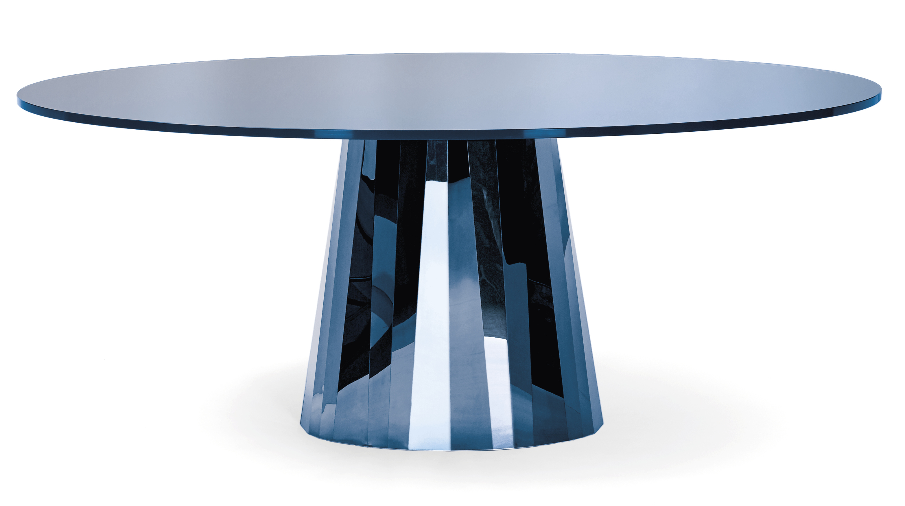 Table. Base folded high-gloss polished stainless sheet steel, in various colours, tinted with a special method. Oval tabletop crystal glass, underside colour-lacquered or oval marble tabletop in various versions, polished and impregnated. Height-adjustable felt gliders in grey.