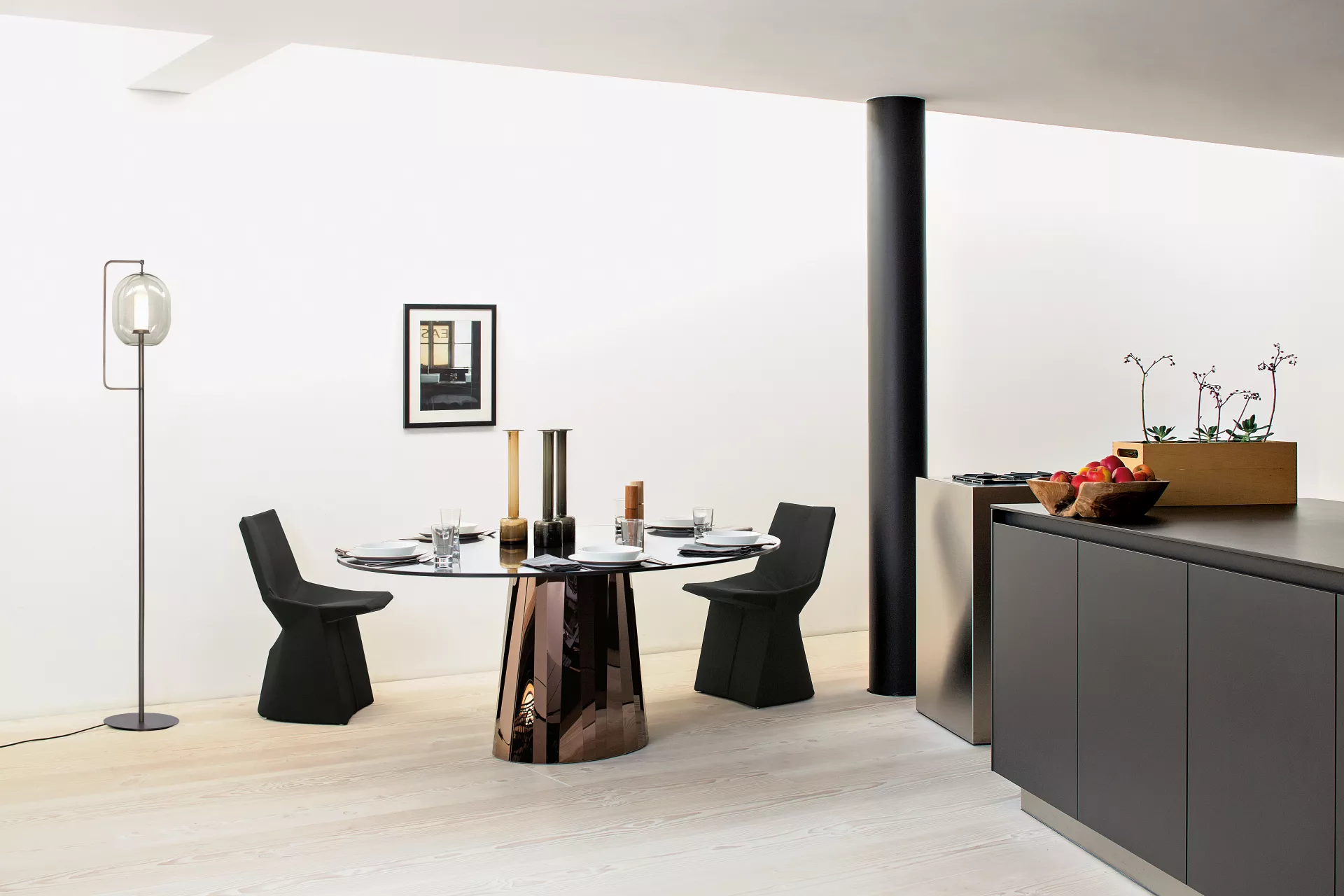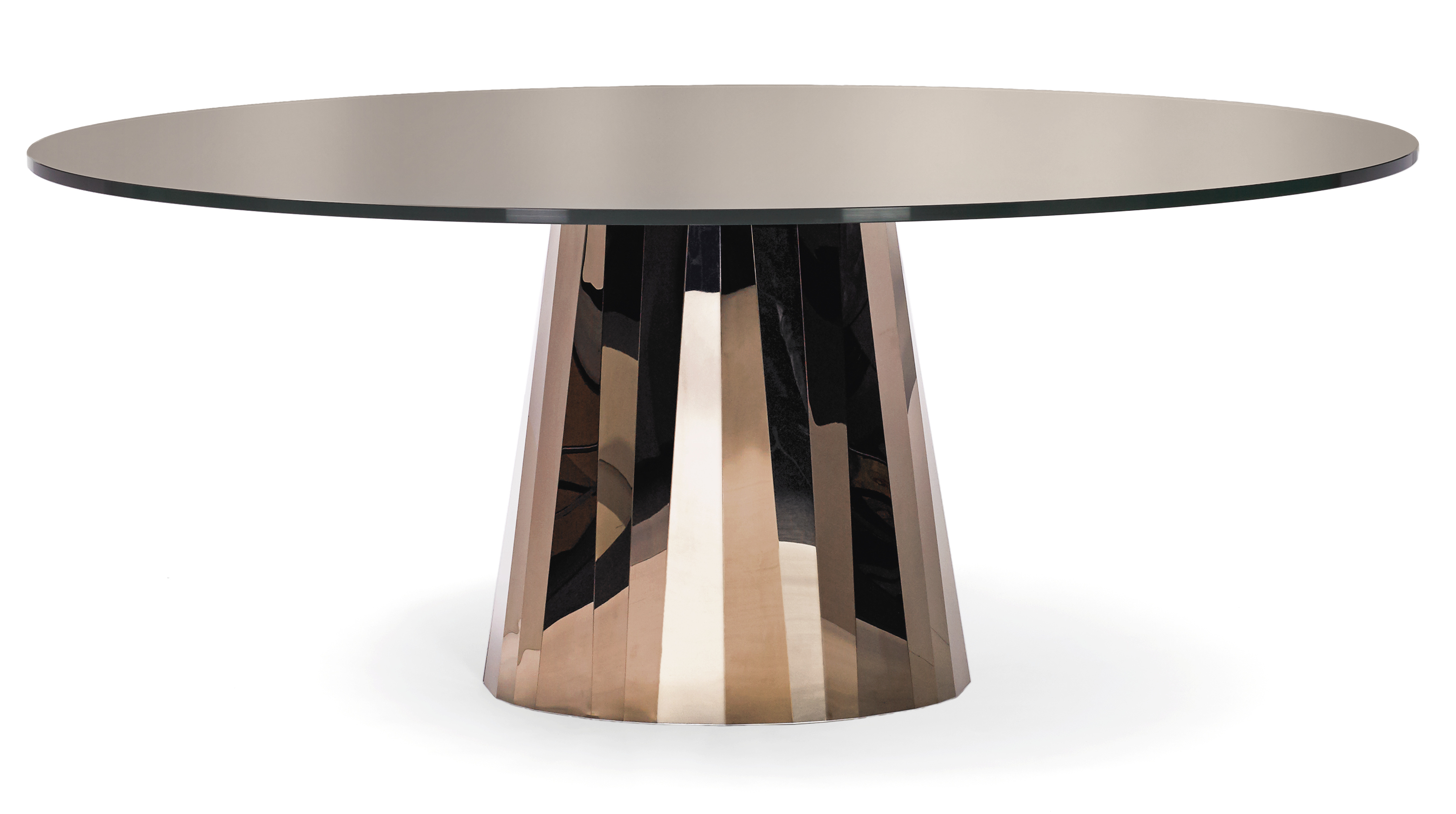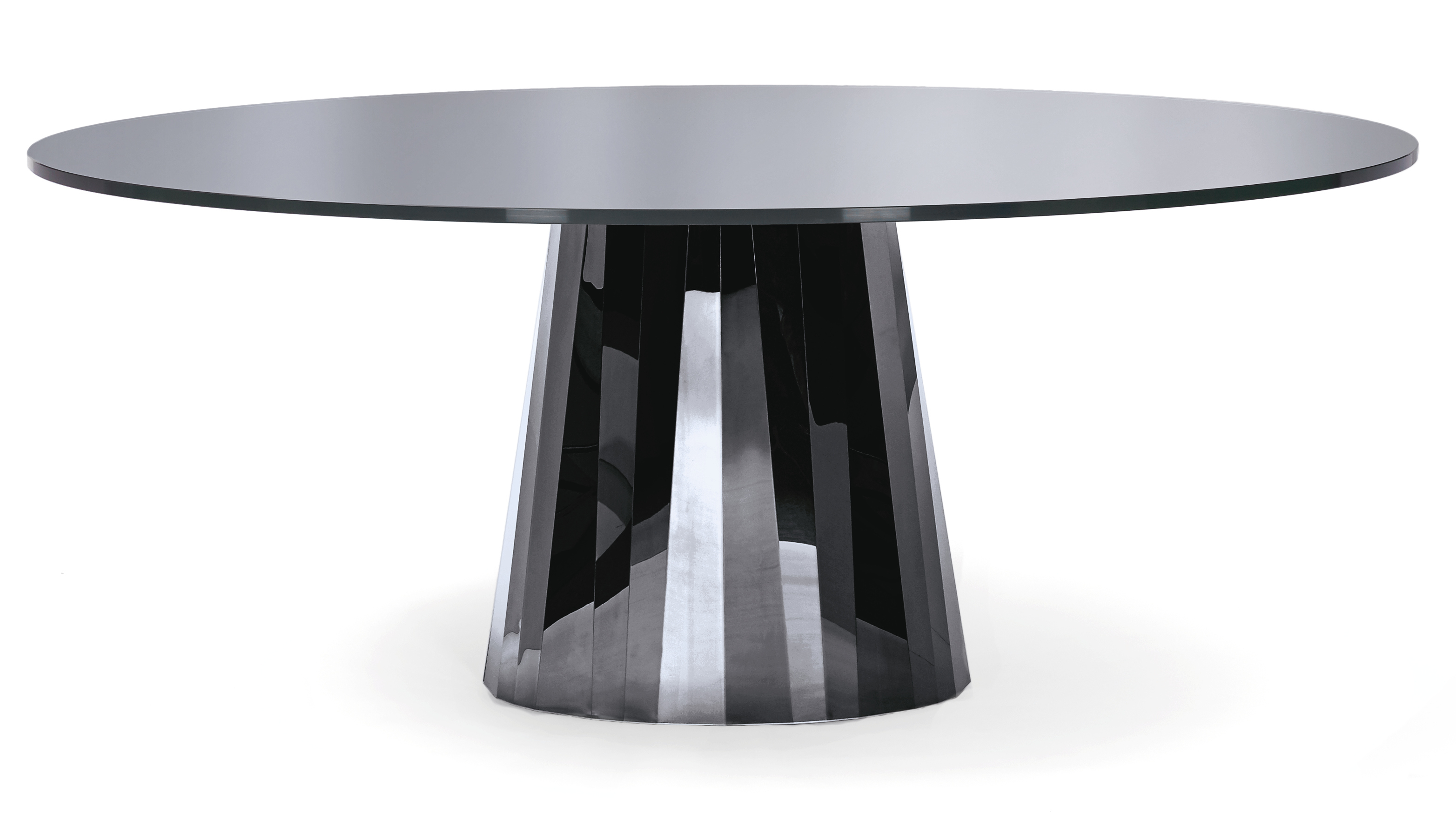 With the Pli table series French designer Victoria Wilmotte brings objects of unusual crystalline elegance and astonishing geometry to living environments, dining rooms or entrance areas. The bends and folds that gave Pli its name almost make the stainless steel base look like an oversized finely polished precious stone. The table’s oval forms of the base and tabletop establish an attractive contrast with the facets of the base, which create a fascinating play with light friction and colour reflections in the room. The Pli Table can be used as a representative dining table for up to eight persons. In the entrée or foyer, galleries and stores the table can also be used as a spectacular eye-catcher.