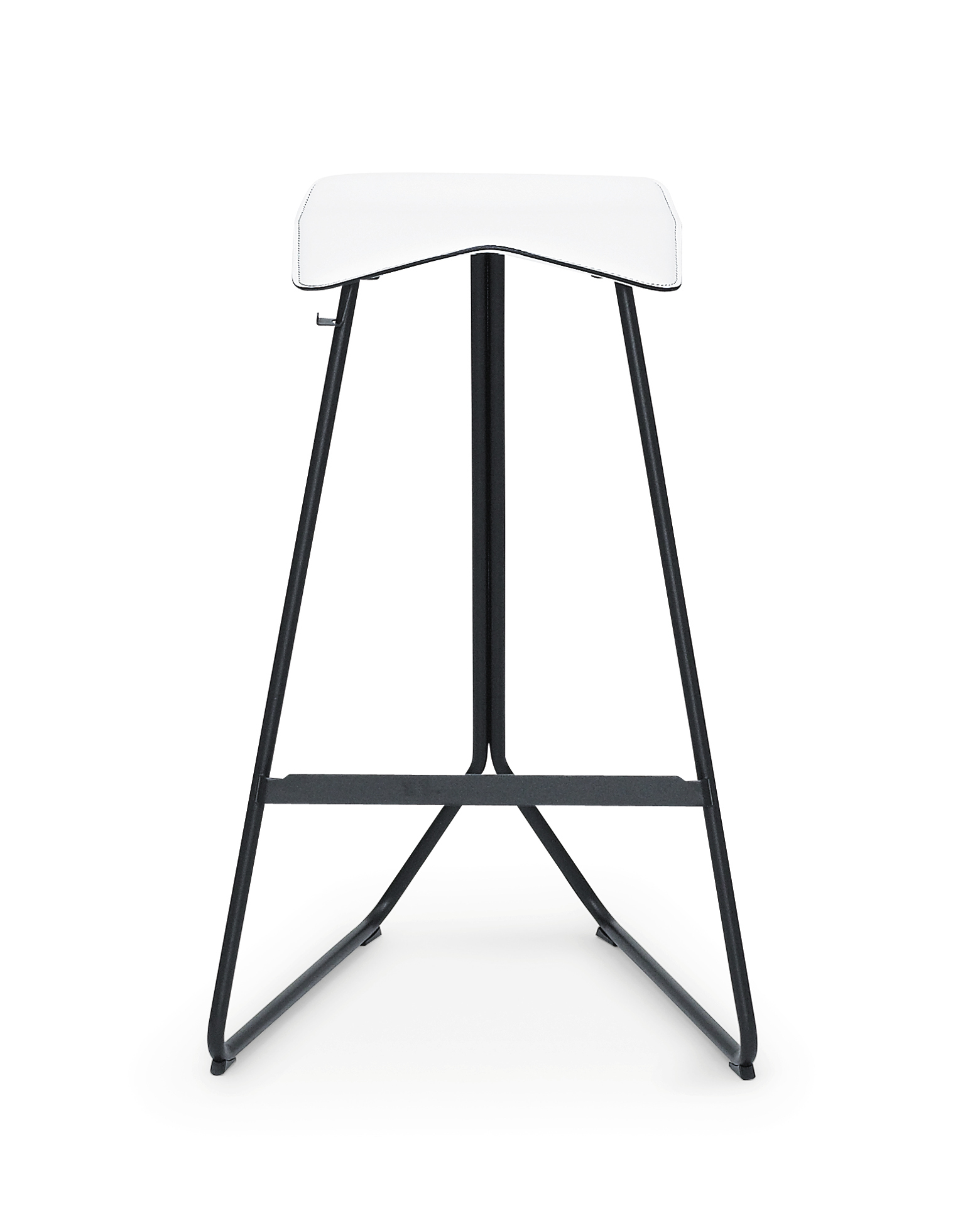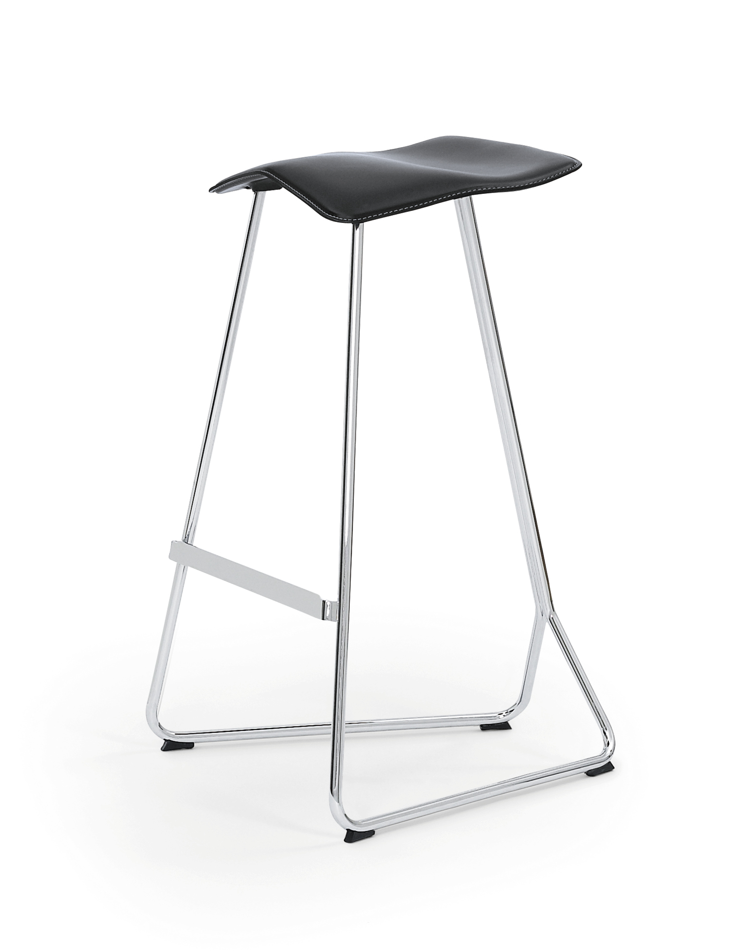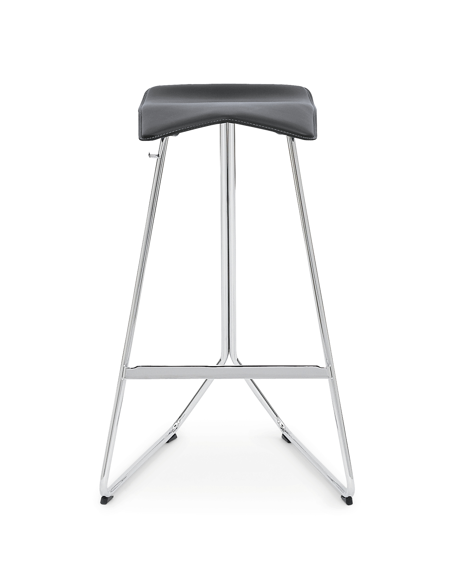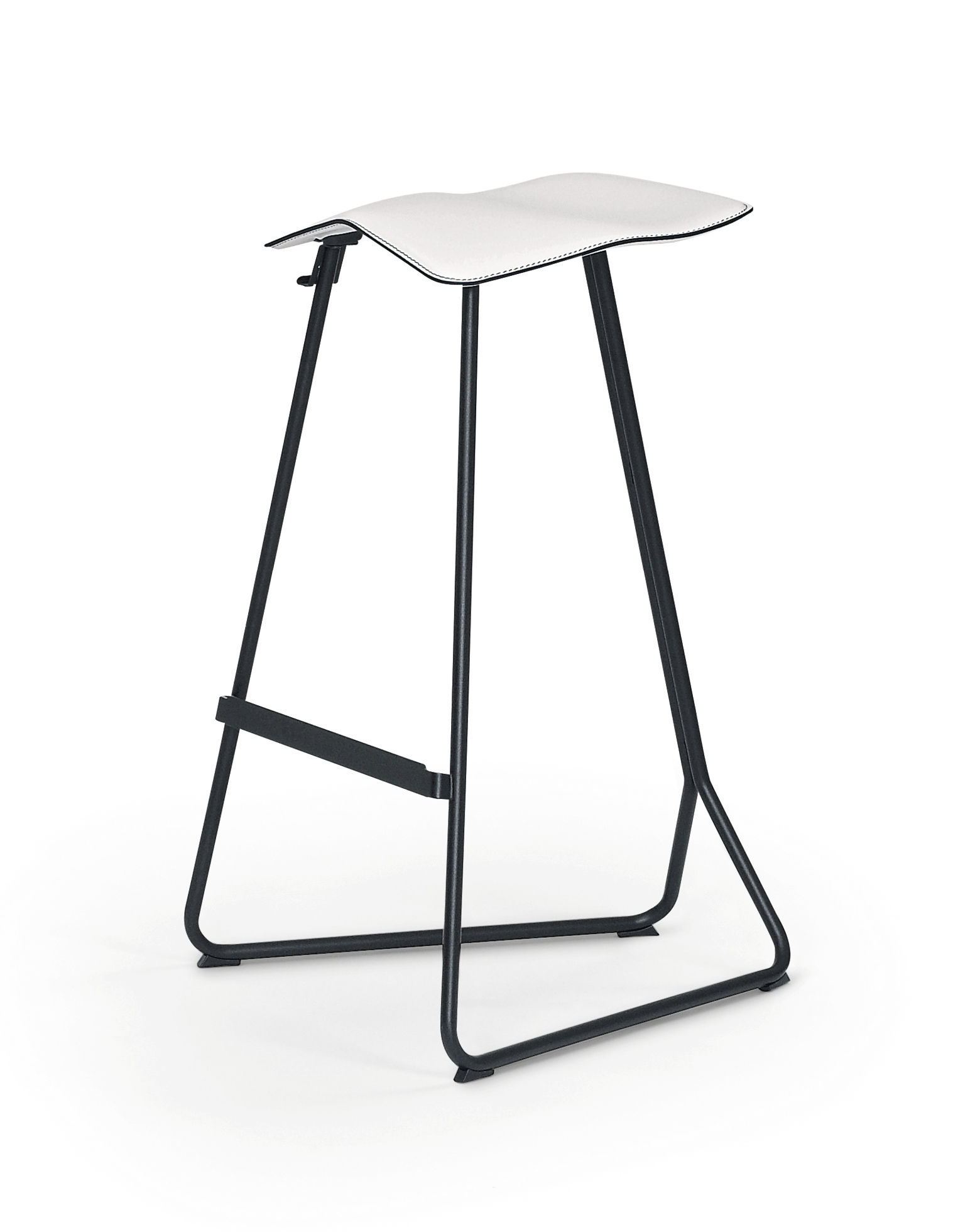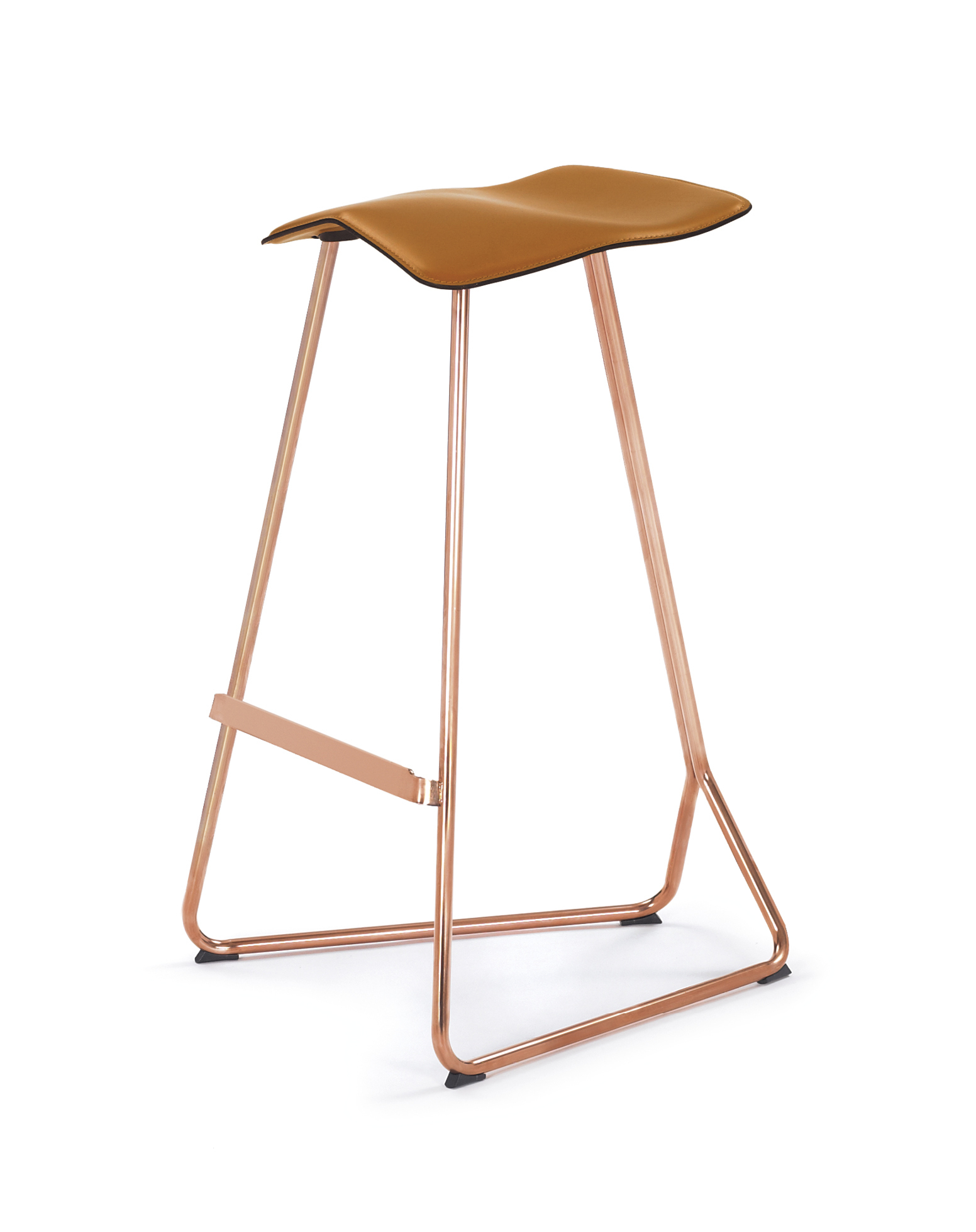 Stool. Frame tubular steel, powder-coated with fine texture in black or chrome-plated or copper-plated, with clear varnish. Seat polyurethane, colour-lacquered, or covered in bend leather. Hook for bag in frame colour. Plastic gliders in black.