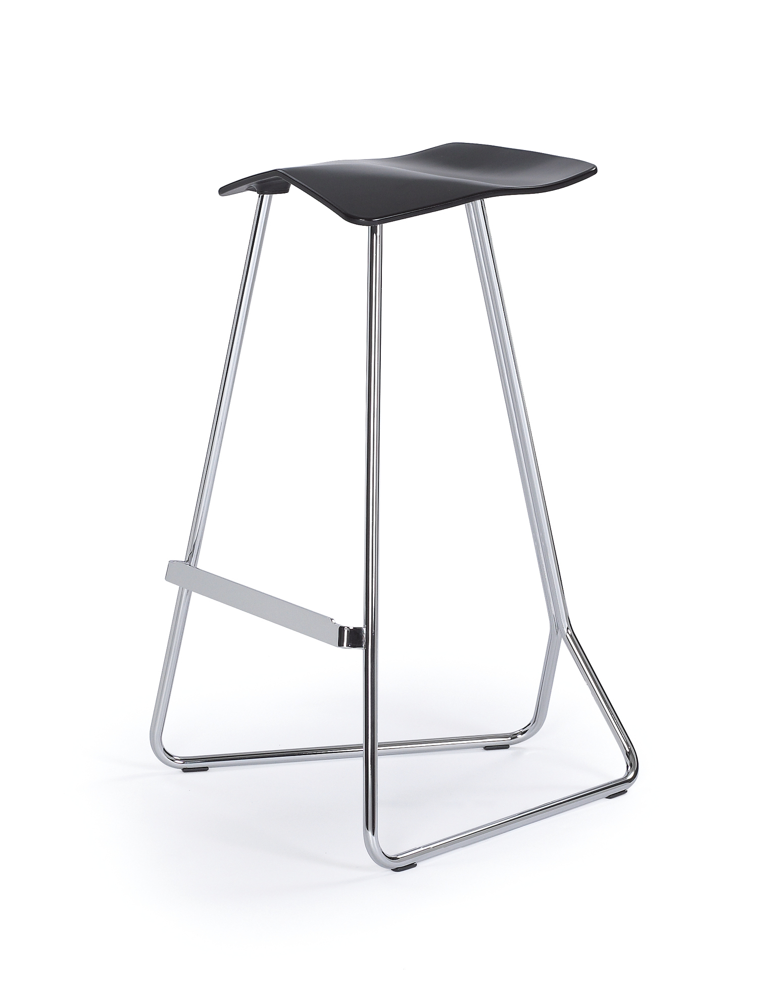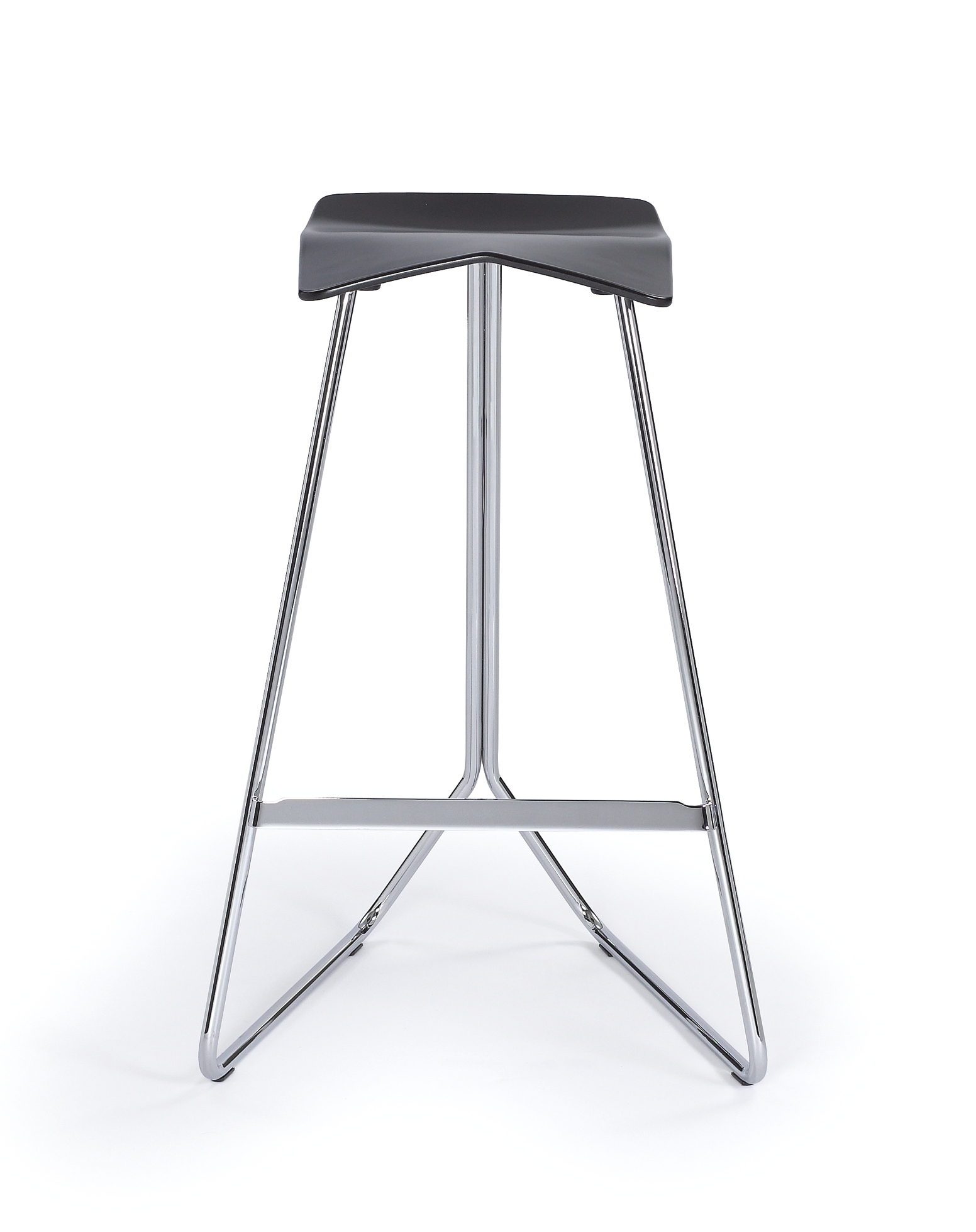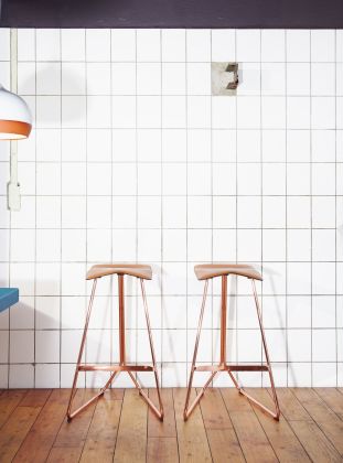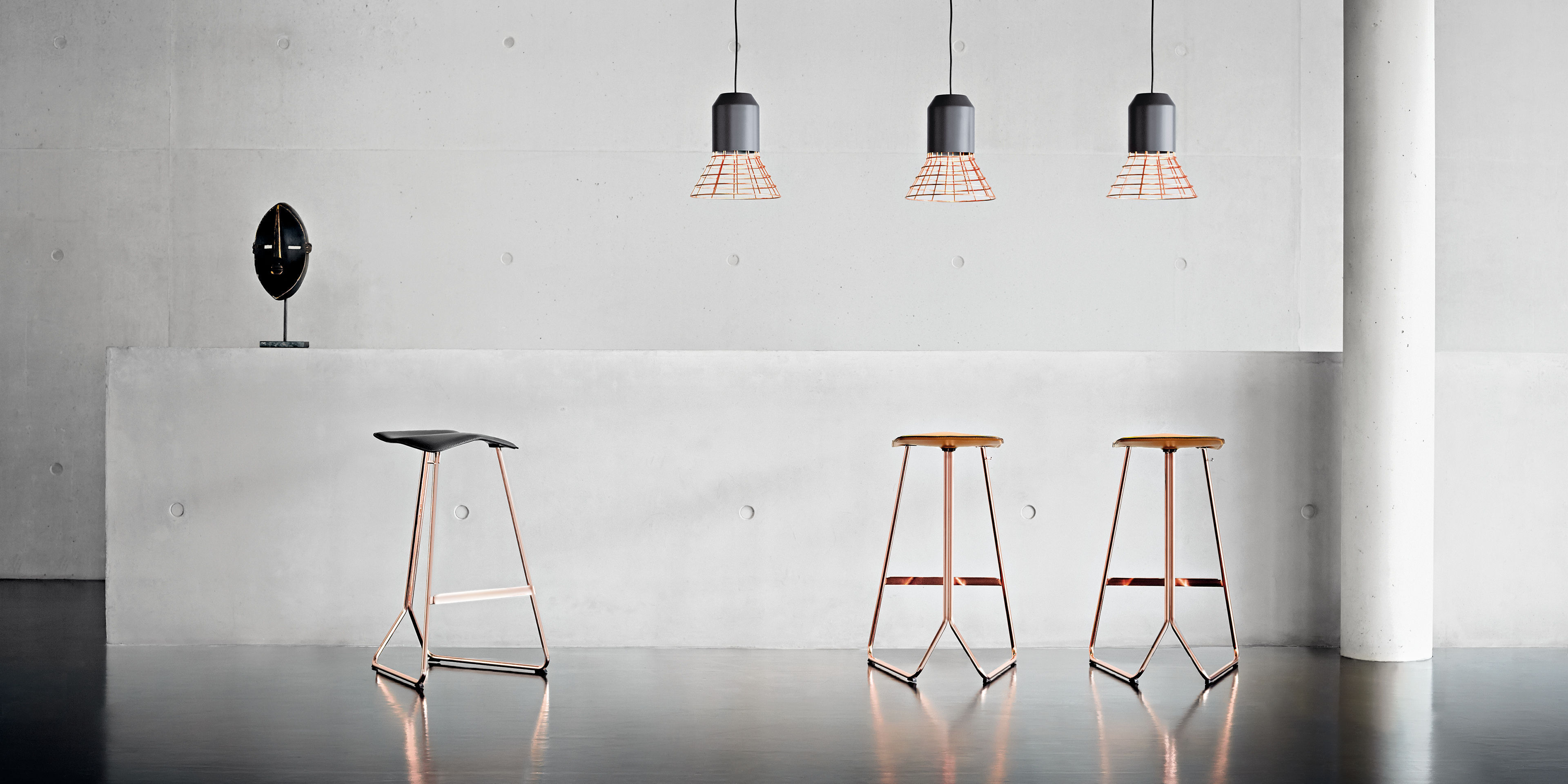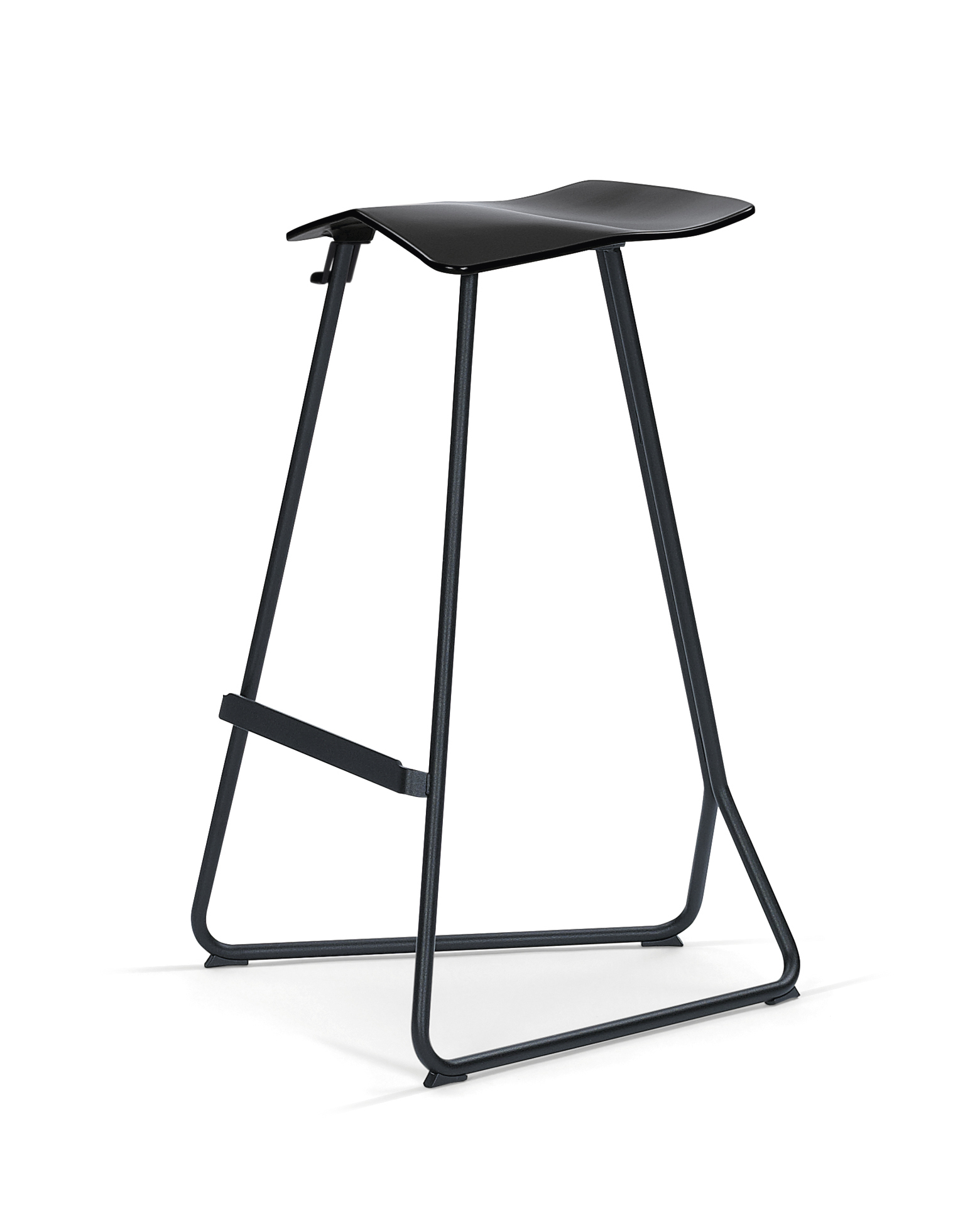 Stool. Frame tubular steel, powder-coated with fine texture in black or chrome-plated or copper-plated, with clear varnish. Seat polyurethane, colour-lacquered, or covered in bend leather. Hook for bag in frame colour. Plastic gliders in black.