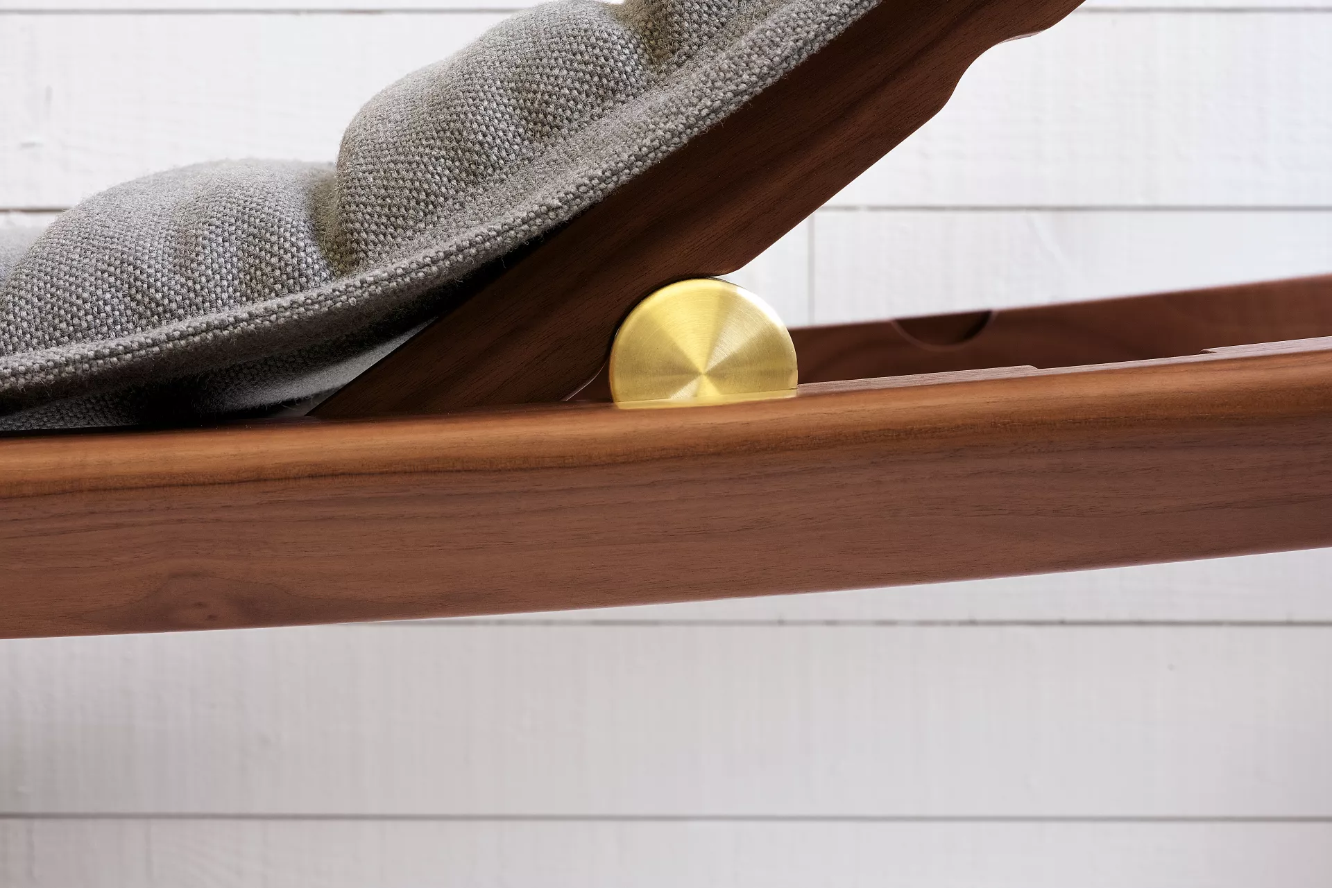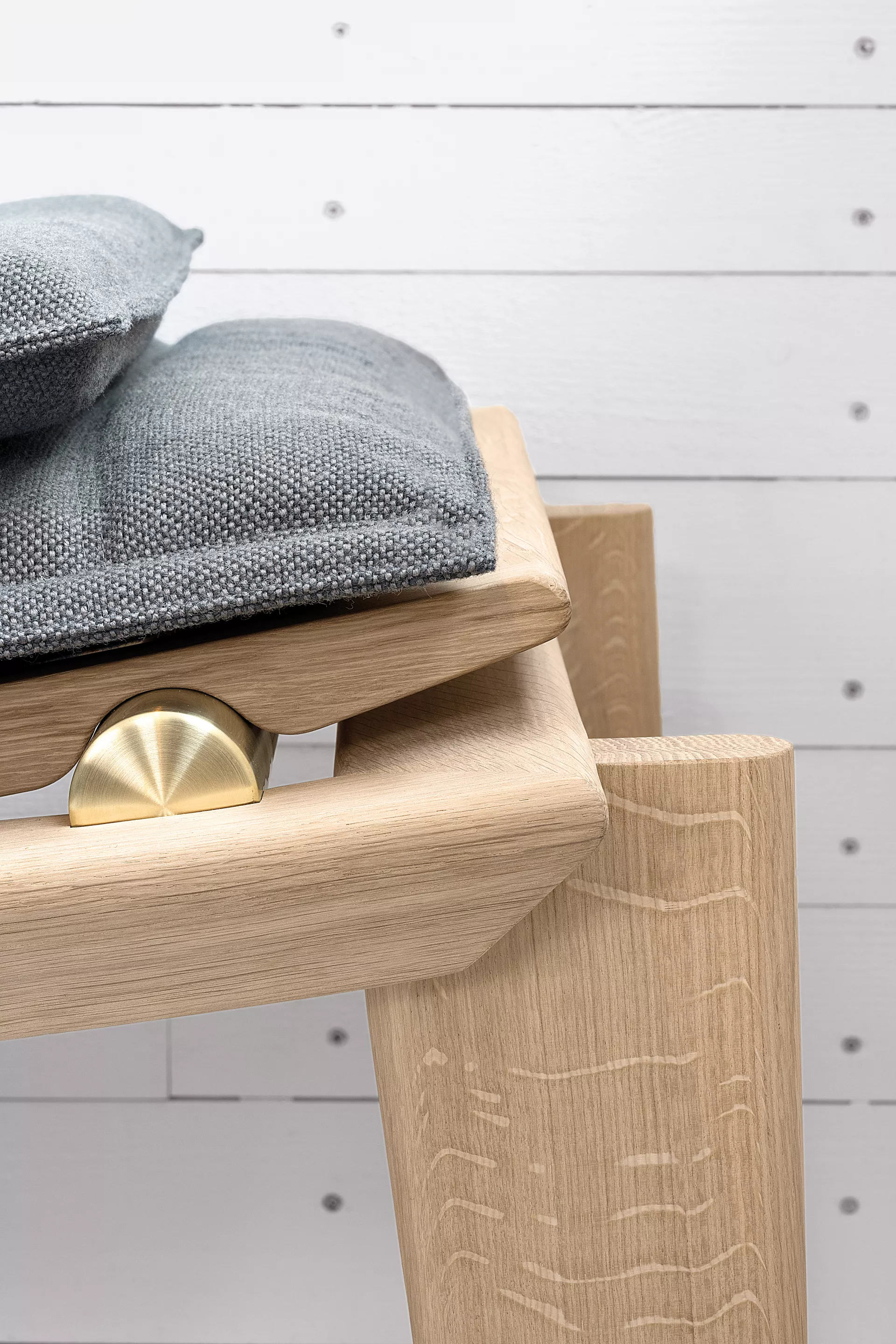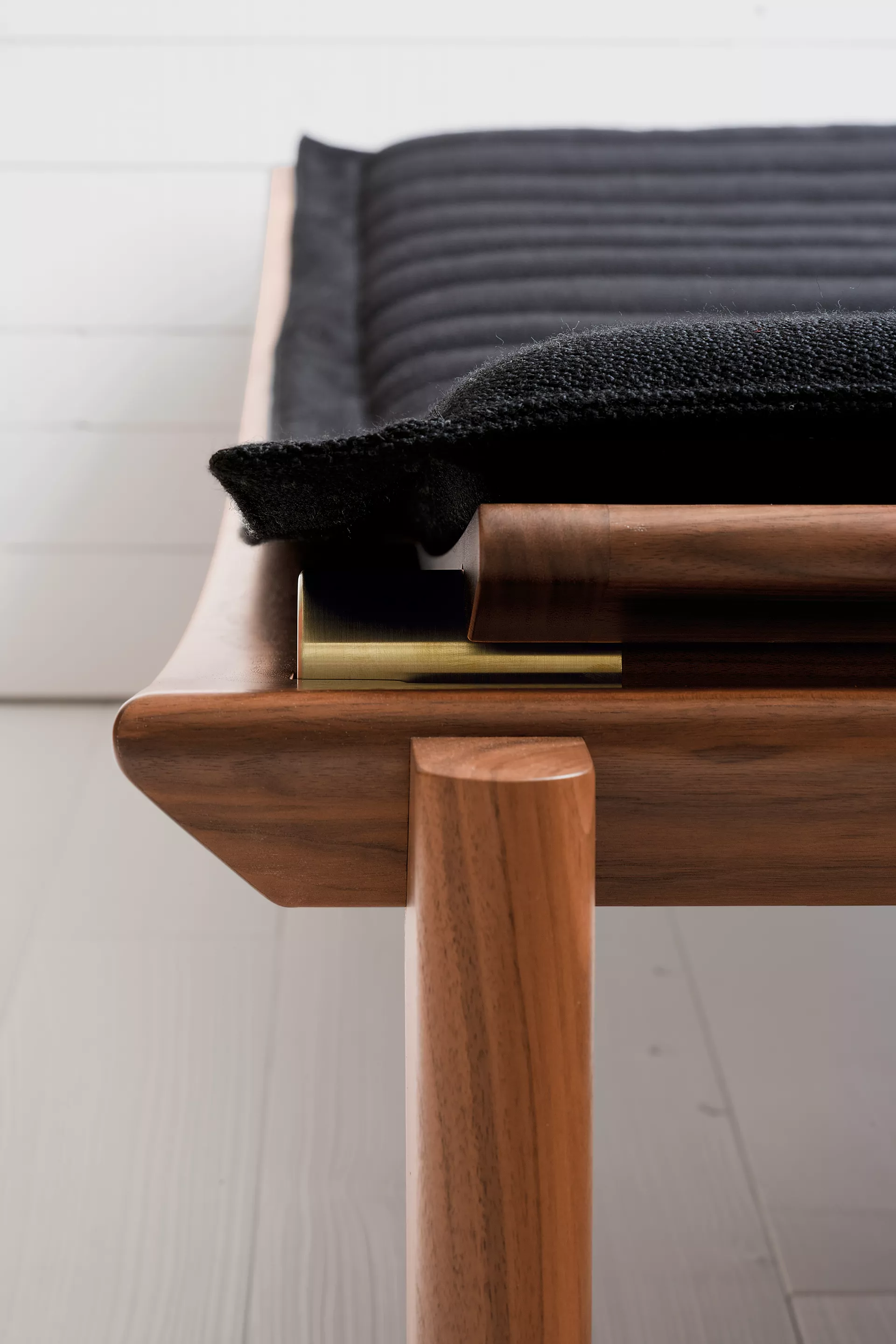 Frame solid oak or walnut, with clear varnish or black lacquered. Metal components solid brass, unvarnished or black chrome-plated. Loose neck pillow and upholstered cushion polyurethane with polyester fibre. Cover in fabric or leather. Cushion can be fixed in head and foot area with push buttons. Headboard height-adjustable at three settings. Anti-slip plastic gliders in white.